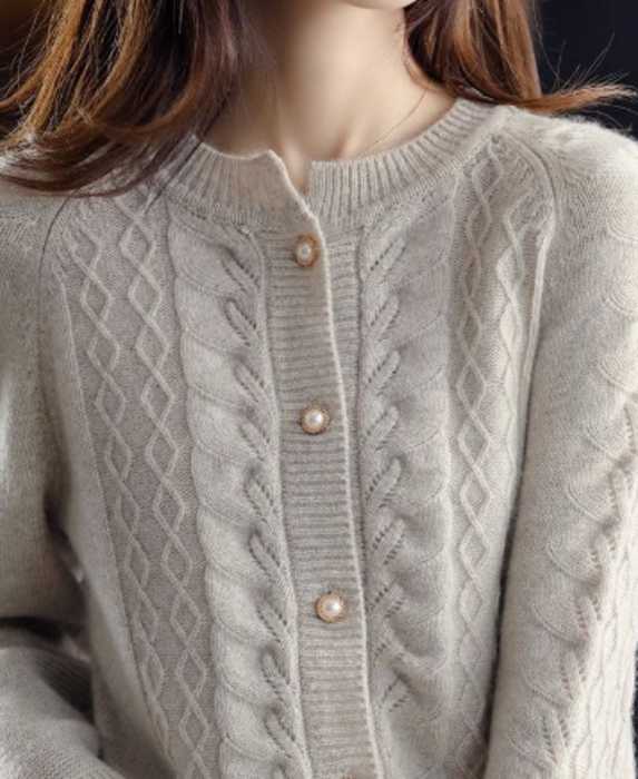 このニットカーディガンは、繊細なケーブル編みが特徴的な一着です。