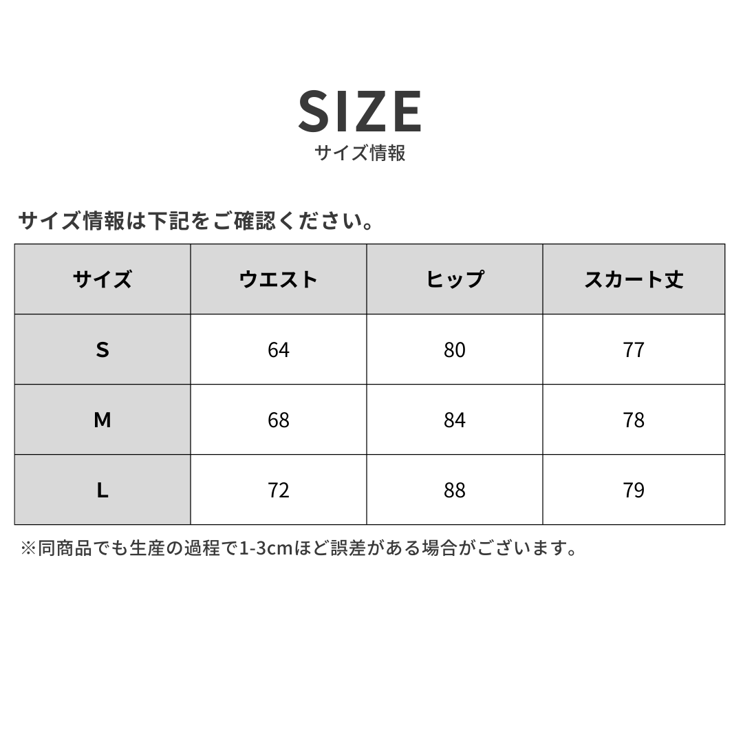-10%S:ウエスト64cm ヒップ80cm スカート丈77cm M:ウエスト68cm ヒップ84cm スカート丈78cm L:ウエスト72cm ヒップ88cm スカート丈79cm