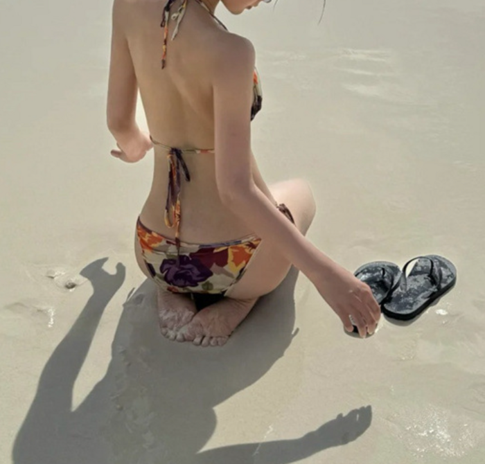 骨格ストレートさんにおすすめなのは、華やかな柄×コンパクトデザインの組み合わせ。タイサイドで腰まわりを軽やかに、トップはシンプルな三角カットで上半身をコンパクトに見せてくれます。バカンス映えも◎。