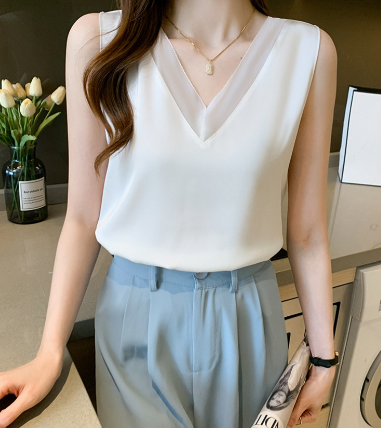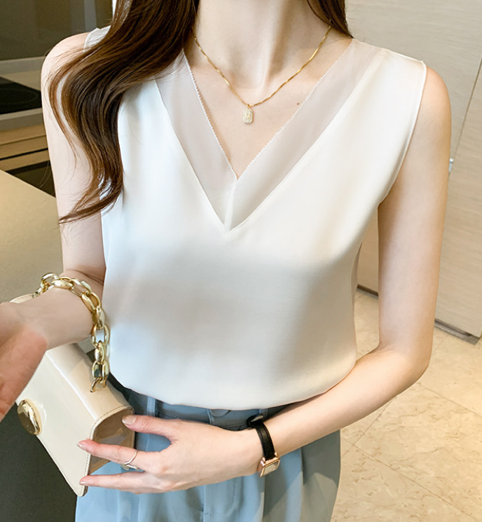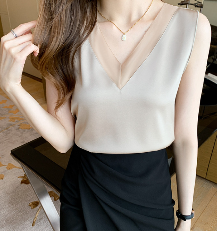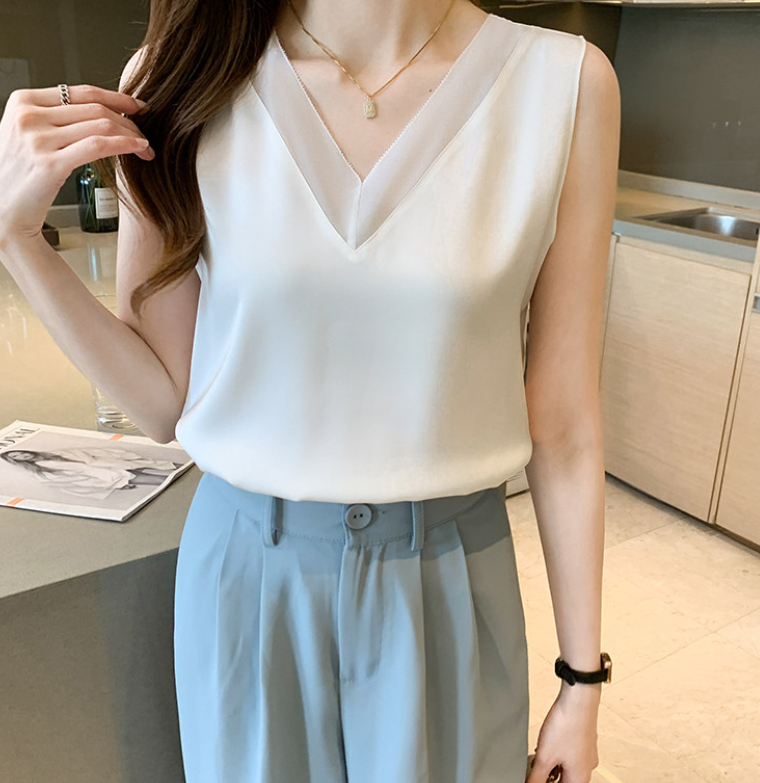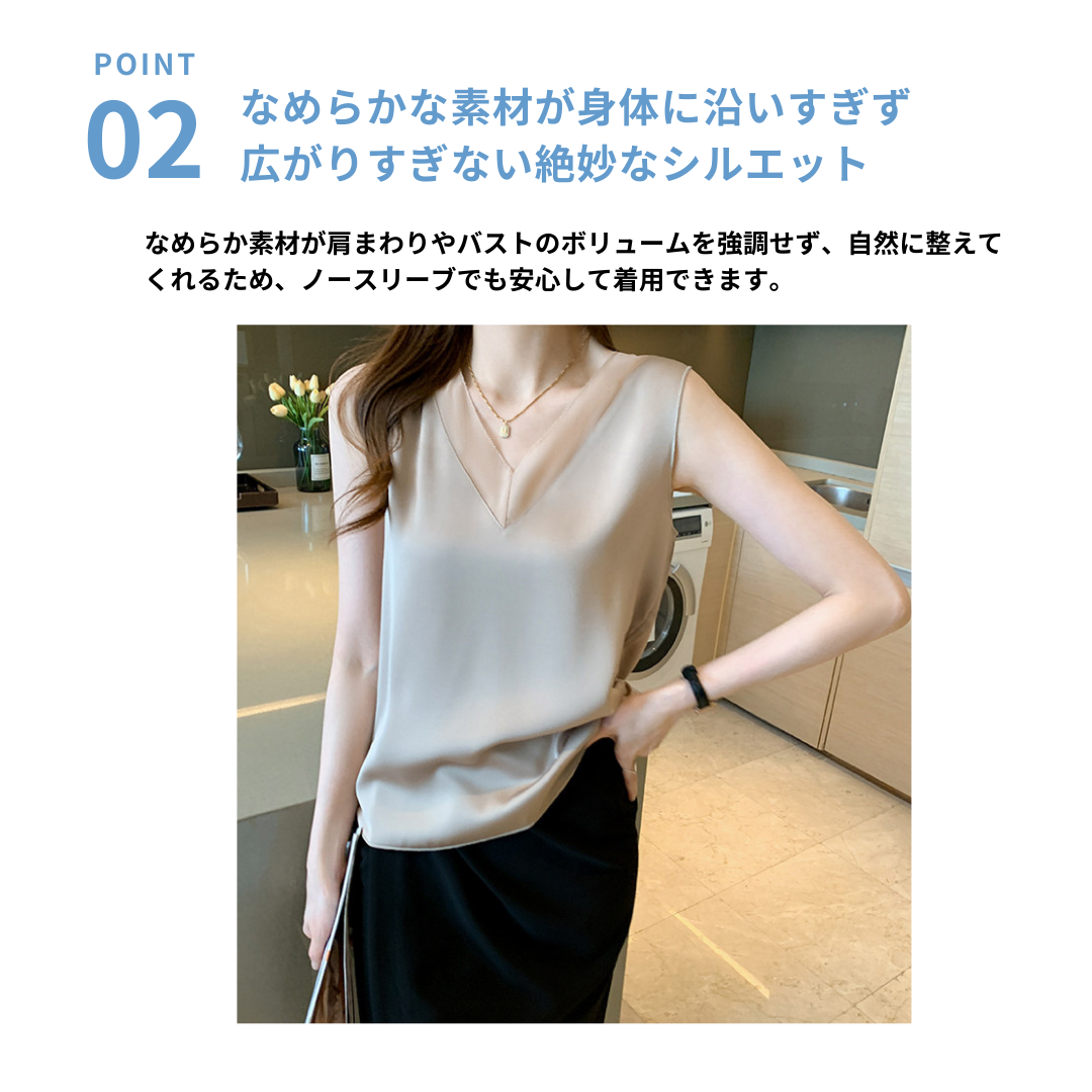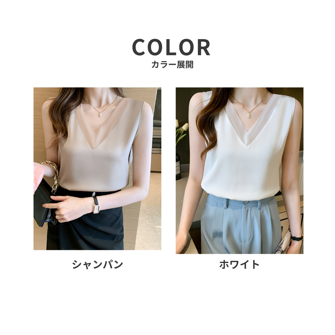 大きめのVネックラインと、透け感が色っぽいノースリーブ。