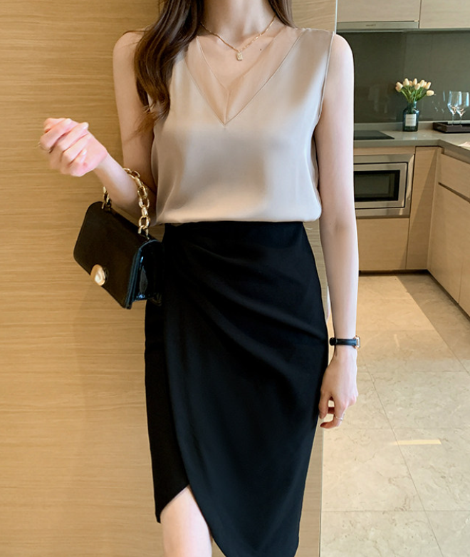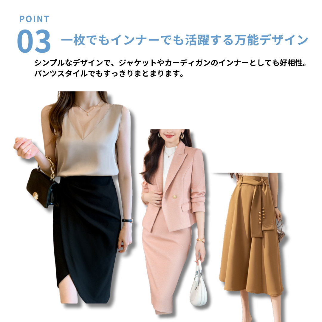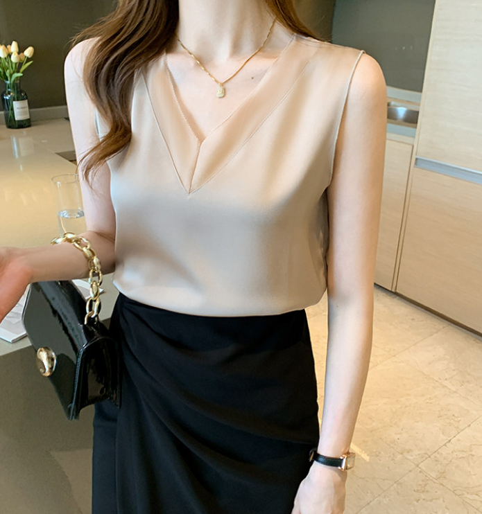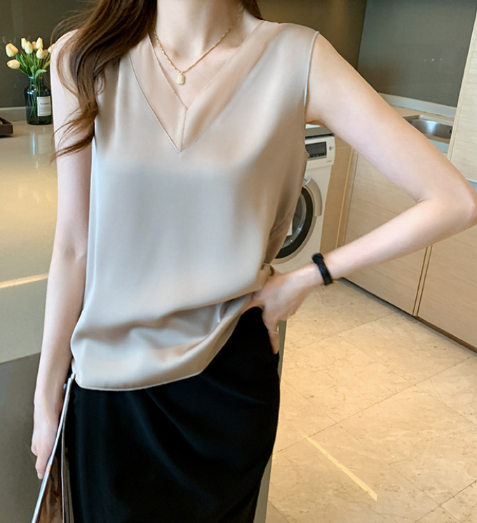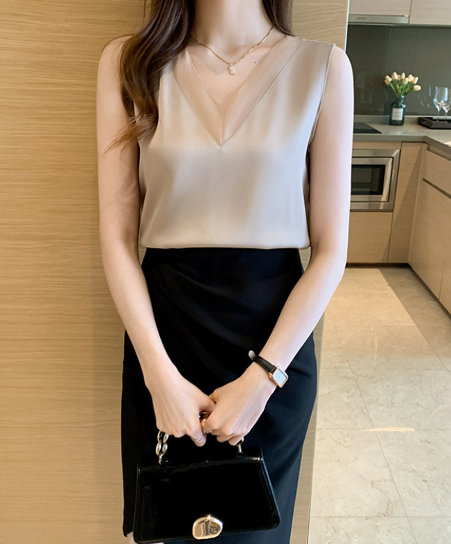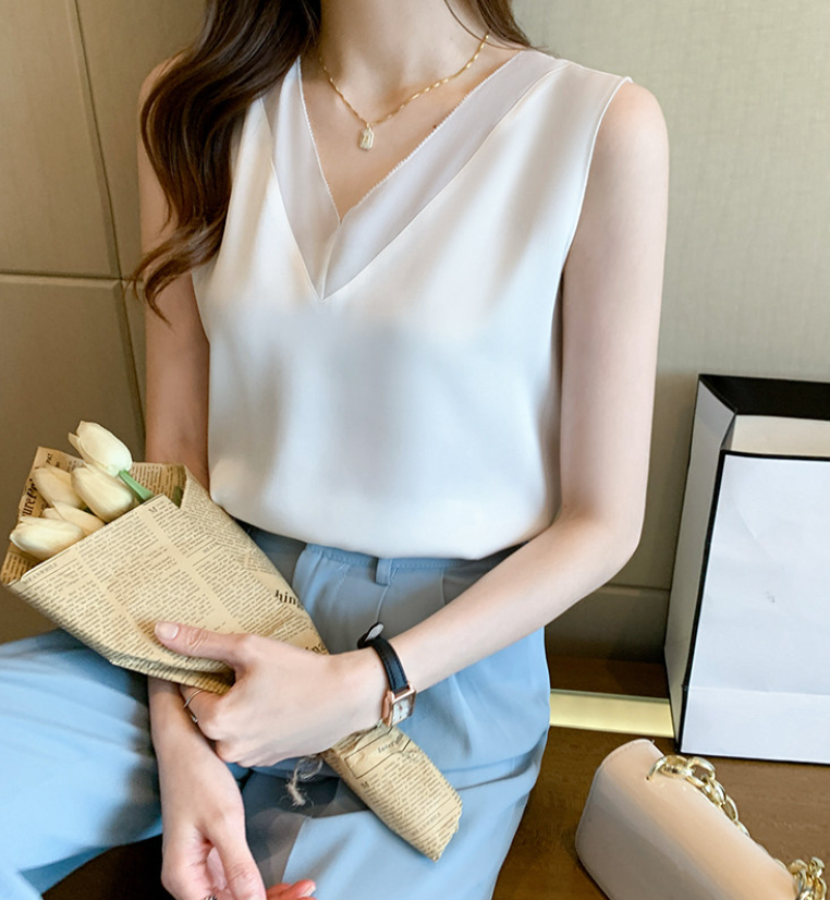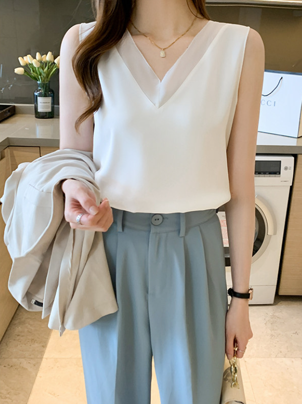 大きめのVネックラインと、透け感が色っぽいノースリーブ。