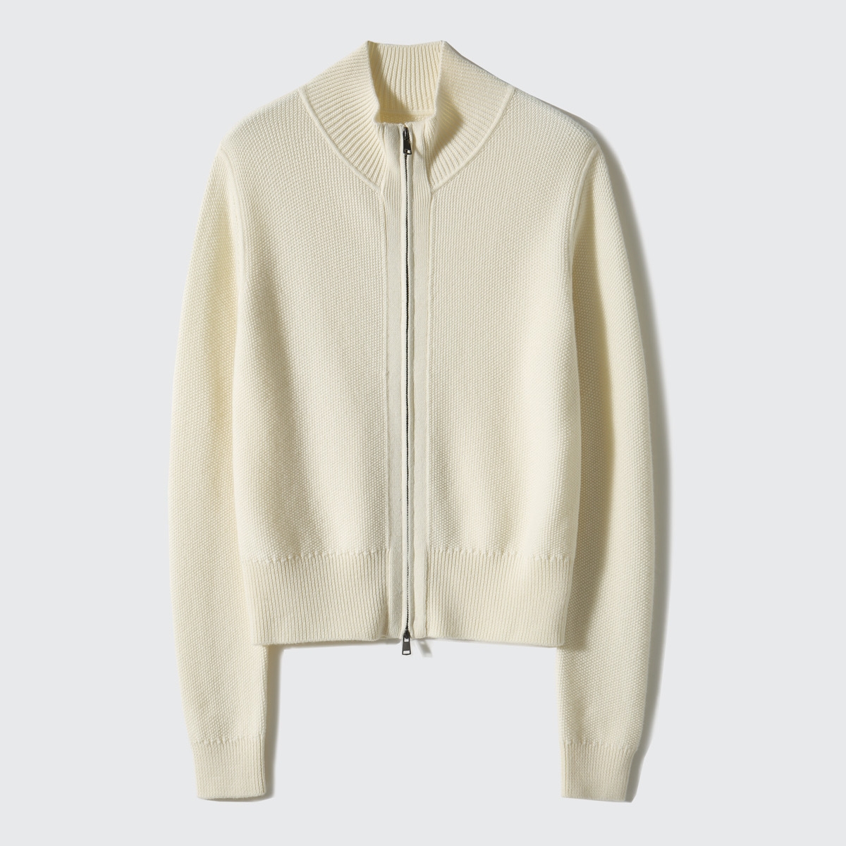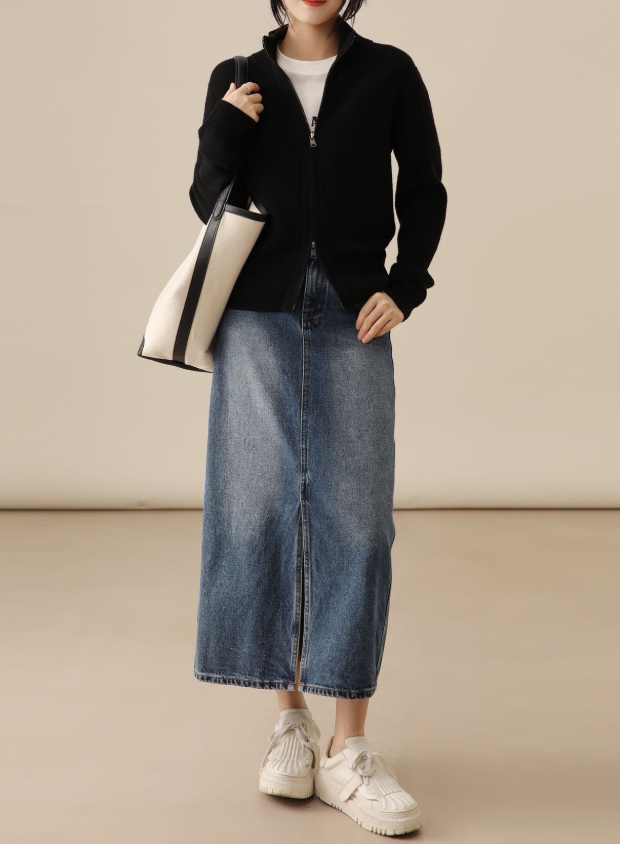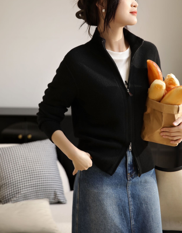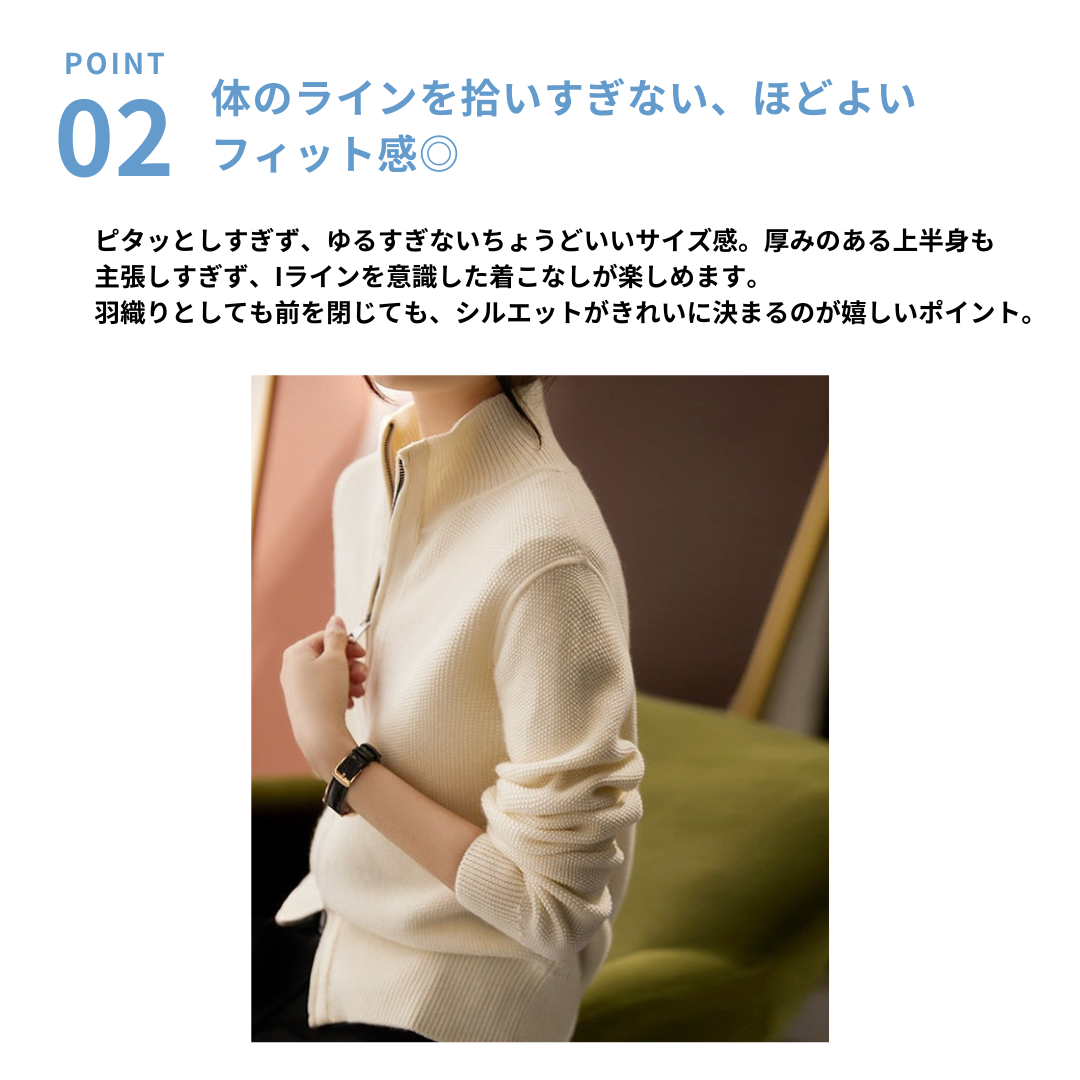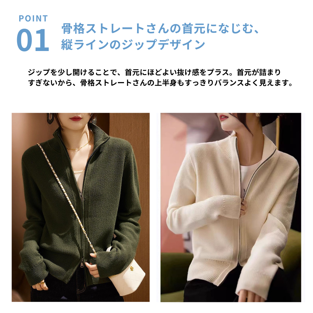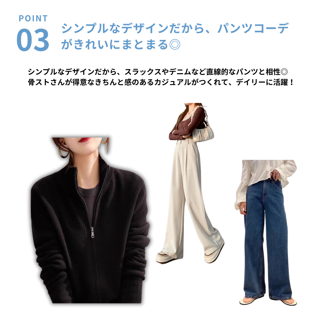 首元から裾までまっすぐ落ちるシルエットが、骨ストさんになじむジップニットトップス。シンプルなデザインと、縦ラインを意識できるフロントジップで、上半身をすっきりと見せてくれます。程よくフィットするサイズ感なので、羽織としても一枚着としても使いやすく、パンツスタイルとの相性も抜群。カジュアルになりすぎず、大人のきれいめコーデに取り入れやすい一着です。