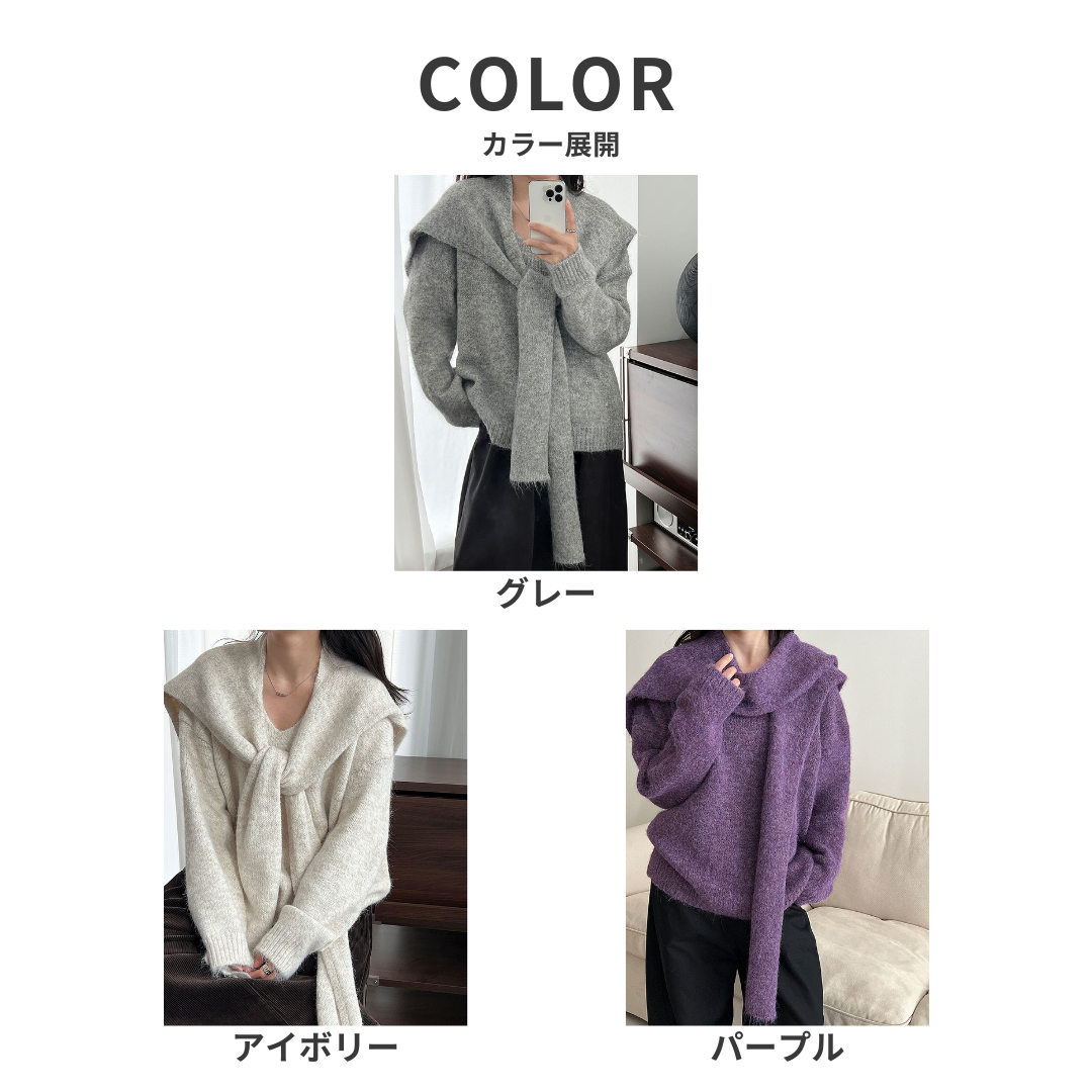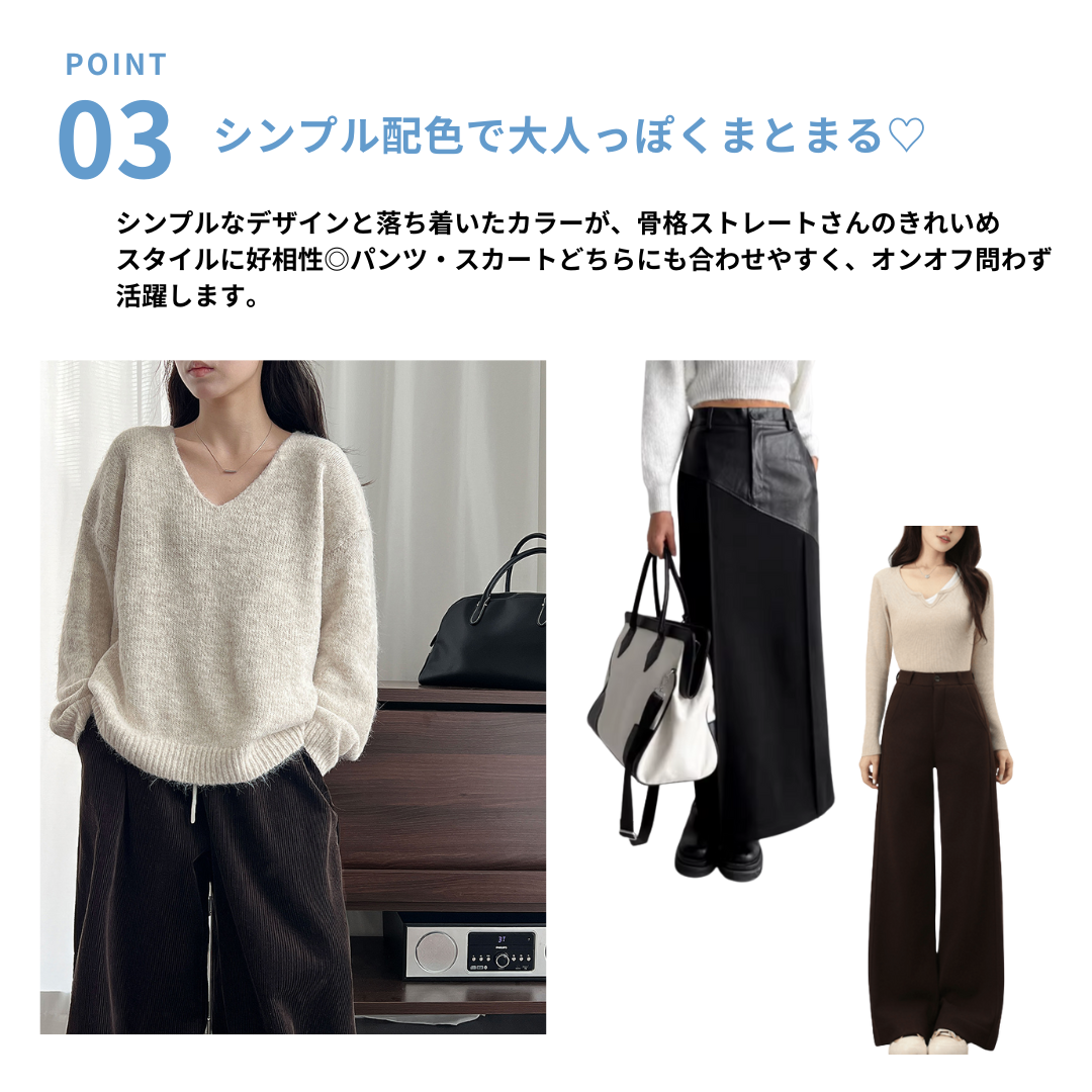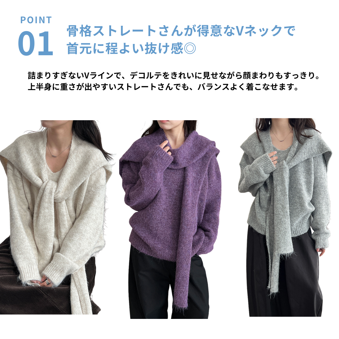 骨格ストレートさんが得意とする、シンプルで落ち着いた印象を活かせるショール付きニットトップス。Vネックの開きが首元に抜けをつくり、上半身をコンパクトに見せてくれます。付属のショールは巻き方次第で縦ラインを意識でき、コーデに変化をつけながらも着膨れ感を抑えた着こなしが可能。柔らかさのある素材感でも、全体はすっきりと大人っぽくまとまる一枚です。