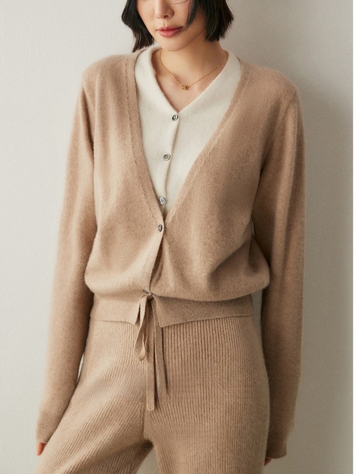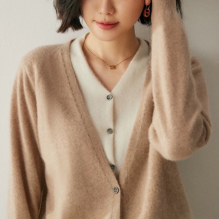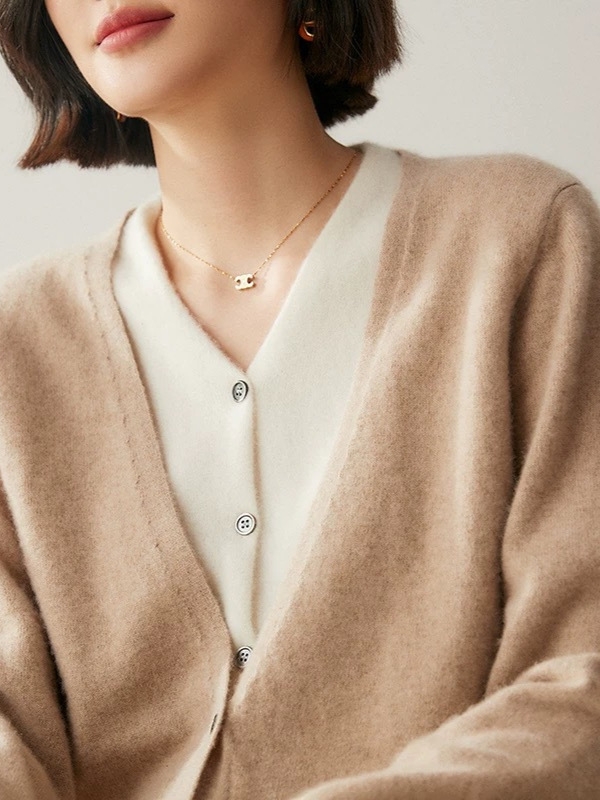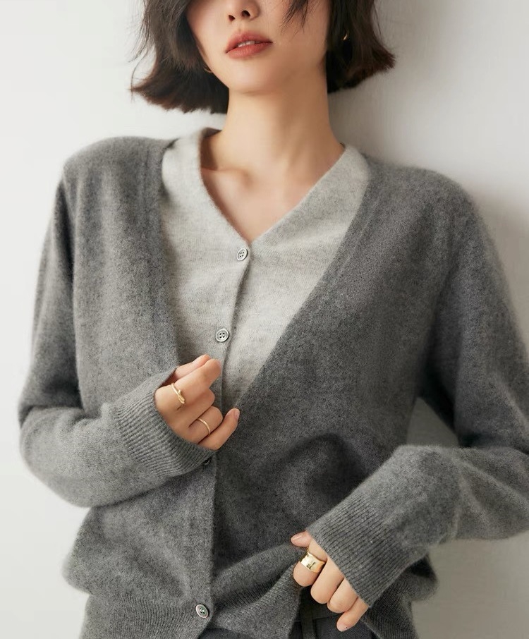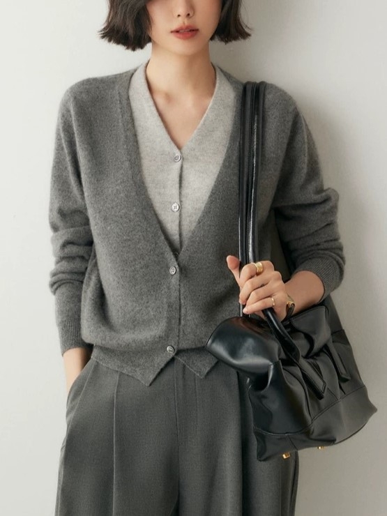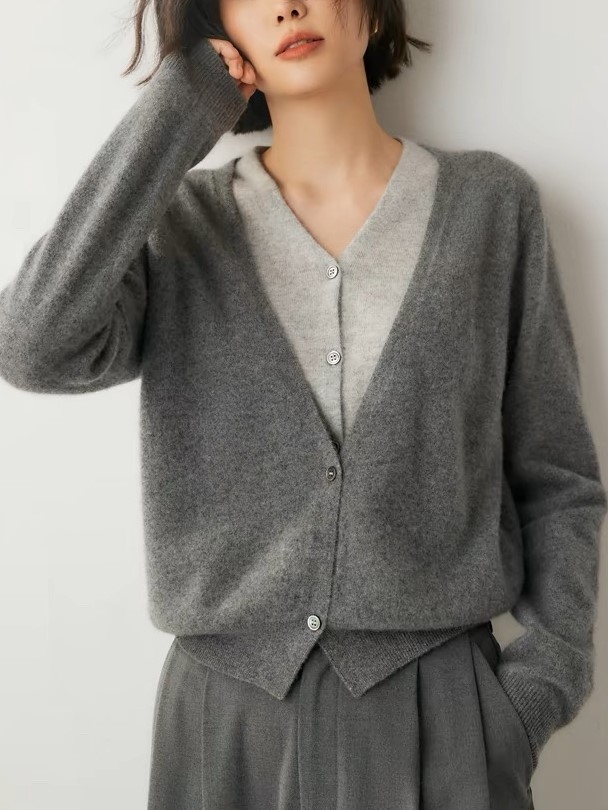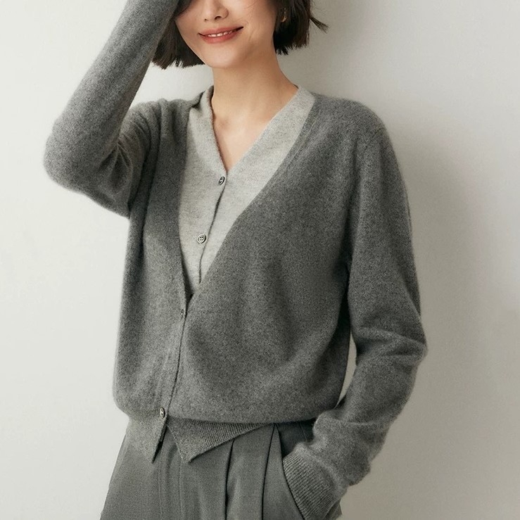 重ね着風の配色が縦の流れを自然につくり、シンプルに着るだけでコーデが決まります。ニットはふくらみすぎず、体のラインを拾いにくいのがポイント。Vネック仕様で顔まわりに程よい抜けが生まれ、パンツ合わせでもきれいめにまとまる一枚です。