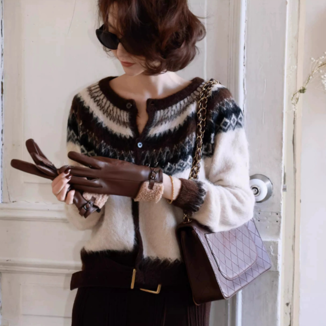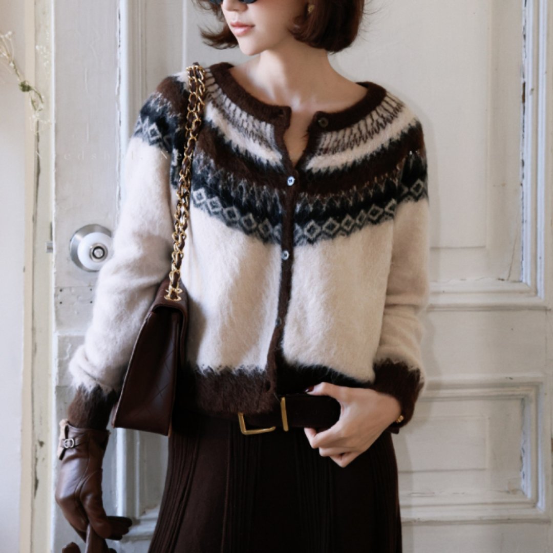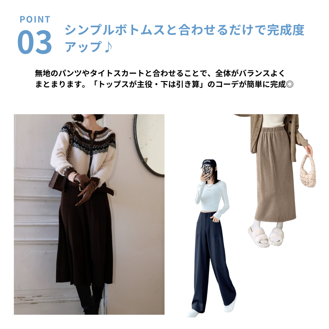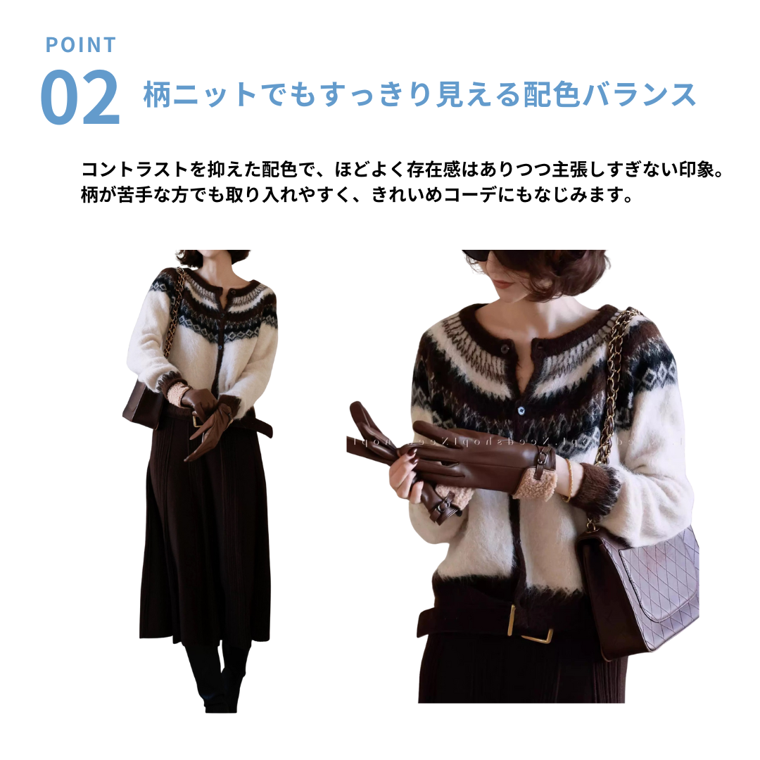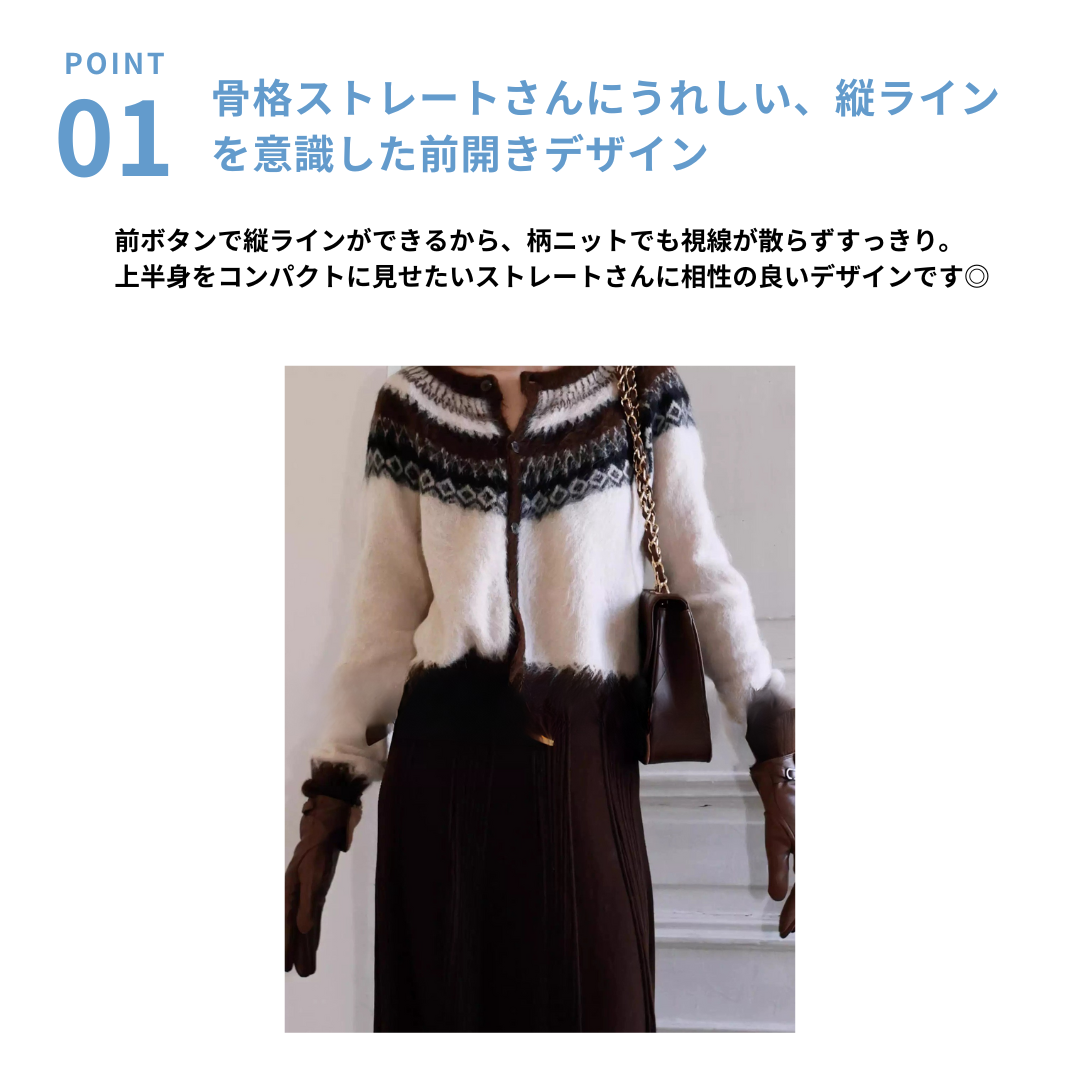 こちらのカーディガンは、前立ての縦ラインと配色バランスにより、柄アイテムながらも全体がすっきりまとまる一枚です。