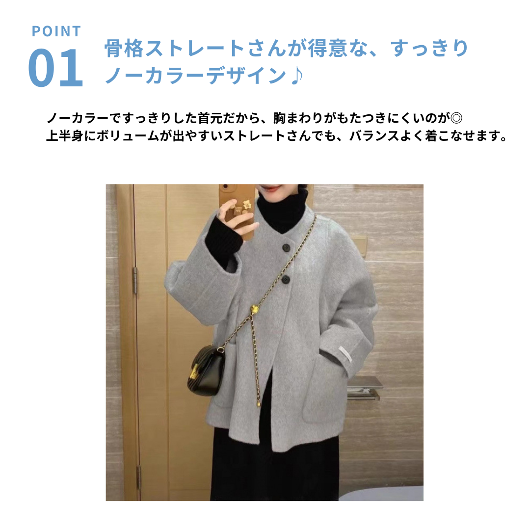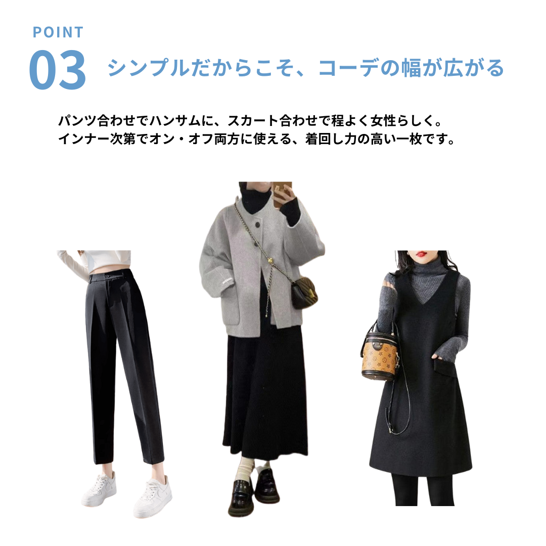 骨格ストレートさんは、シンプルで無駄のないデザインと、きちんと感のあるシルエットが魅力を引き立てます。直線を意識したすっきりしたフォルムで、上半身をコンパクトにまとめやすい一着。厚みを出しすぎないデザインなので、重たく見えにくく、カジュアルからきれいめまで幅広く活躍します。
