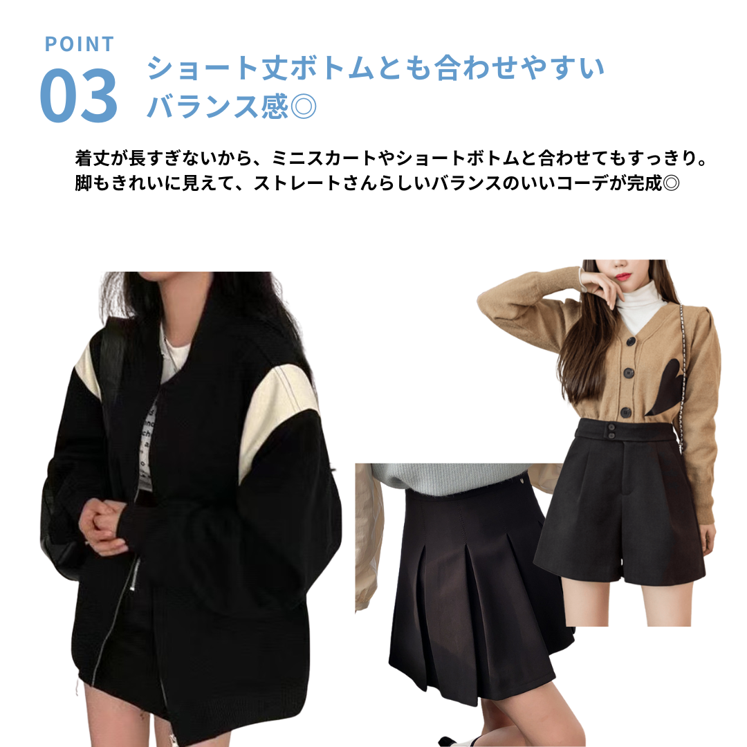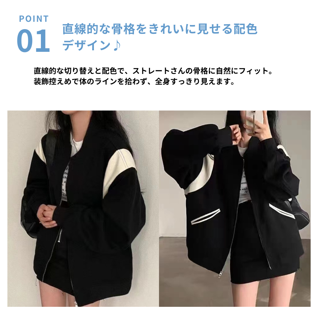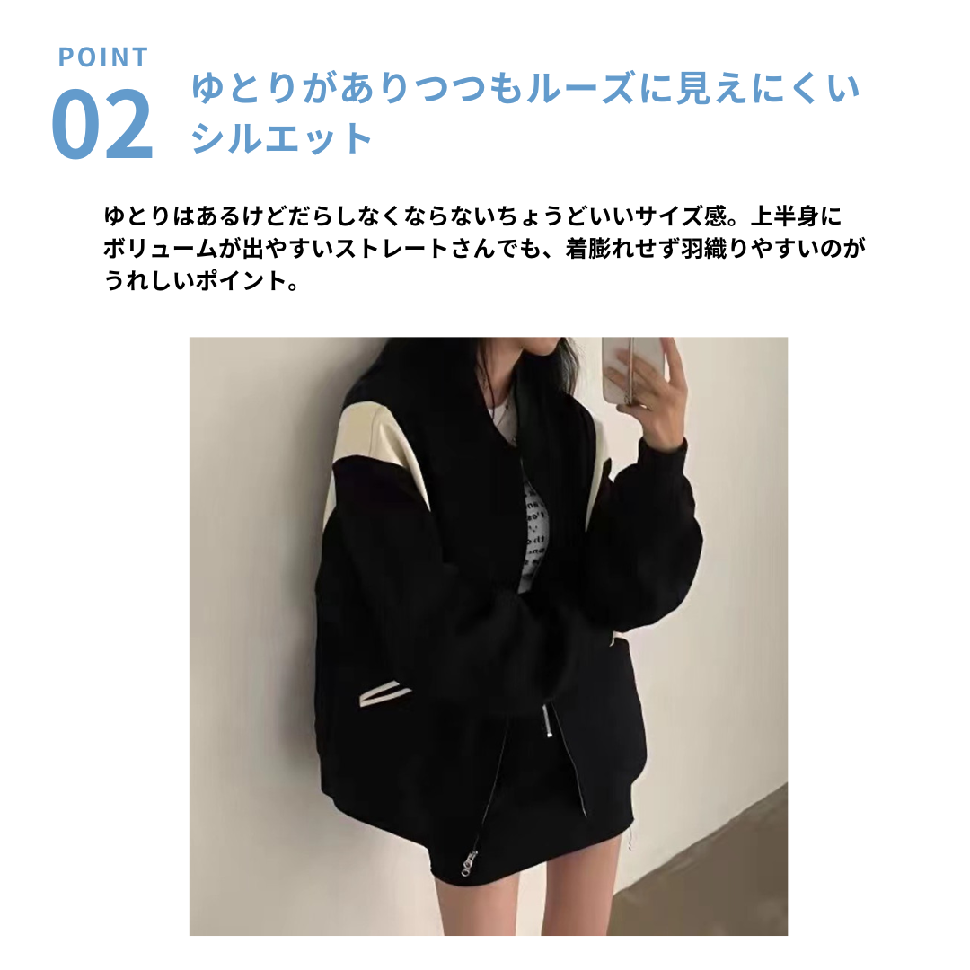 直線的な切り替えとシンプルな配色デザインが、骨格ストレートさんのメリハリある体つきに自然になじむジップブルゾン。カジュアルなアイテムながら、ラフに見えすぎず、すっきりとした印象をキープできます。羽織るだけでコーデがまとまりやすく、ストレートさんが得意なきれいめカジュアルに取り入れやすい一着です。