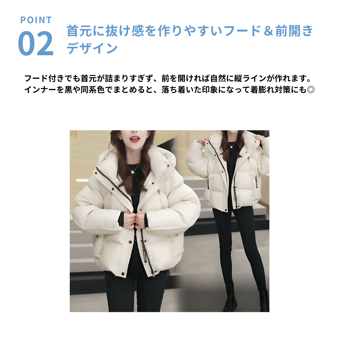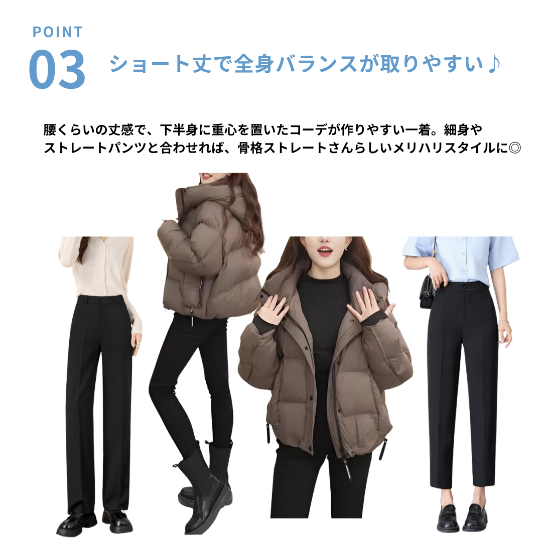ボリュームの出やすいダウンでも、全体がもたついて見えにくいバランスに仕上げたダウンジャケット。骨格ストレートさんが苦手としやすい着ぶくれ感を抑えつつ、防寒性と実用性をしっかり確保しています。シンプルなデザインで、きれいめにもカジュアルにも合わせやすく、冬の定番アウターとして活躍する一着です。