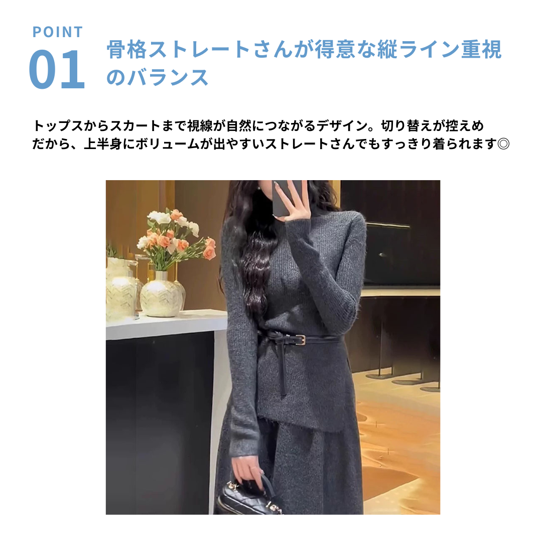縦ラインを意識したシンプルなシルエットで、骨格ストレートさんのメリハリある体型になじみやすいニットセットアップ。トップスは体に沿いすぎず、スカートは落ち感のある広がり控えめなライン。上下セットで着るだけで、全体がまとまりやすく、きちんと感も演出できます。