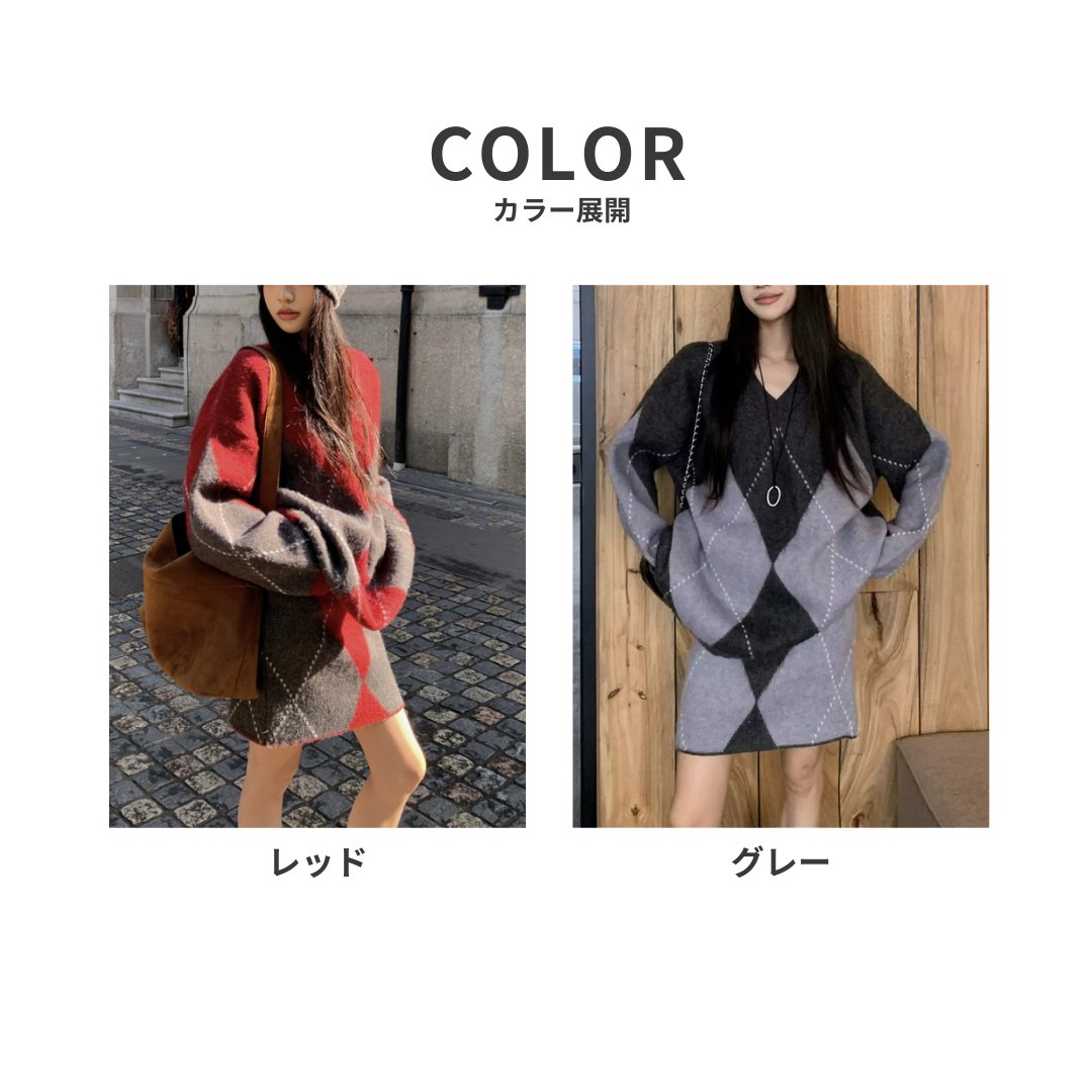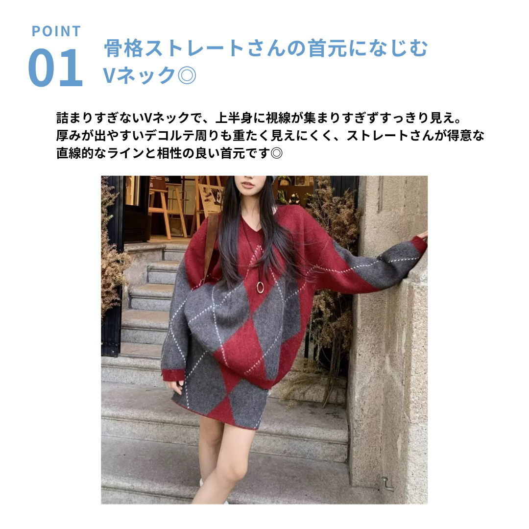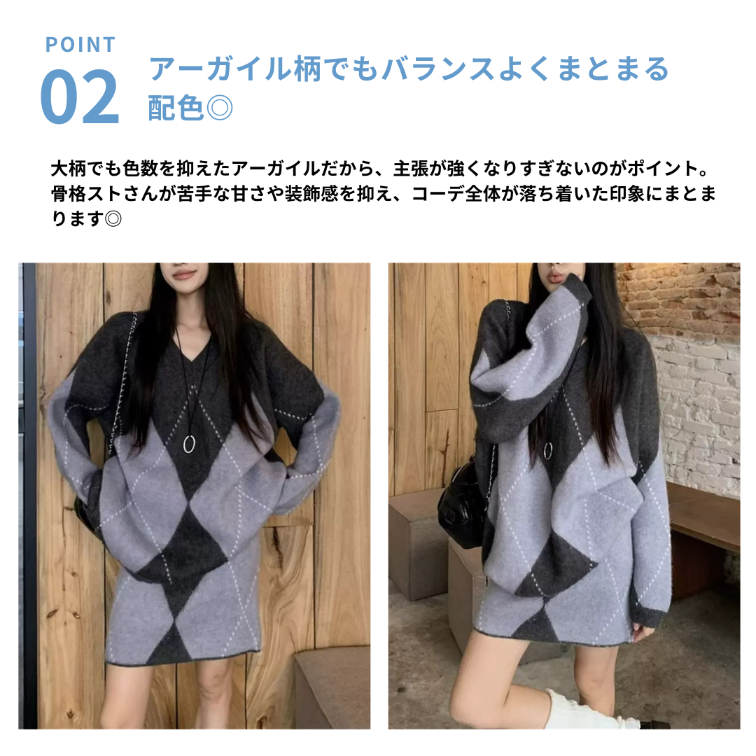 存在感のあるアーガイル柄を、Vネックとストンとしたシルエットでまとめたセットアップ。柄アイテムが苦手になりがちな骨格ストレートさんでも、縦の流れを意識したデザインで取り入れやすい一着です。トップスとミニスカートをセットで着ることで、コーデ全体が散らからず、バランスよく決まります。