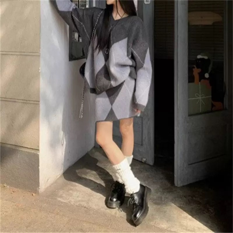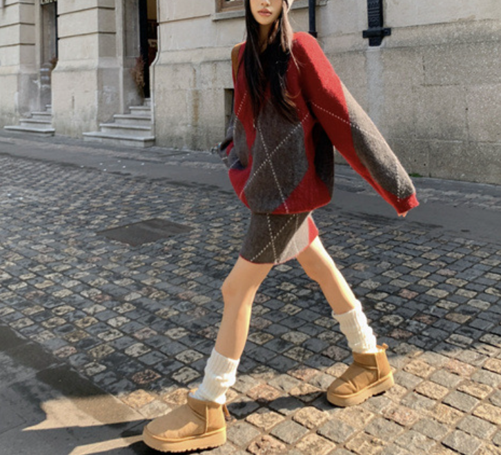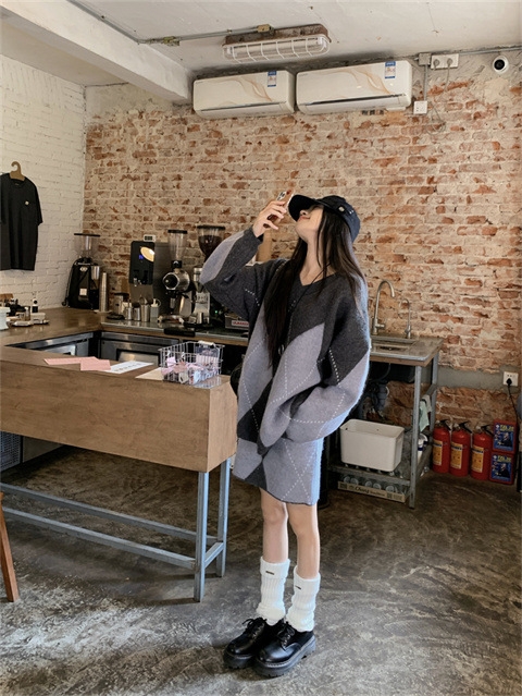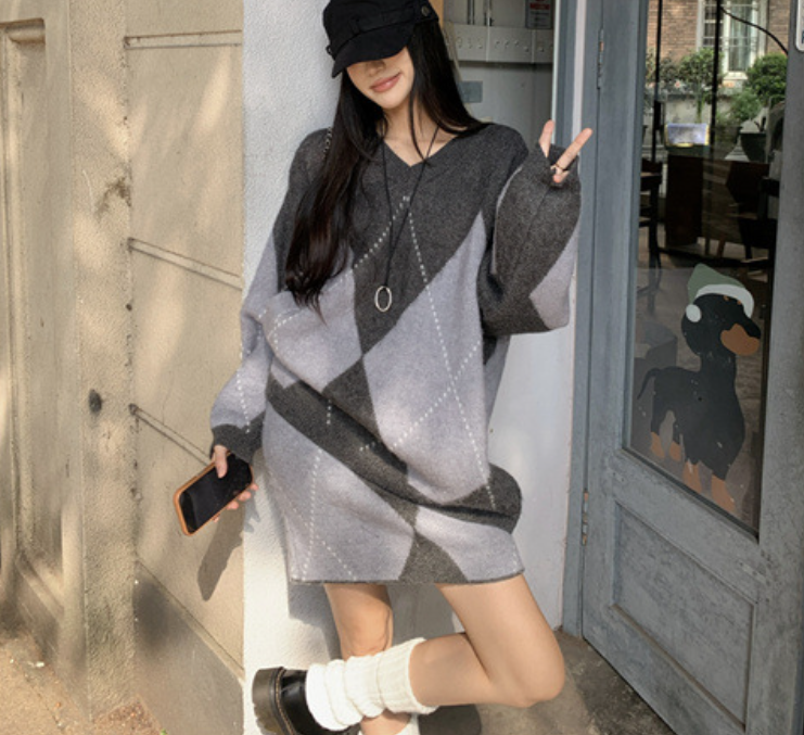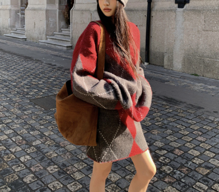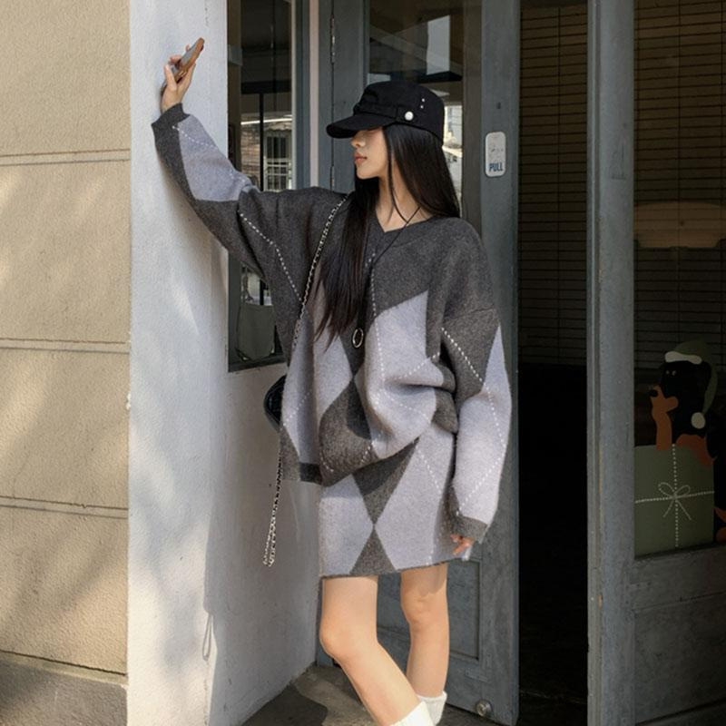存在感のあるアーガイル柄を、Vネックとストンとしたシルエットでまとめたセットアップ。柄アイテムが苦手になりがちな骨格ストレートさんでも、縦の流れを意識したデザインで取り入れやすい一着です。トップスとミニスカートをセットで着ることで、コーデ全体が散らからず、バランスよく決まります。