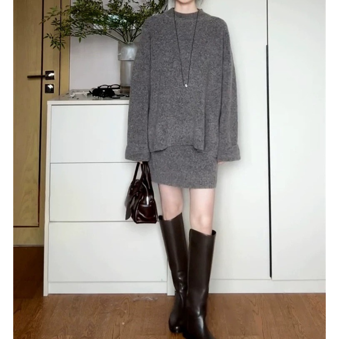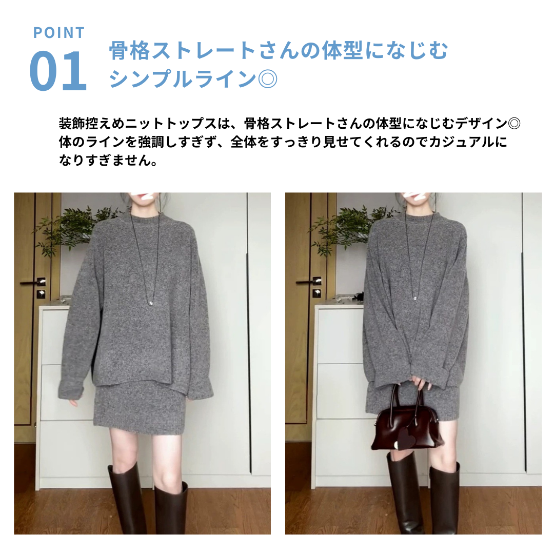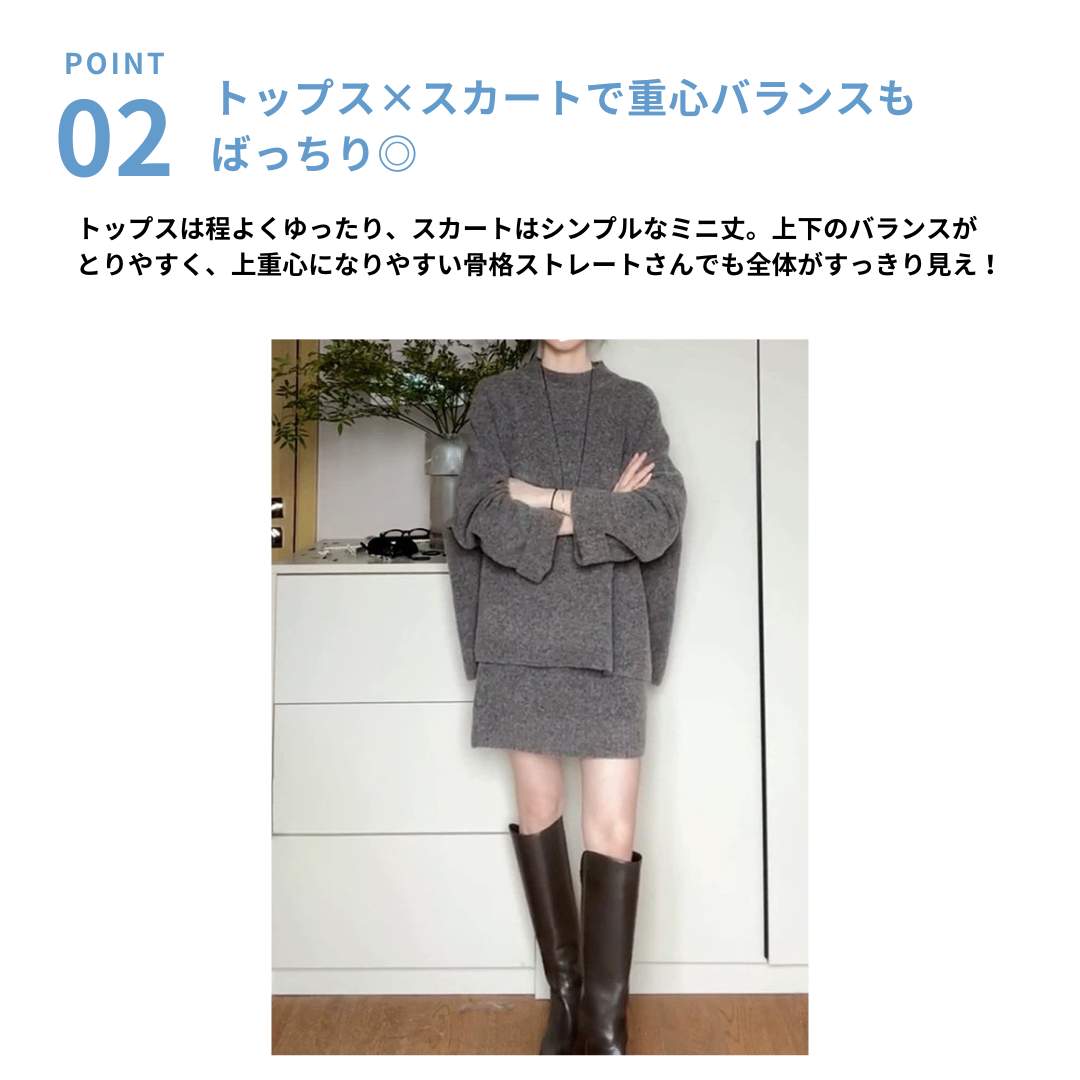 シンプルなニットトップスとミニスカートを組み合わせた、落ち着きのあるセットアップ。主張しすぎないデザインで、骨格ストレートさんが得意な“きれいめ・大人っぽさ”を自然に引き出します。上下セットで着るだけでコーデが完成し、迷わずバランスよく着こなせる一着です。