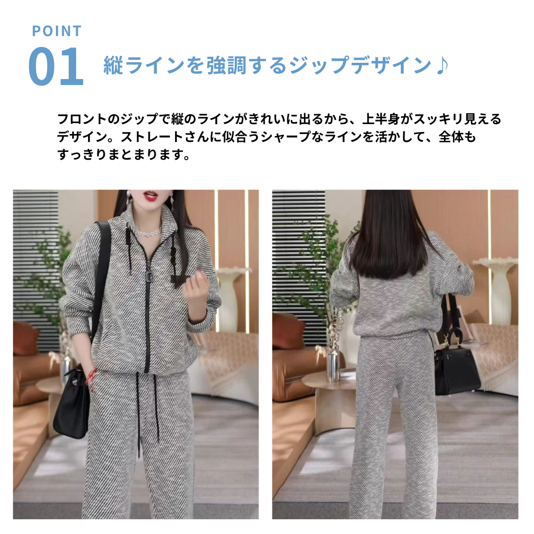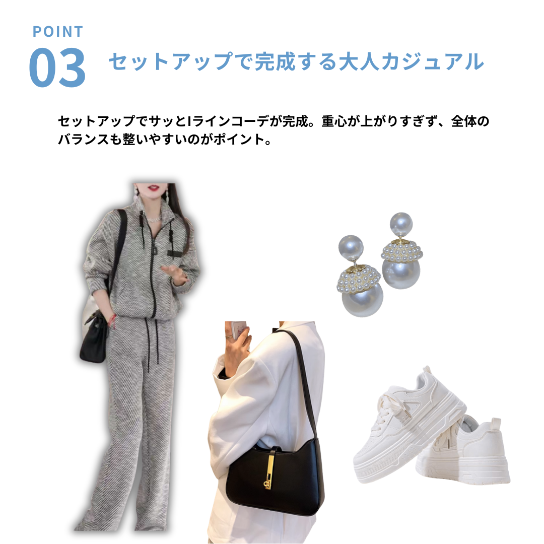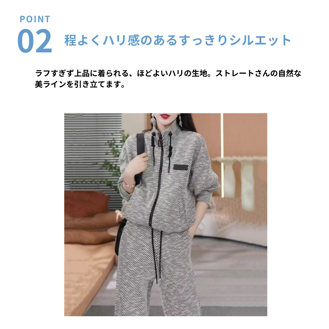 直線的なラインを活かせる、すっきりとしたシルエットのセットアップ。縦を意識したデザインと、程よくハリのある素材感が、骨格ストレートさんの体のラインと好相性です。上下セットで着るだけで、きちんと感と抜け感を両立した大人のカジュアルスタイルが完成します。