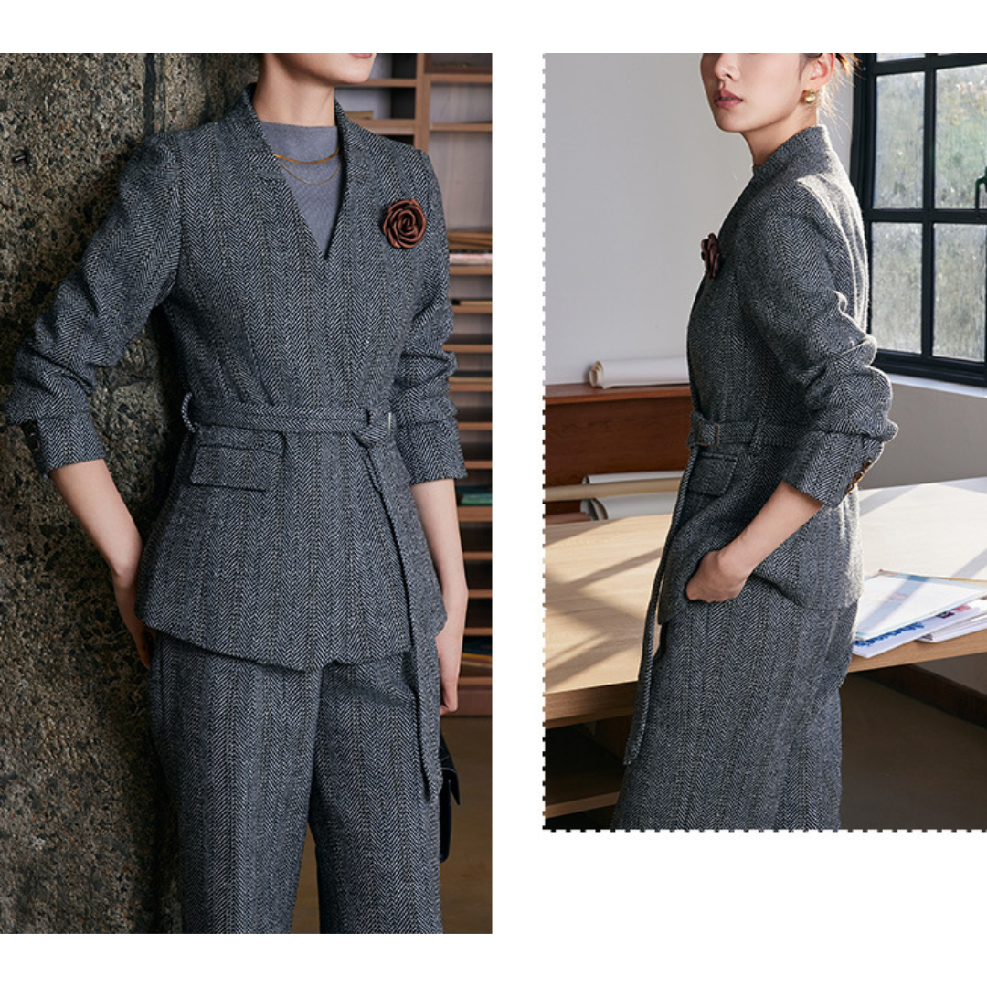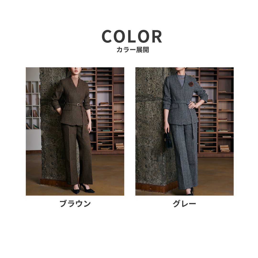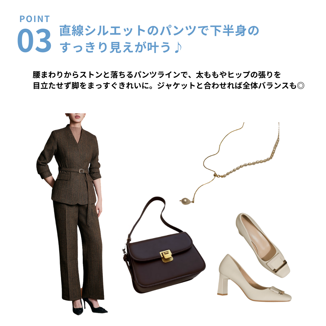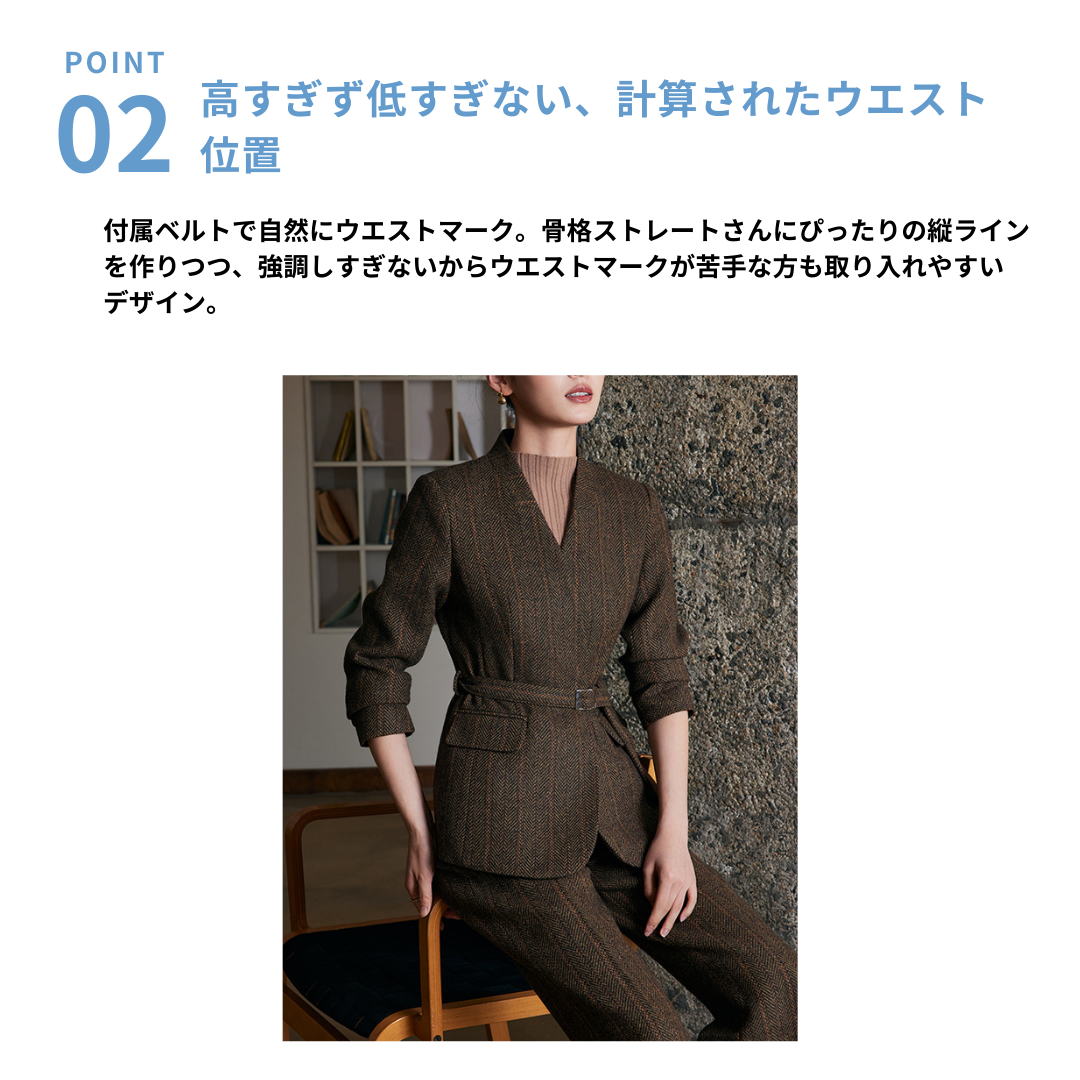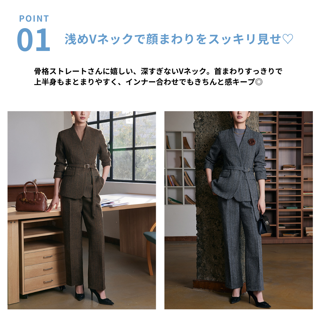 立体感のある骨格を持つストレートさんは、直線的なライン・程よい厚み・縦を意識したデザインで、本来のきれいな体のラインが引き立ちます。このセットアップは、Vネック×Iラインを意識したシルエットで、「きちんと感」と「スタイルの良さ」を無理なく両立できる一着です。
