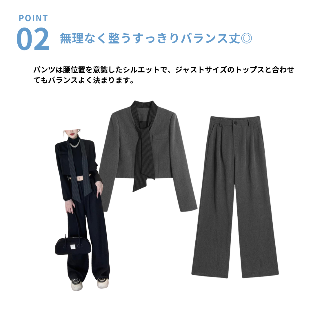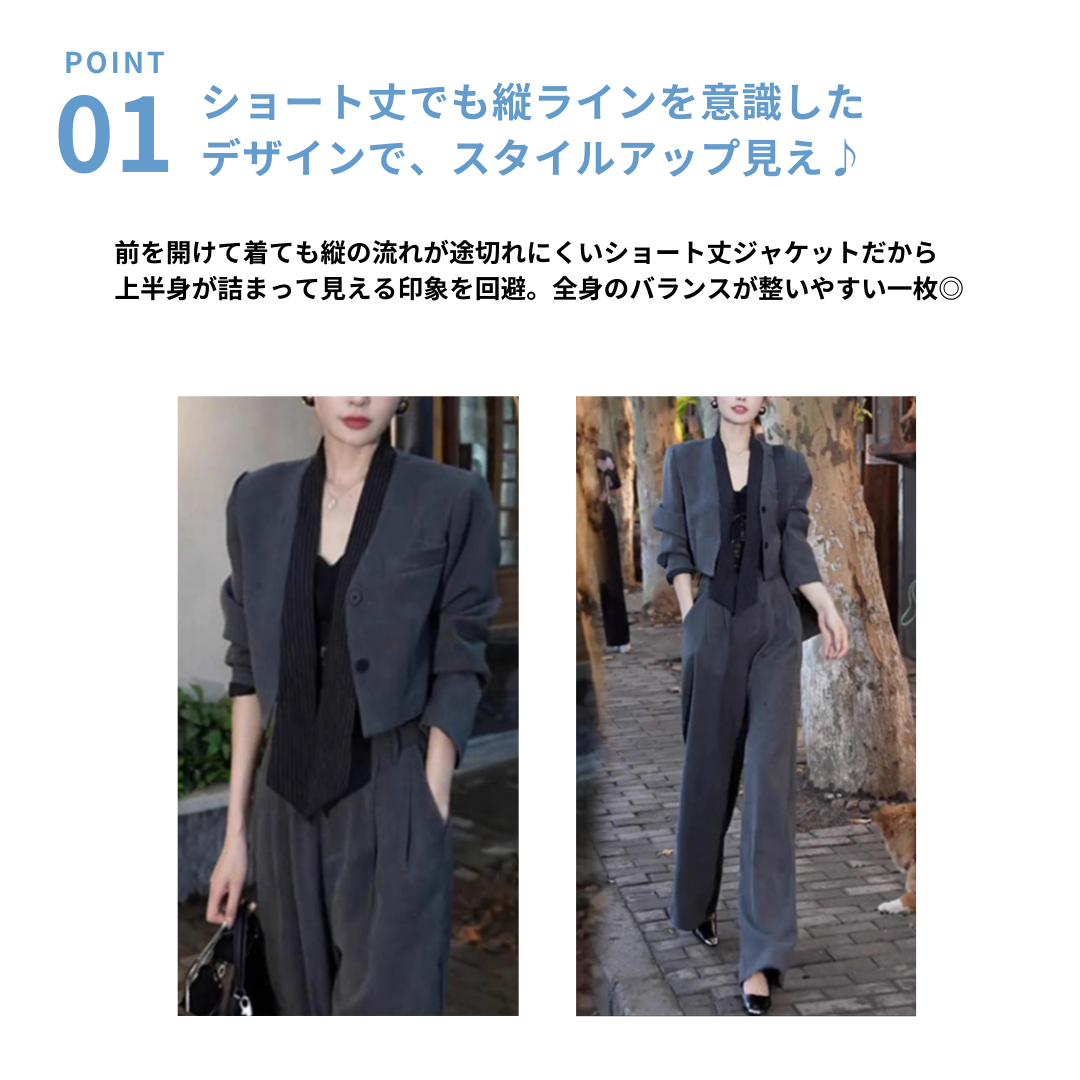 ショート丈でもバランスが取りやすい、縦ラインを意識した大人のためのセットアップスーツ。上半身のボリューム感や重心の高さが気になるストレートさんも全体が間延びせず、きちんと感を保てる組み合わせに仕上げています。ジャケットは短すぎず、パンツとのつながりで縦の流れを自然につくれるのがポイント。洗練されたスタイルが叶うセットアップです。