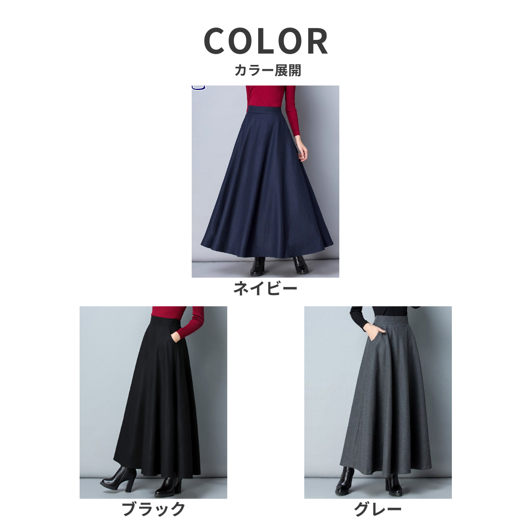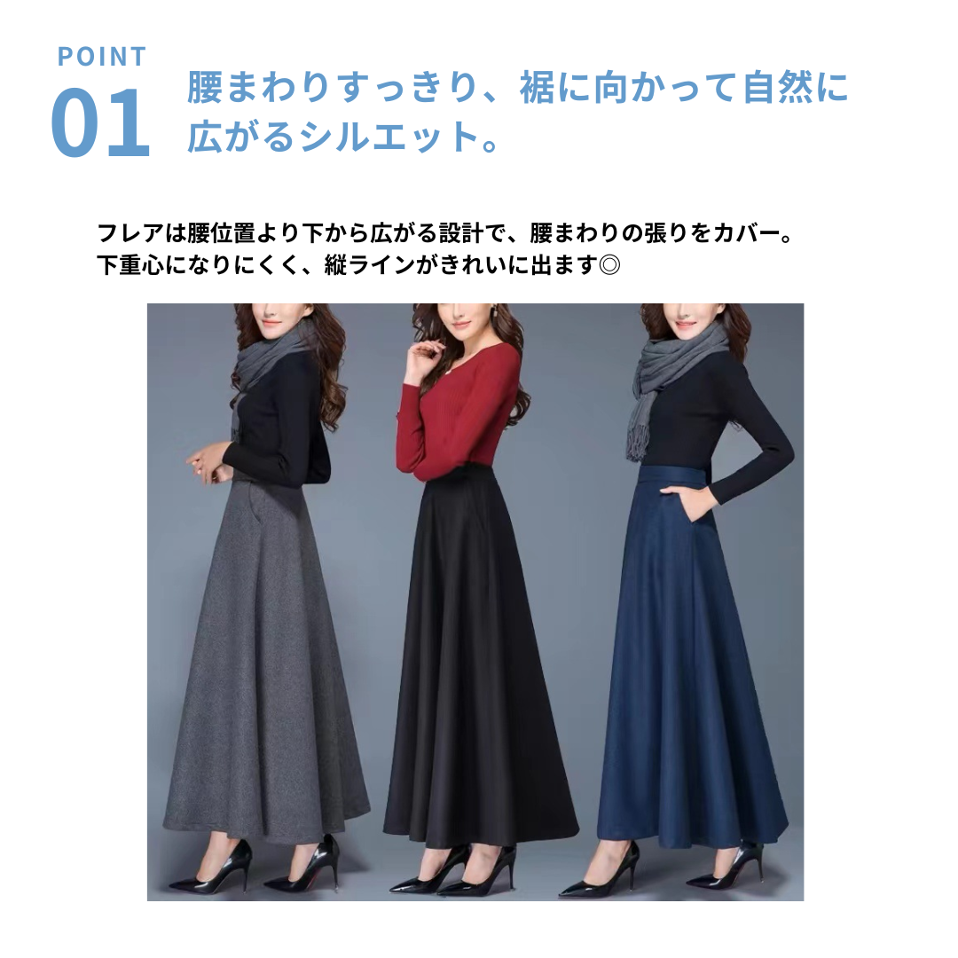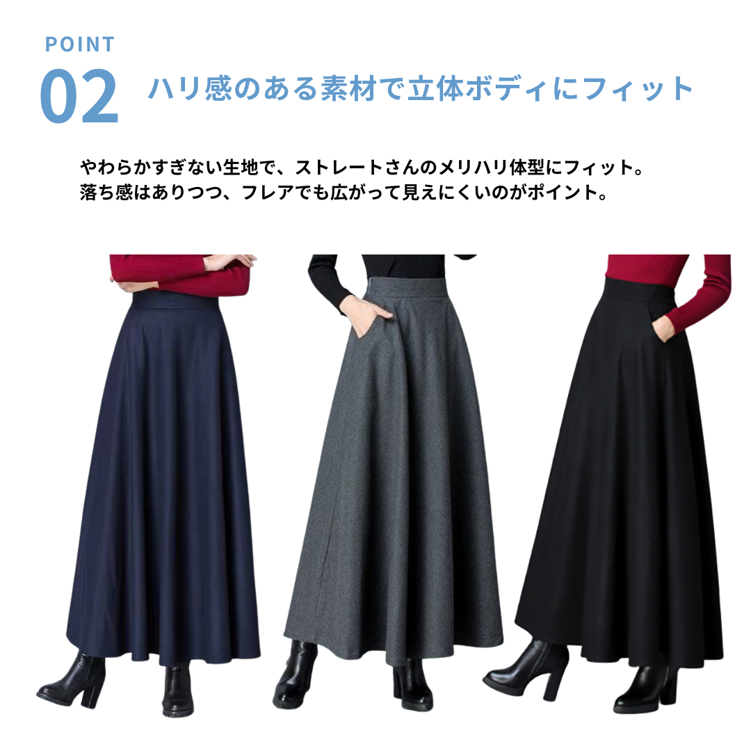 下半身にボリュームが出やすい骨格ストレートさんでも、広がりすぎず、縦ラインをきれいに見せてくれるロングフレアスカート。腰まわりはすっきり、裾にかけて自然に広がるシルエットで、「フレアは太って見えそう…」という不安を軽減。きちんと感がありながら、体の立体感を邪魔しない一枚です。