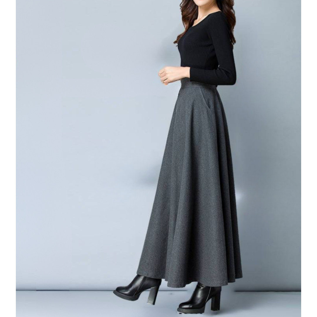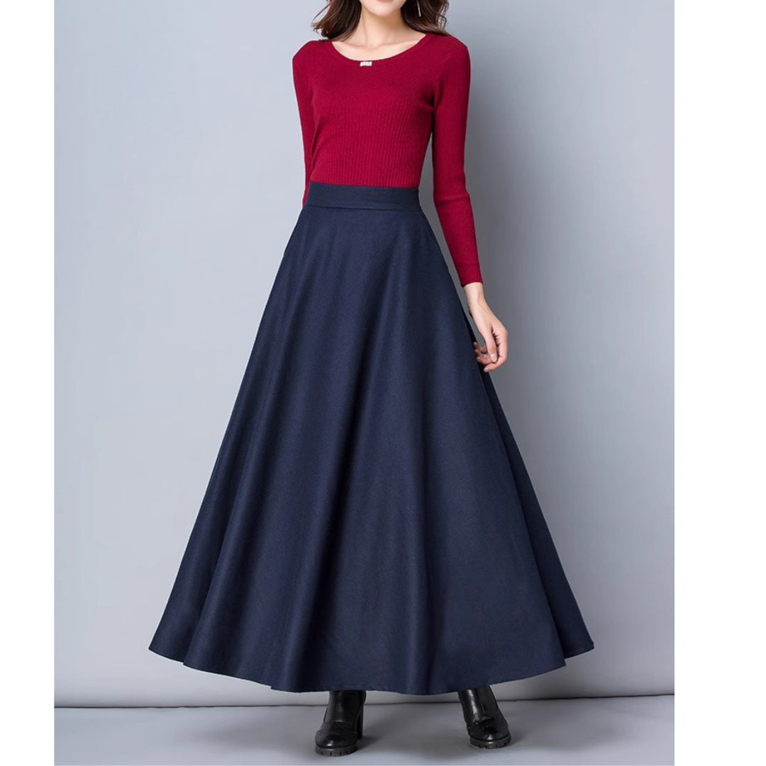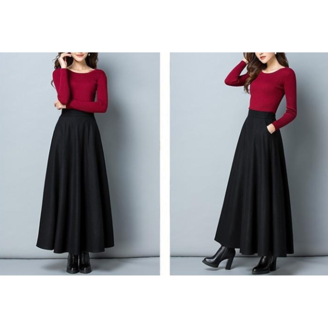 下半身にボリュームが出やすい骨格ストレートさんでも、広がりすぎず、縦ラインをきれいに見せてくれるロングフレアスカート。腰まわりはすっきり、裾にかけて自然に広がるシルエットで、「フレアは太って見えそう…」という不安を軽減。きちんと感がありながら、体の立体感を邪魔しない一枚です。