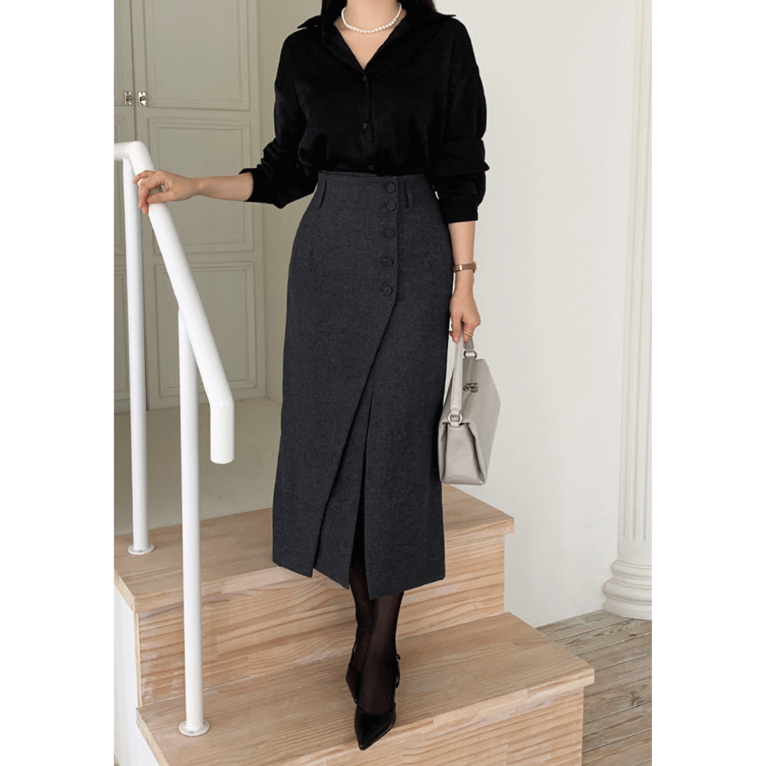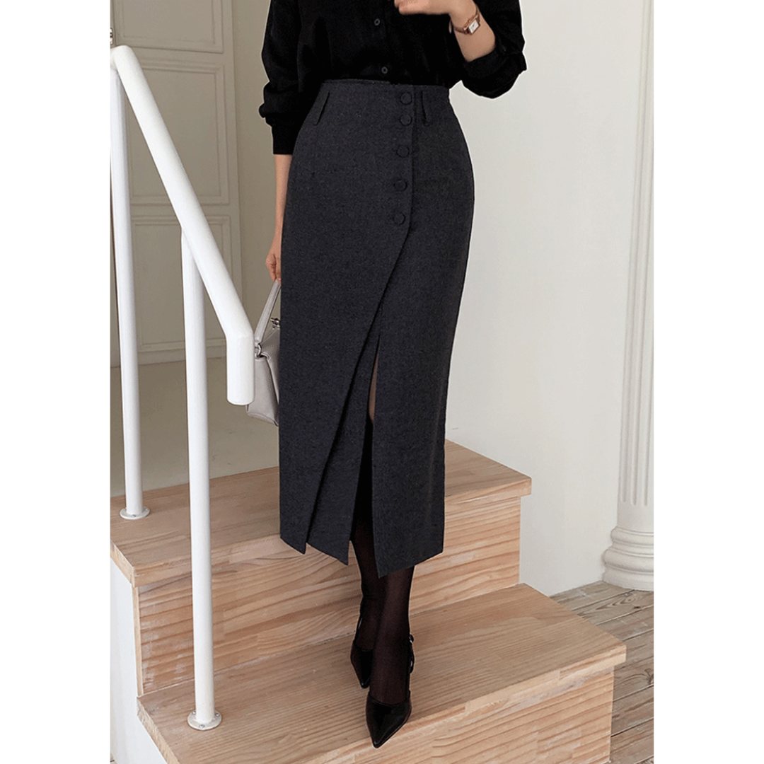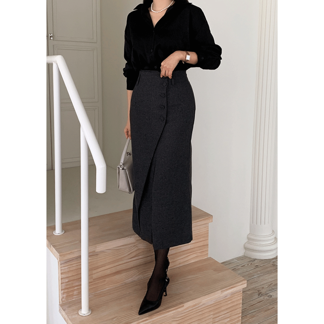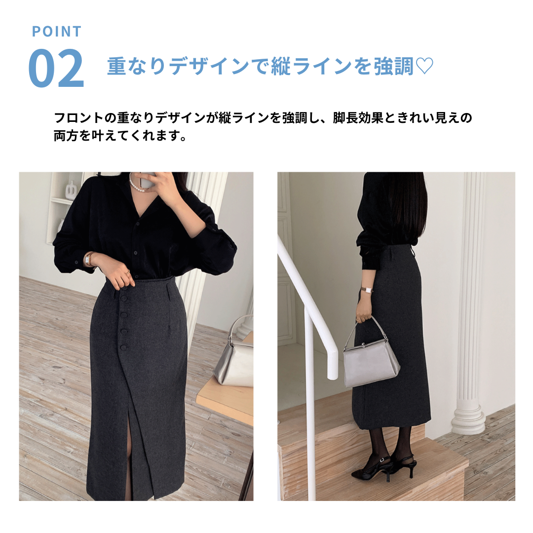「タイトスカートは腰や太ももが強調されそう」「きれいめにしたいのに、体の厚みが目立つ」そんな骨格ストレートさんの悩みに寄り添う一着です。直線を意識したIラインシルエットと、程よくハリのある素材感が、下半身の立体感を拾いすぎずすっきり整えます。フロントの重なりデザインが縦の流れを強調し、自然にスタイルアップ。甘さを抑えたミニマルな表情で、オフィスからきれいめなお出かけまで幅広く活躍します。