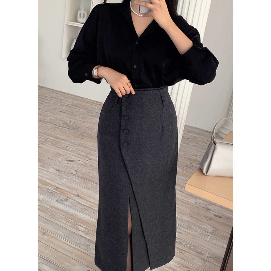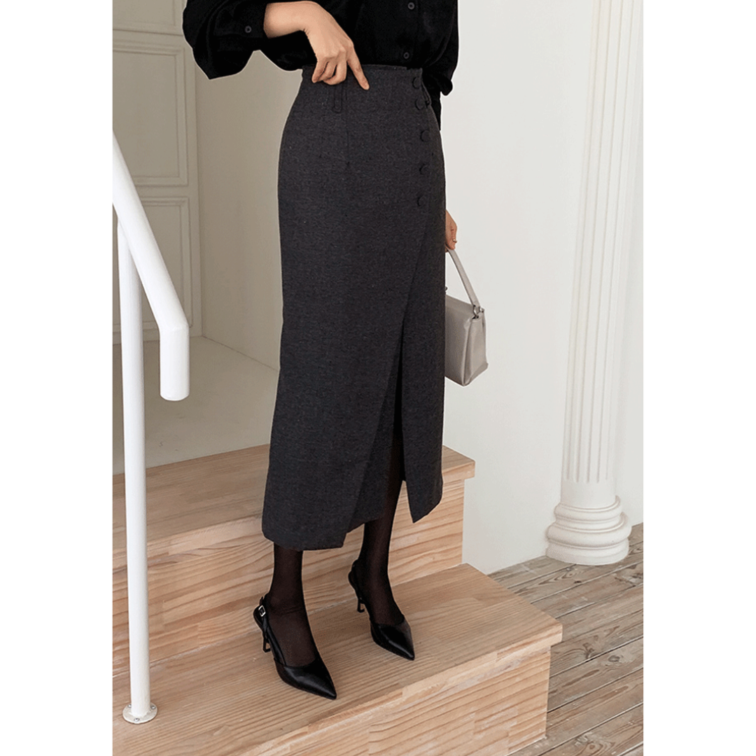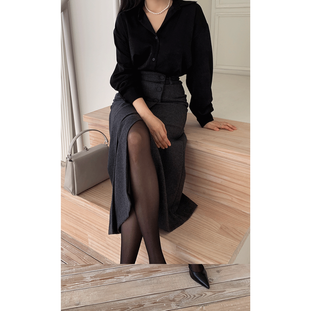 「タイトスカートは腰や太ももが強調されそう」「きれいめにしたいのに、体の厚みが目立つ」そんな骨格ストレートさんの悩みに寄り添う一着です。直線を意識したIラインシルエットと、程よくハリのある素材感が、下半身の立体感を拾いすぎずすっきり整えます。フロントの重なりデザインが縦の流れを強調し、自然にスタイルアップ。甘さを抑えたミニマルな表情で、オフィスからきれいめなお出かけまで幅広く活躍します。