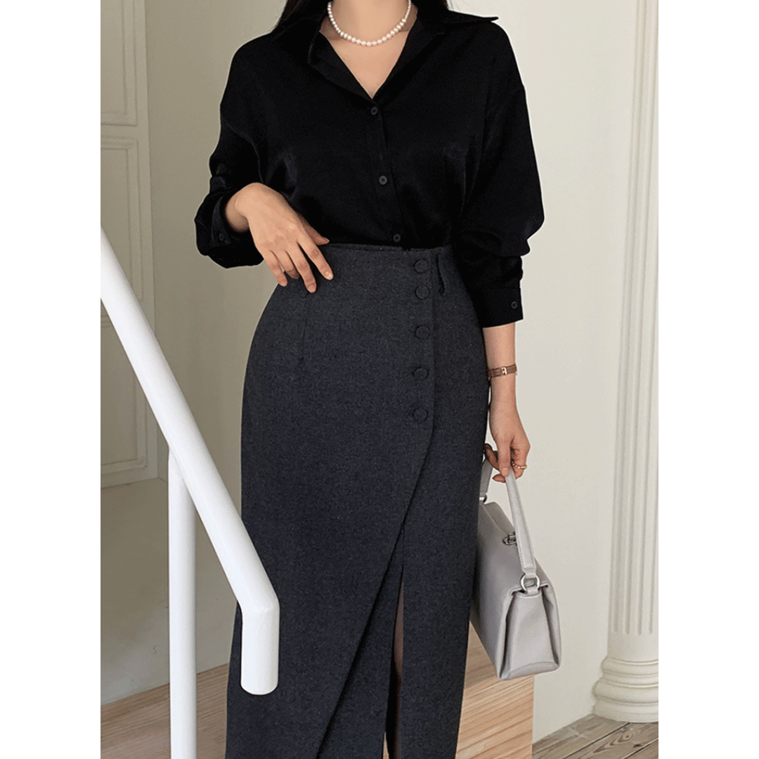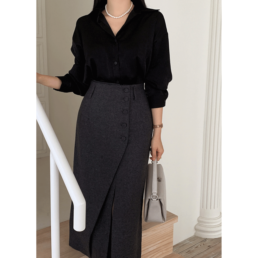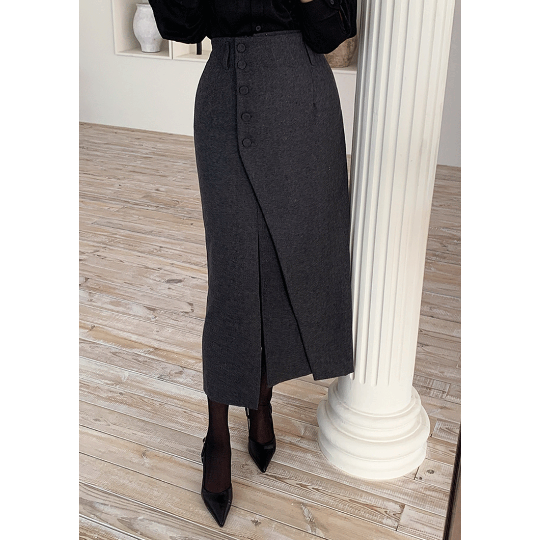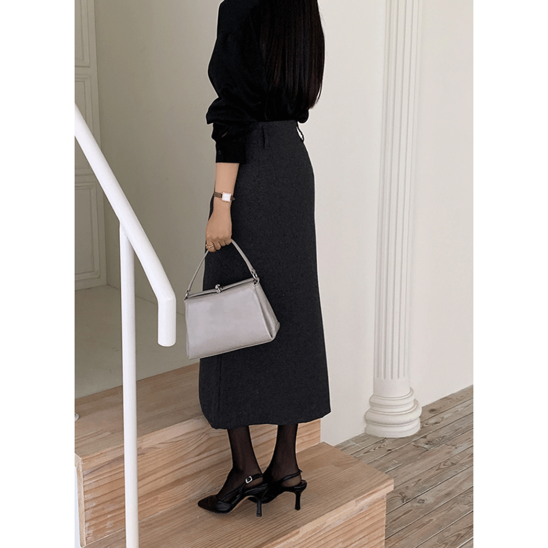 「タイトスカートは腰や太ももが強調されそう」「きれいめにしたいのに、体の厚みが目立つ」そんな骨格ストレートさんの悩みに寄り添う一着です。直線を意識したIラインシルエットと、程よくハリのある素材感が、下半身の立体感を拾いすぎずすっきり整えます。フロントの重なりデザインが縦の流れを強調し、自然にスタイルアップ。甘さを抑えたミニマルな表情で、オフィスからきれいめなお出かけまで幅広く活躍します。