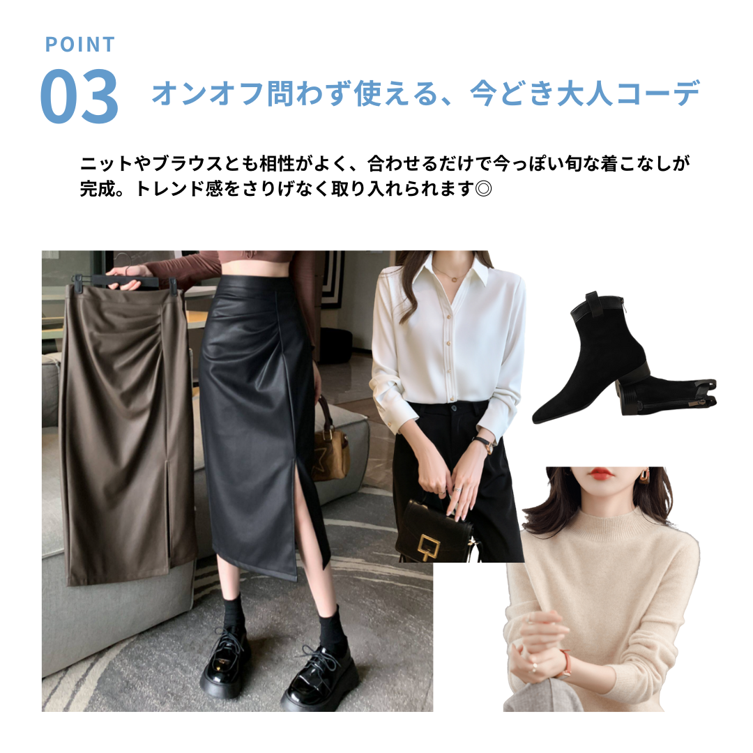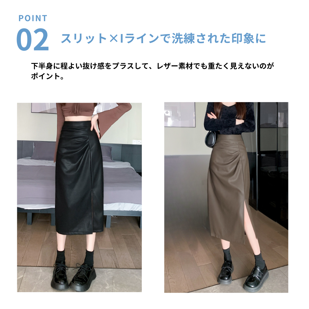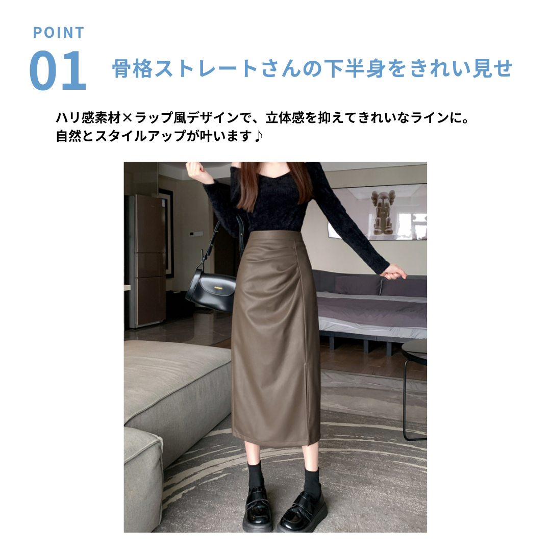腰位置が高く、ヒップや太ももに立体感が出やすい骨格ストレートさんのために設計されたレザー調Iラインスカート。程よいハリ感のある素材が体の丸みを拾いすぎず、縦ラインを強調することで下半身をすっきり見せてくれます。ラップ風デザインとスリットが抜け感をプラスし、重たく見えがちなレザー素材でもシャープで洗練された印象に。きちんと感と今っぽさを両立し、オンオフ問わず活躍する一枚です。