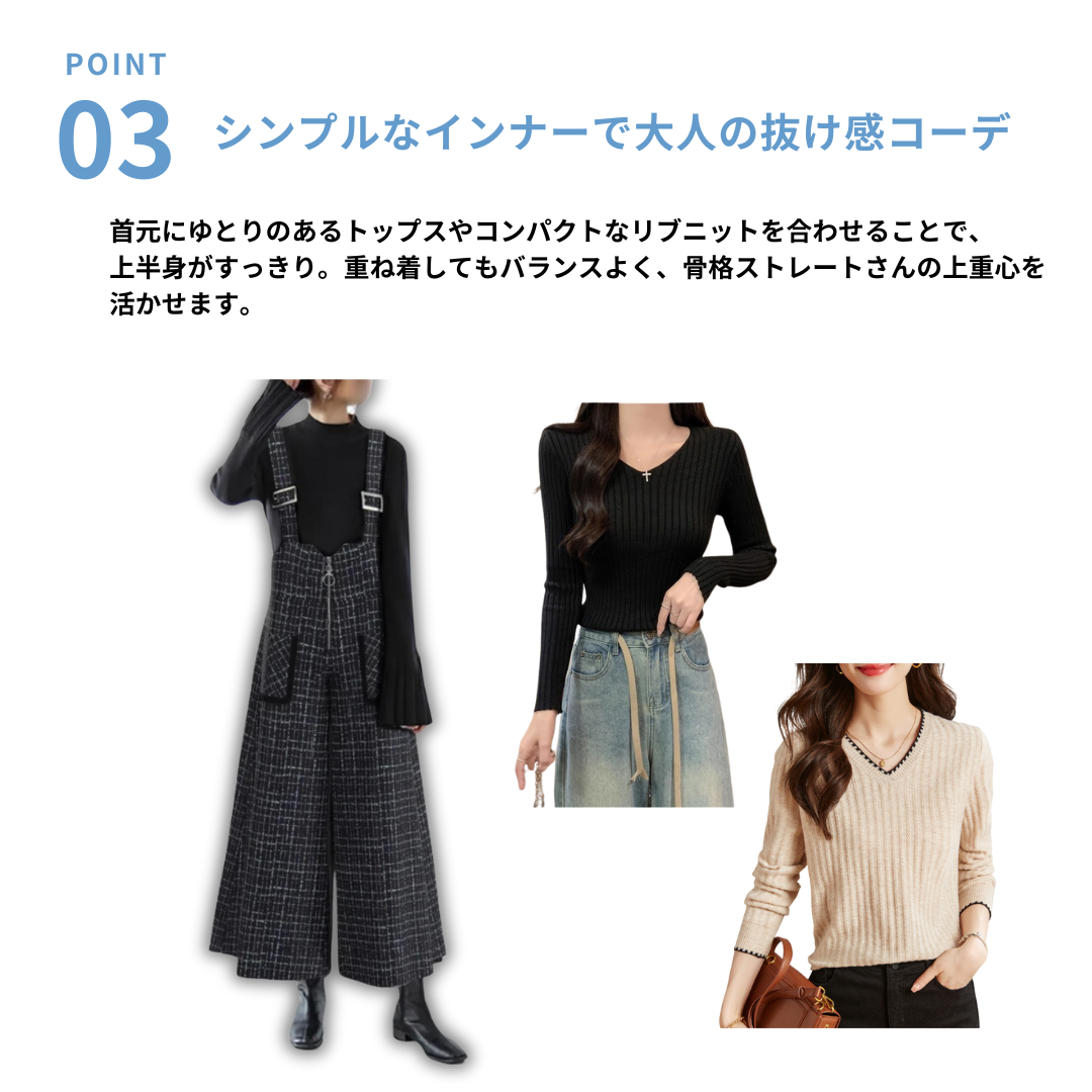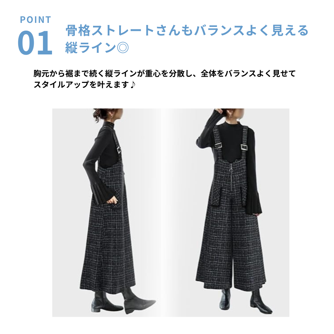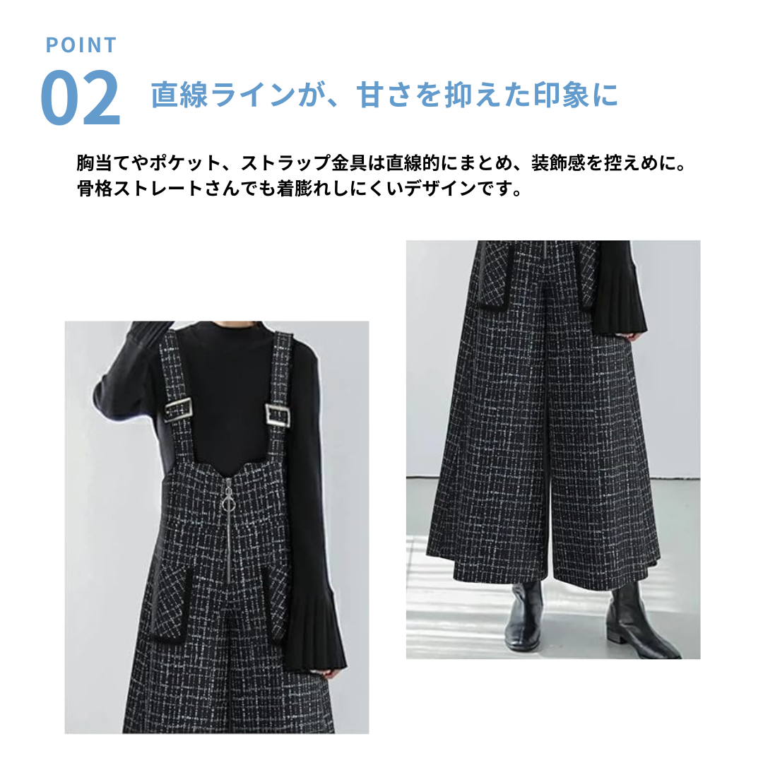 骨格ストレートさんが得意とする縦のライン・直線的なシルエット・落ち感のある素材感を活かせるジャンパースカート。広がりすぎないストレート寄りのワイドシルエットと、胸元から裾まで続く縦ラインデザインで重心が上に集まりやすい骨格ストレートさんでも全身をすっきり・バランス良く見せてくれる一着です。インナーをシンプルにまとめることで、カジュアルになりすぎず、大人っぽく着用できるのもポイント。
