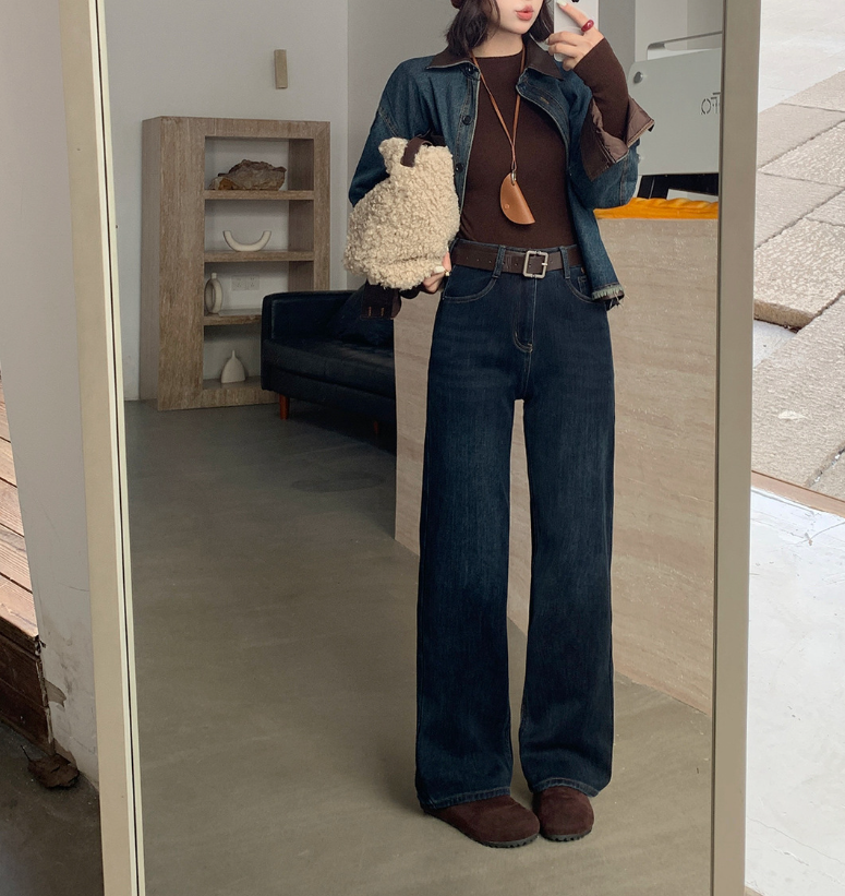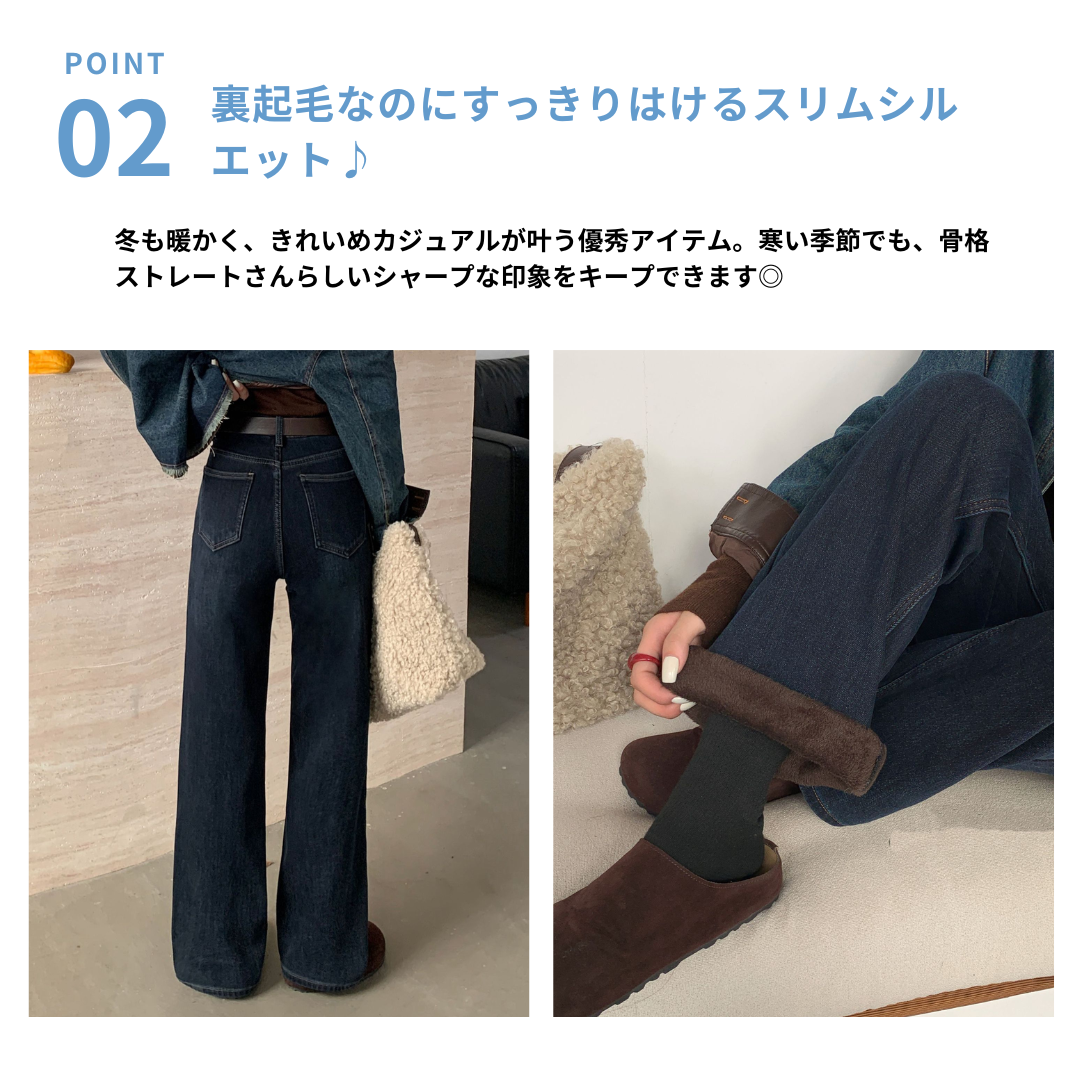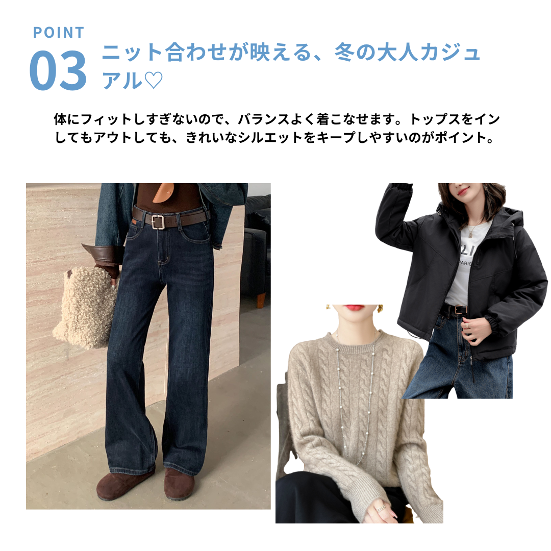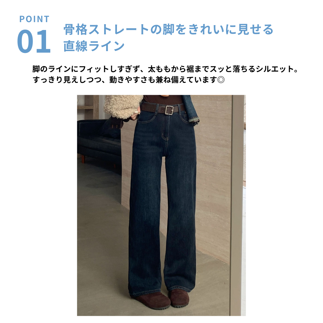 直線的なライン・脚の長さを活かせるストレートシルエットをベースにした一本。太ももから裾まで余計な広がりを抑えたシルエットで、下半身に重さが出にくく、全体をすっきりとまとめてくれます。裏起毛仕様でももたつきにくく、きれいめカジュアルを保ちながら暖かさも確保できるデニムです。