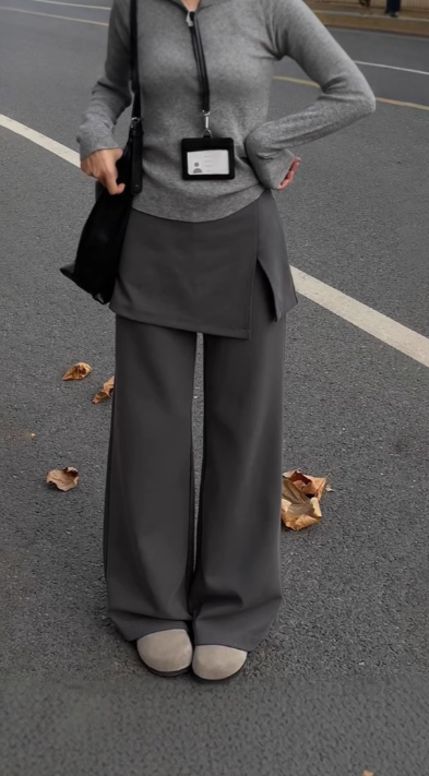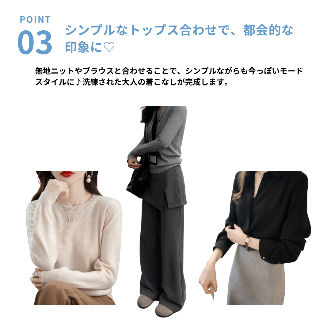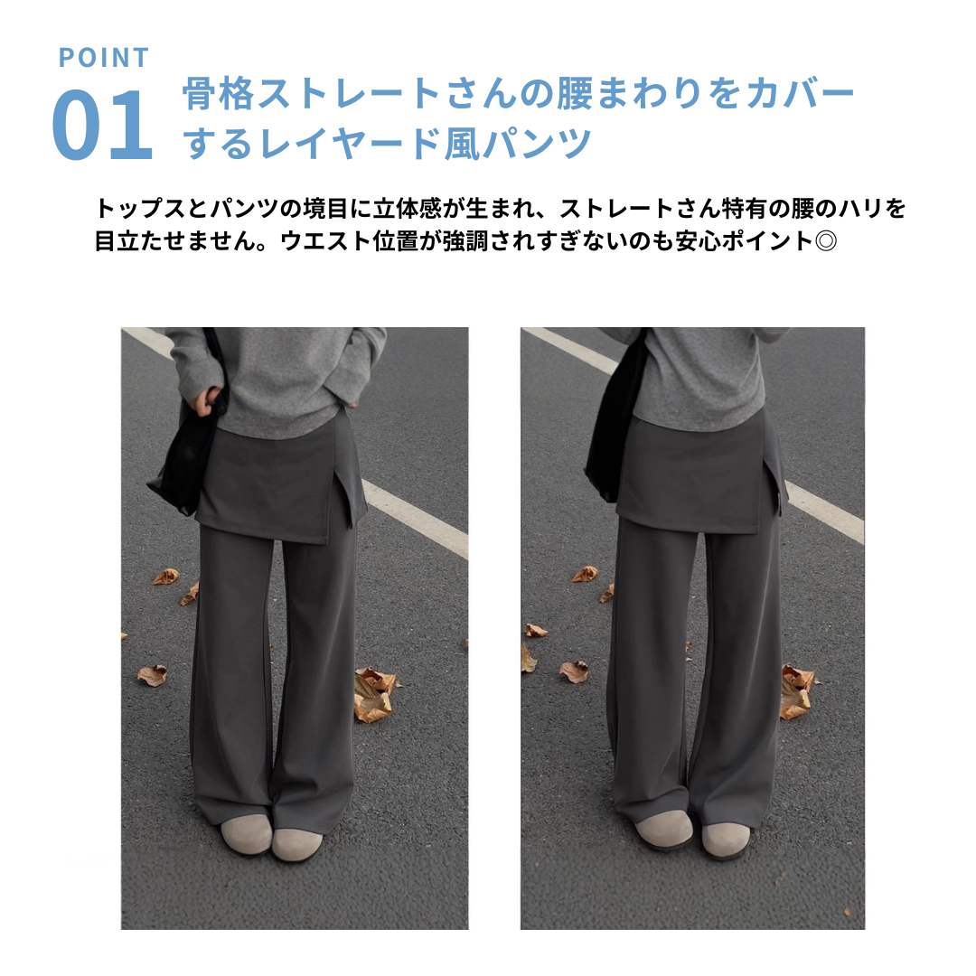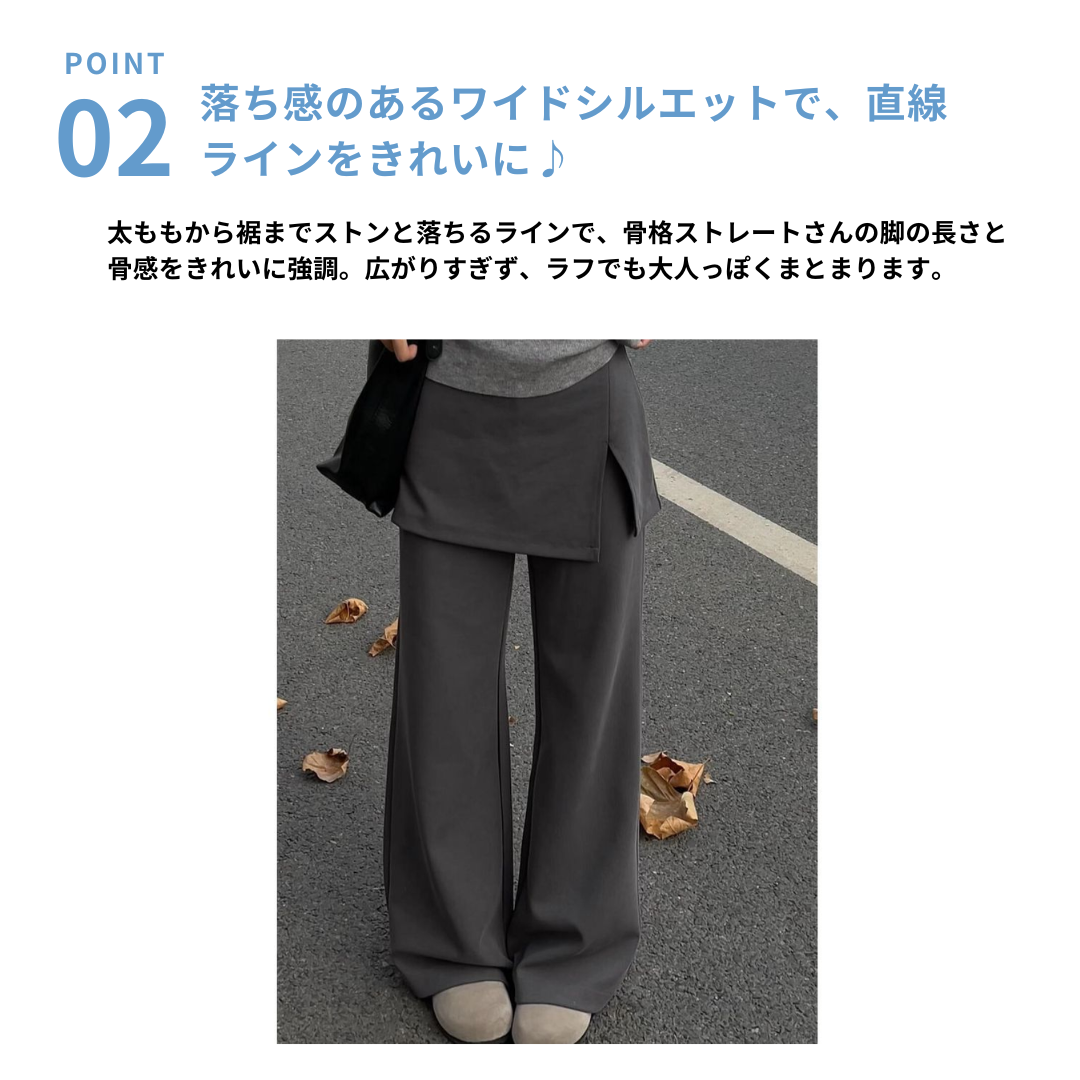 腰まわりの厚み・直線的な下半身ラインが悩みのストレートさんもレイヤードデザインで自然にカバーしてくれる一本。スカートを重ねたようなデザインが視線を分散し、ワイドパンツでも重たく見えにくい縦バランスをつくります。