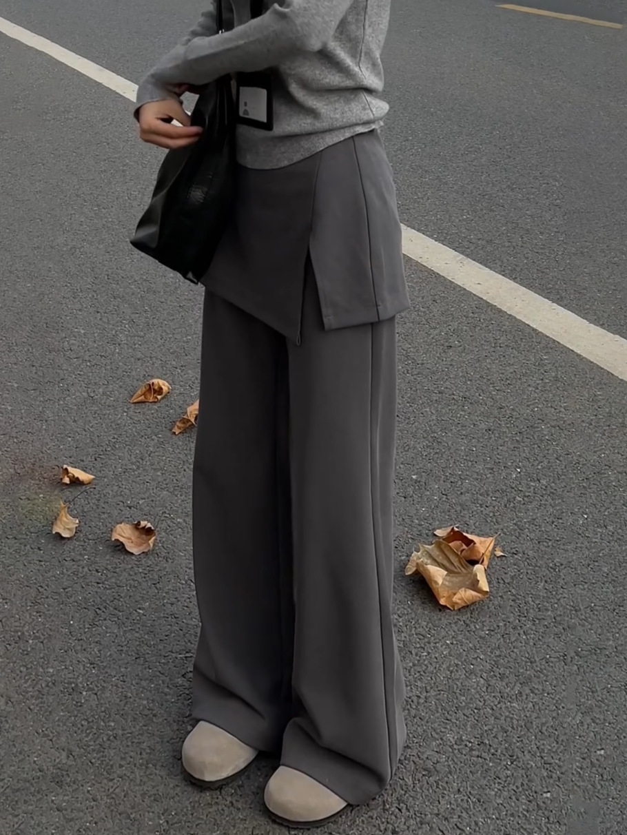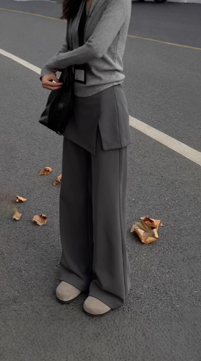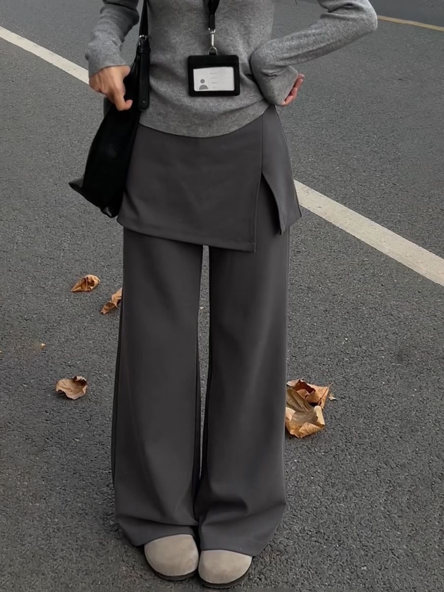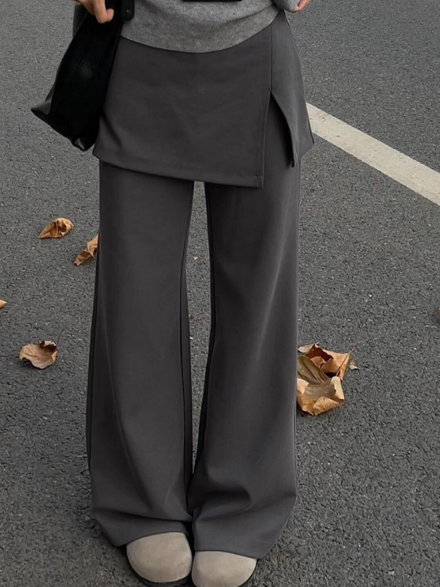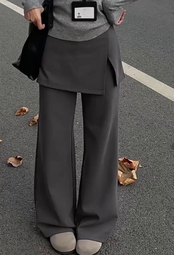 腰まわりの厚み・直線的な下半身ラインが悩みのストレートさんもレイヤードデザインで自然にカバーしてくれる一本。スカートを重ねたようなデザインが視線を分散し、ワイドパンツでも重たく見えにくい縦バランスをつくります。