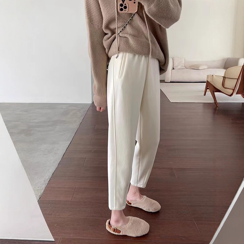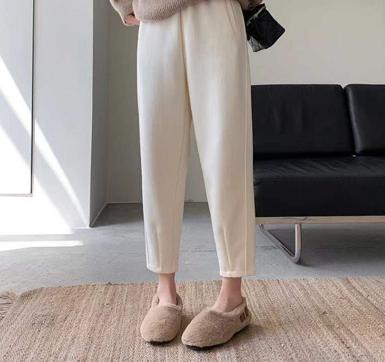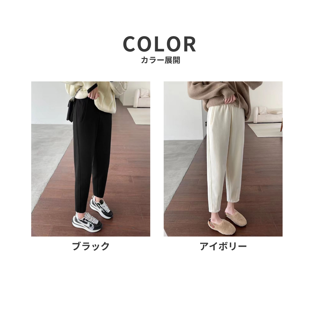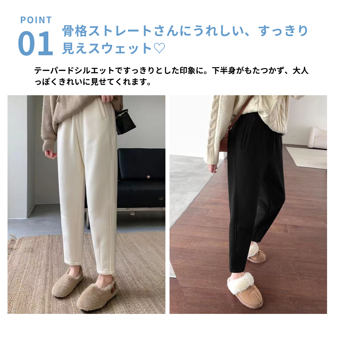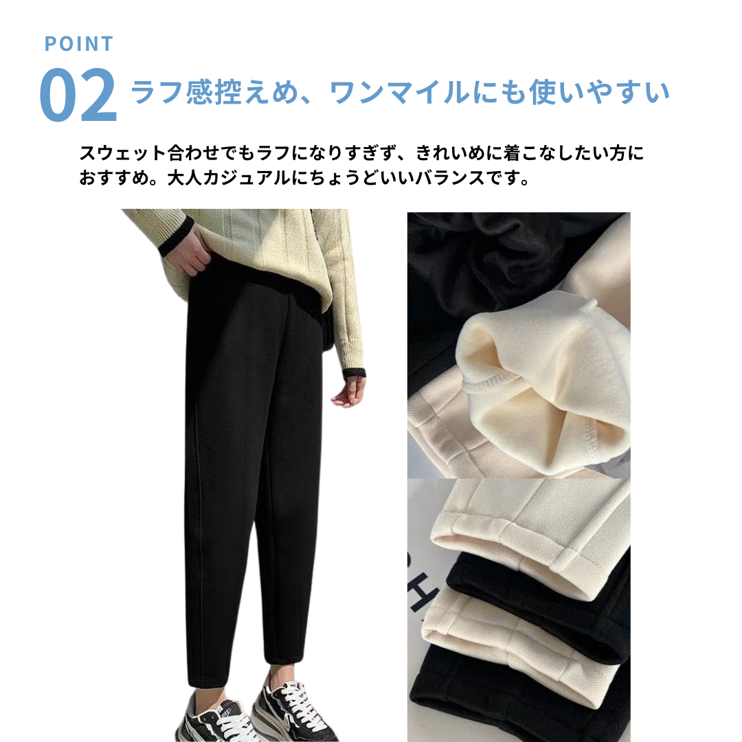 スウェット特有のラフ感・下半身のもたつきを抑え、部屋着っぽく見えないを叶えるテーパードパンツ。裏起毛のあたたかさはそのままに、縦ラインを意識したシルエットで、すっきり大人見えします。