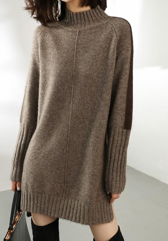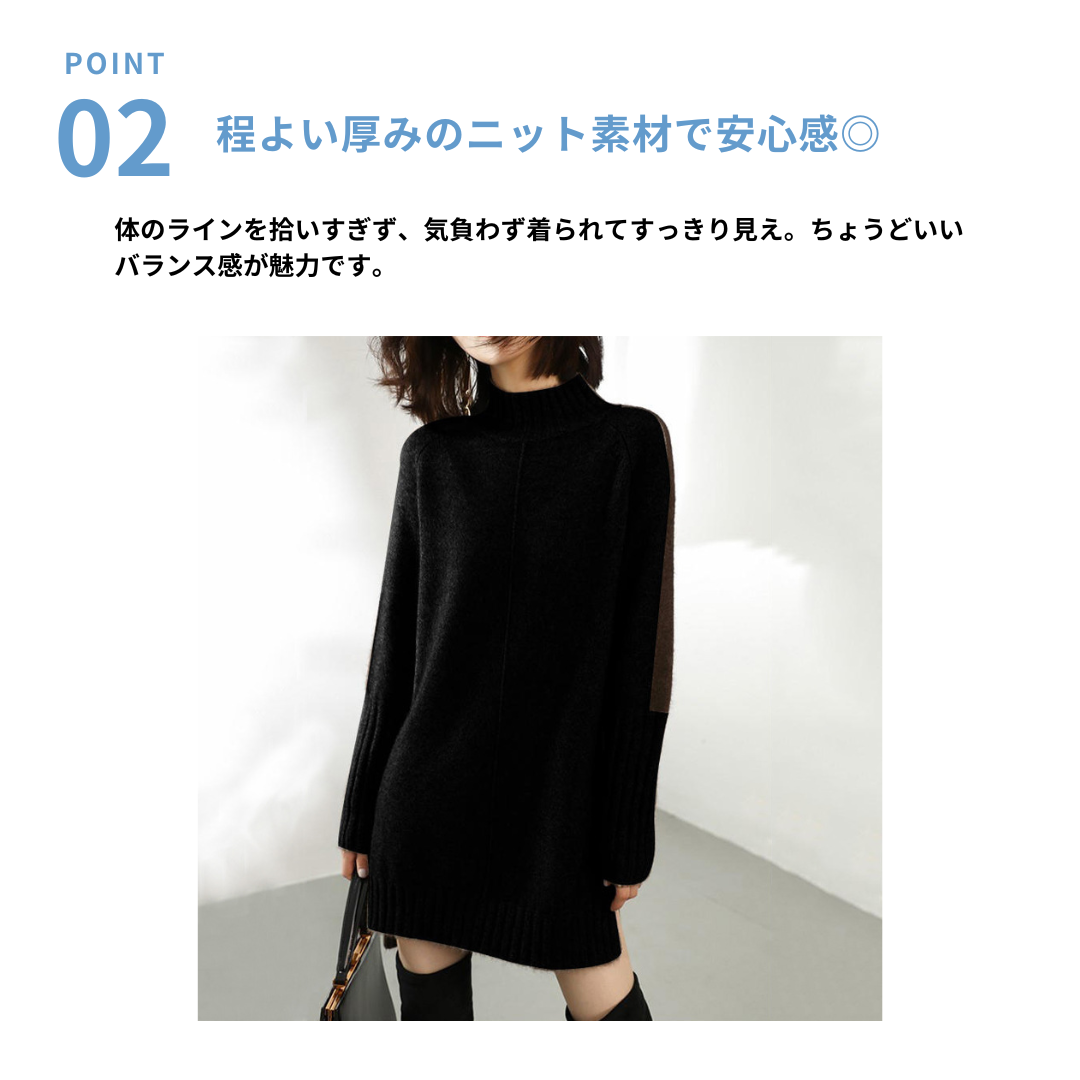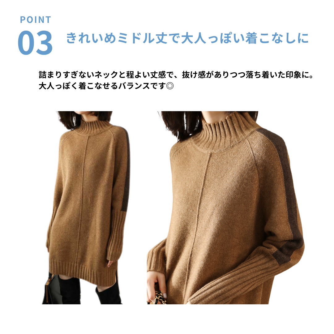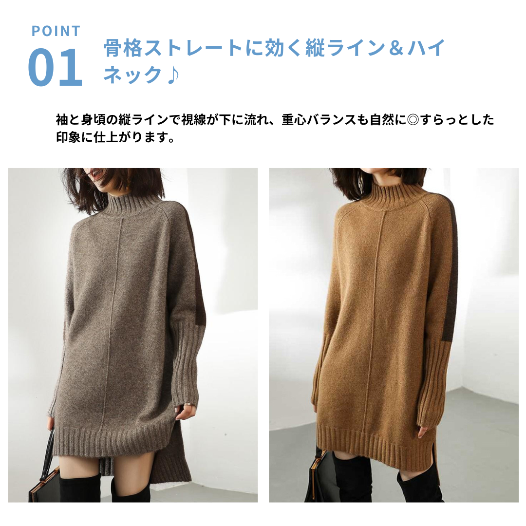上半身に厚みがあり、シンプルで縦のラインが映える骨格ストレートさんにおすすめの一枚。身頃中央の切り替えと、袖に入った縦ラインで視線を下へ流し、体の立体感をすっきり整理して見せてくれます。程よくハリのあるニット素材で体のラインを拾いにくく、Iラインシルエットを自然にキープ。首元は詰まりすぎないハイネックで、上半身が間延びせず、落ち着いた大人の印象に仕上がります。