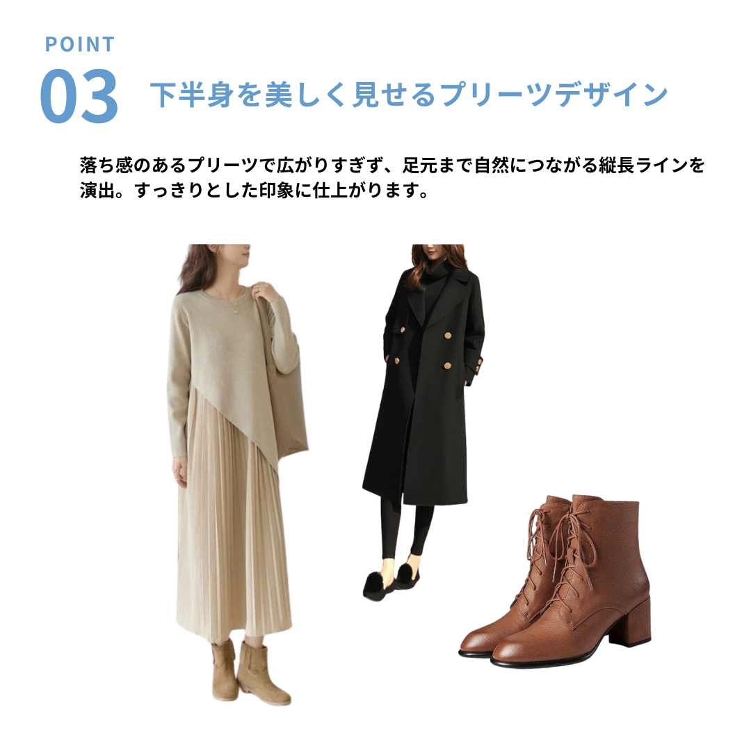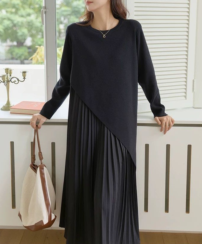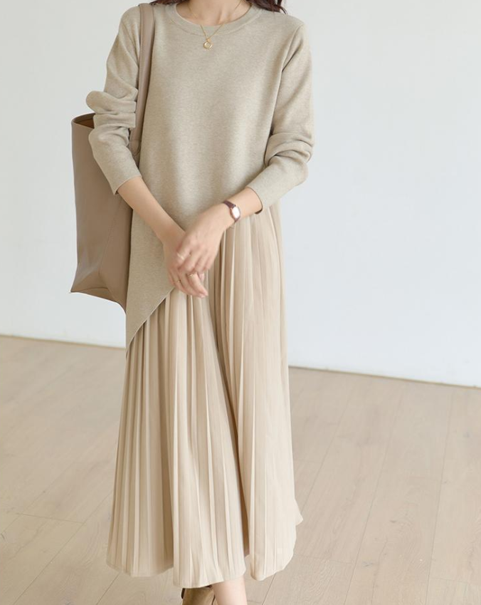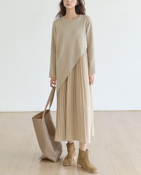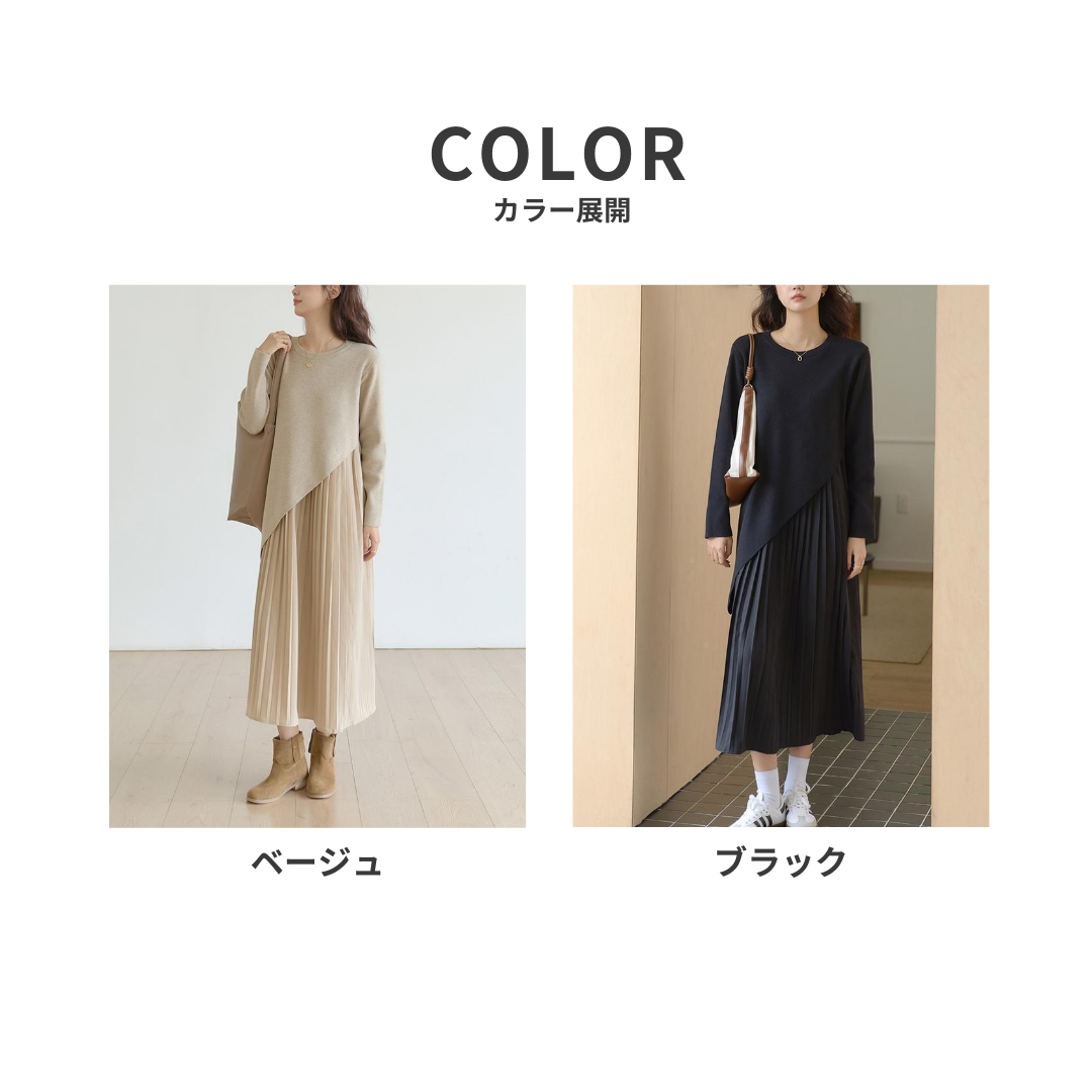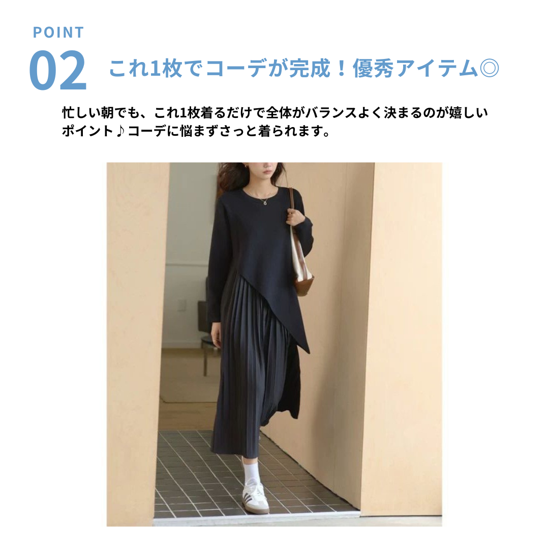 トップスとスカートが一体化した異素材切替デザインが、縦のラインを強調し、骨格ストレートさんの立体的な体型をすっきりと見せてくれる一着です。上半身は程よくハリのあるニット素材で体の厚みを拾いにくく、下半身は落ち感のあるプリーツが縦長効果をプラス。シンプルながらもきちんと感があり、体型を整えつつ上品な印象に仕上がります。忙しい日でもコーデが即完成するのも嬉しいポイントです。