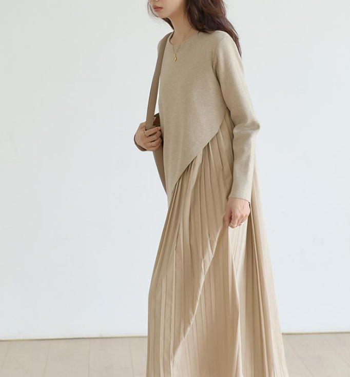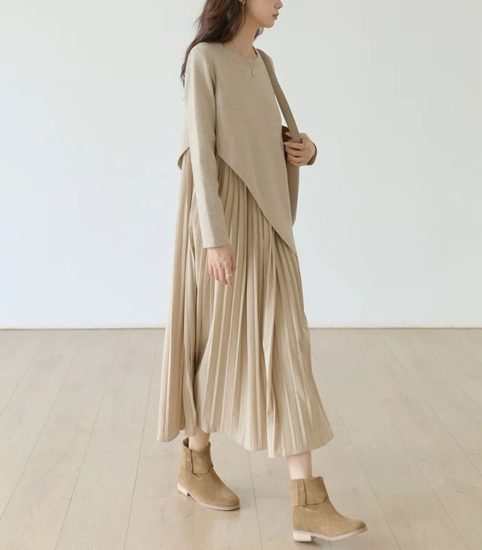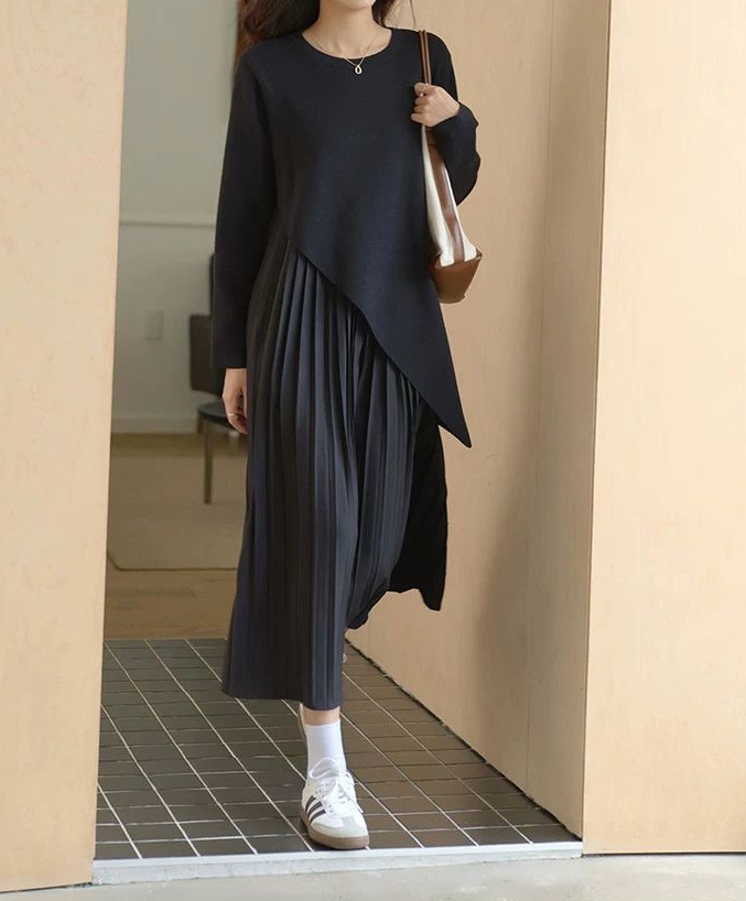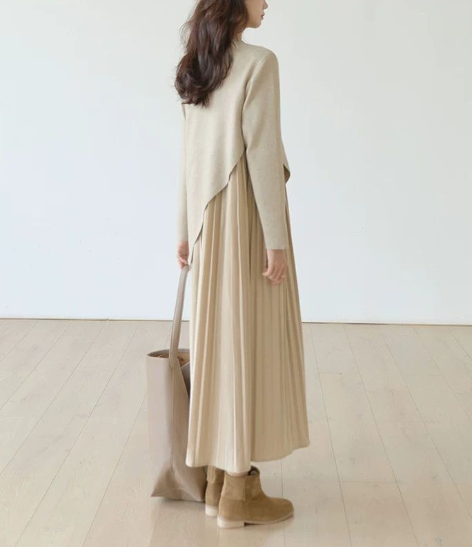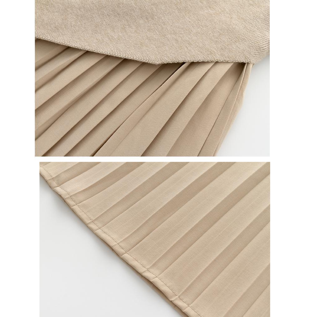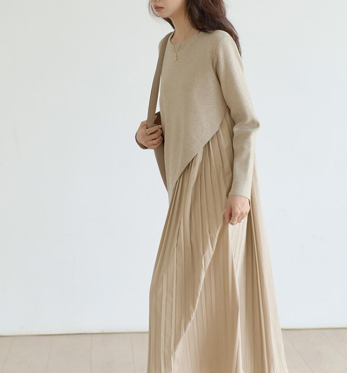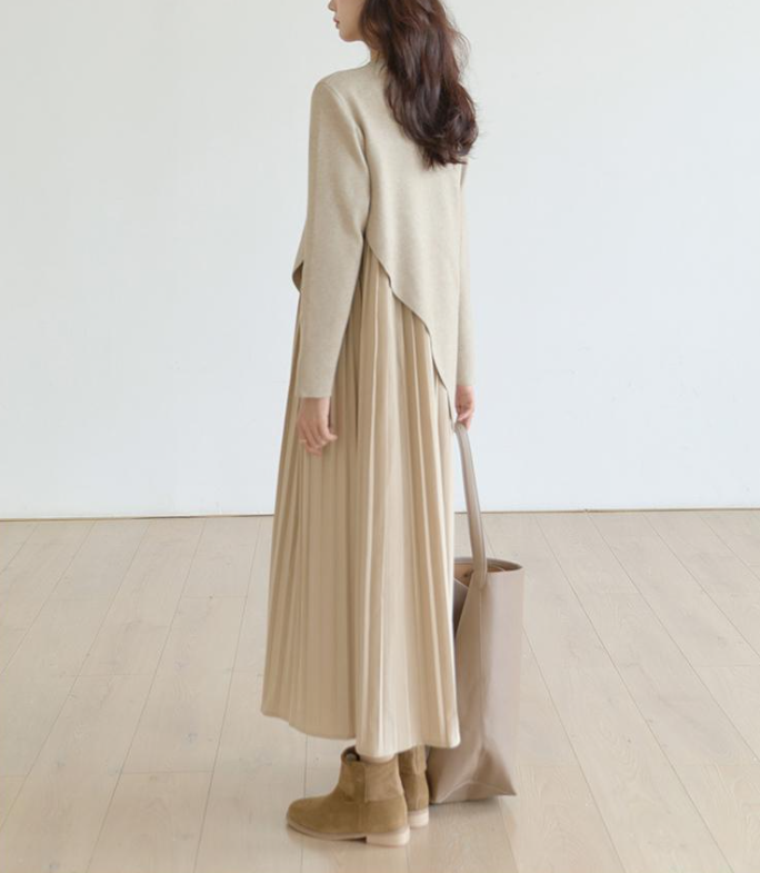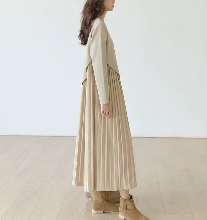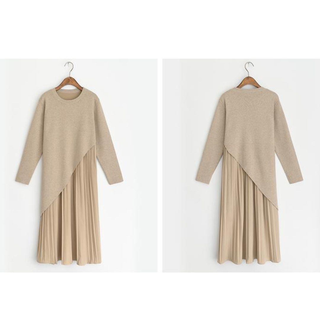 トップスとスカートが一体化した異素材切替デザインが、縦のラインを強調し、骨格ストレートさんの立体的な体型をすっきりと見せてくれる一着です。上半身は程よくハリのあるニット素材で体の厚みを拾いにくく、下半身は落ち感のあるプリーツが縦長効果をプラス。シンプルながらもきちんと感があり、体型を整えつつ上品な印象に仕上がります。忙しい日でもコーデが即完成するのも嬉しいポイントです。
