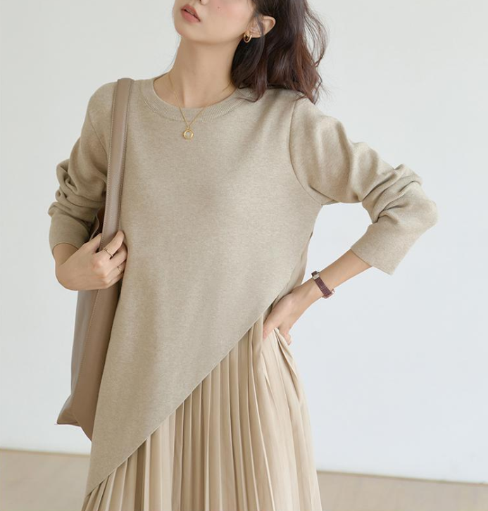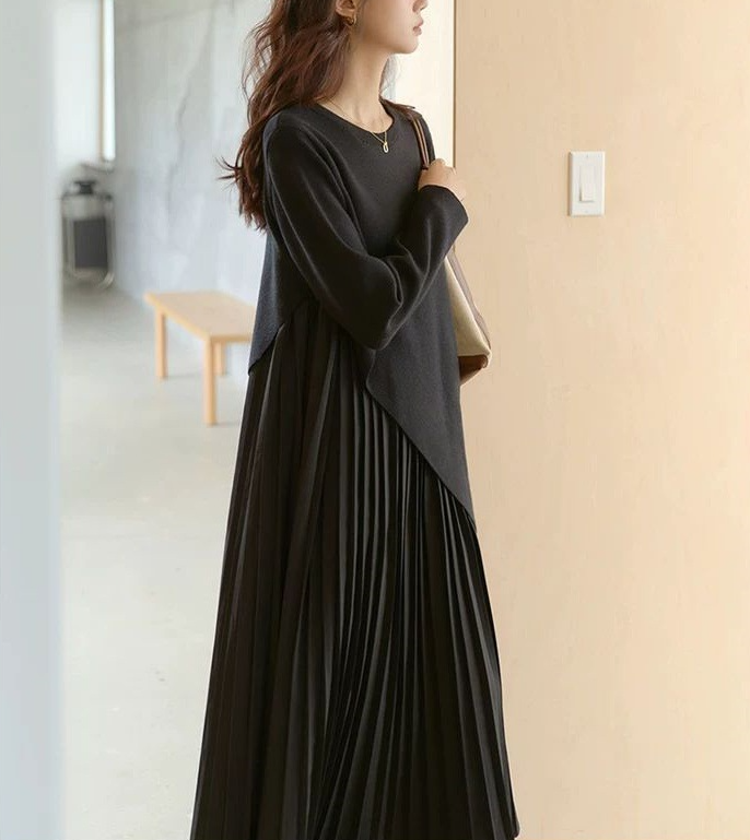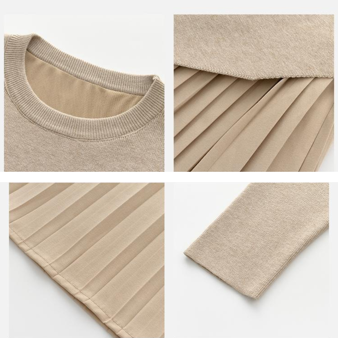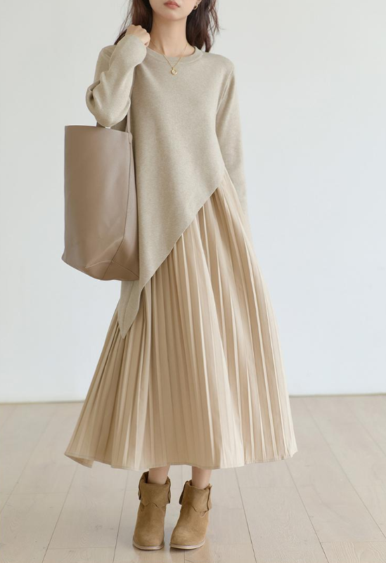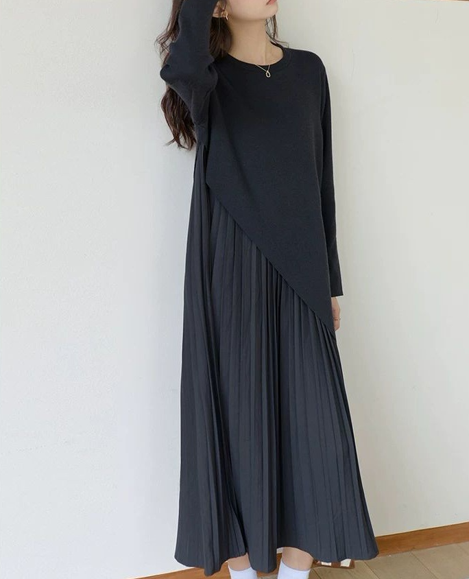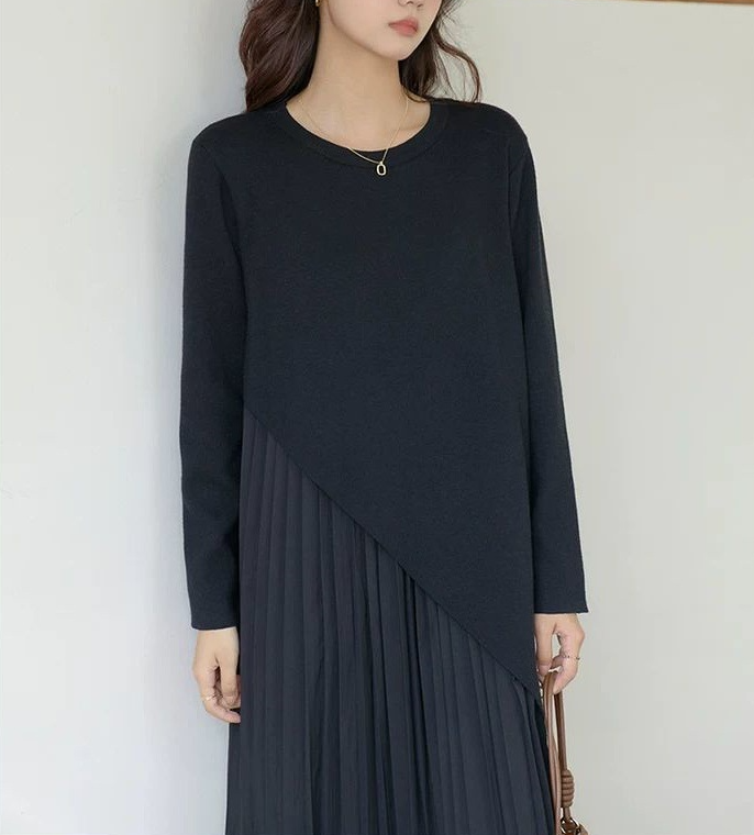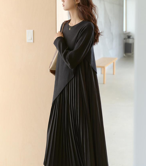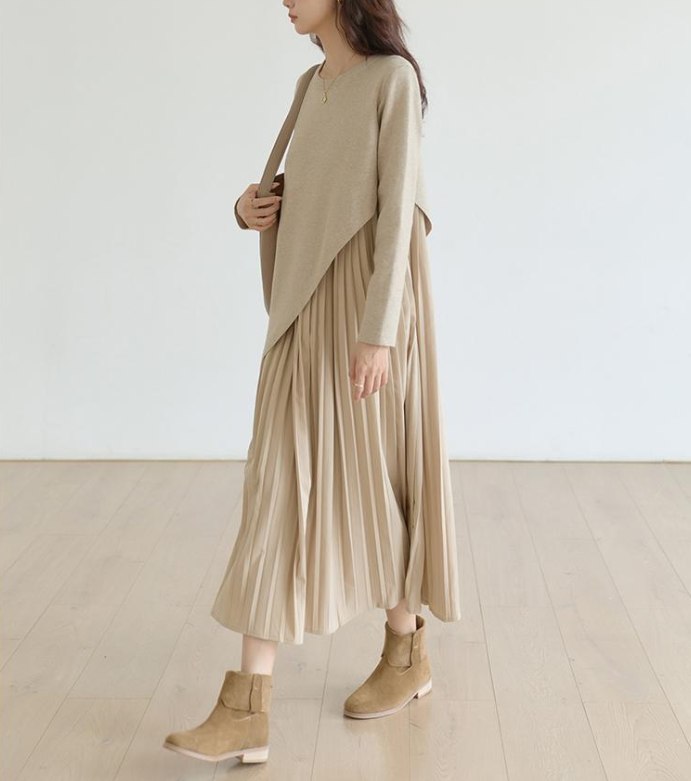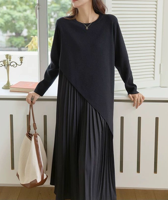 トップスとスカートが一体化した異素材切替デザインが、縦のラインを強調し、骨格ストレートさんの立体的な体型をすっきりと見せてくれる一着です。上半身は程よくハリのあるニット素材で体の厚みを拾いにくく、下半身は落ち感のあるプリーツが縦長効果をプラス。シンプルながらもきちんと感があり、体型を整えつつ上品な印象に仕上がります。忙しい日でもコーデが即完成するのも嬉しいポイントです。