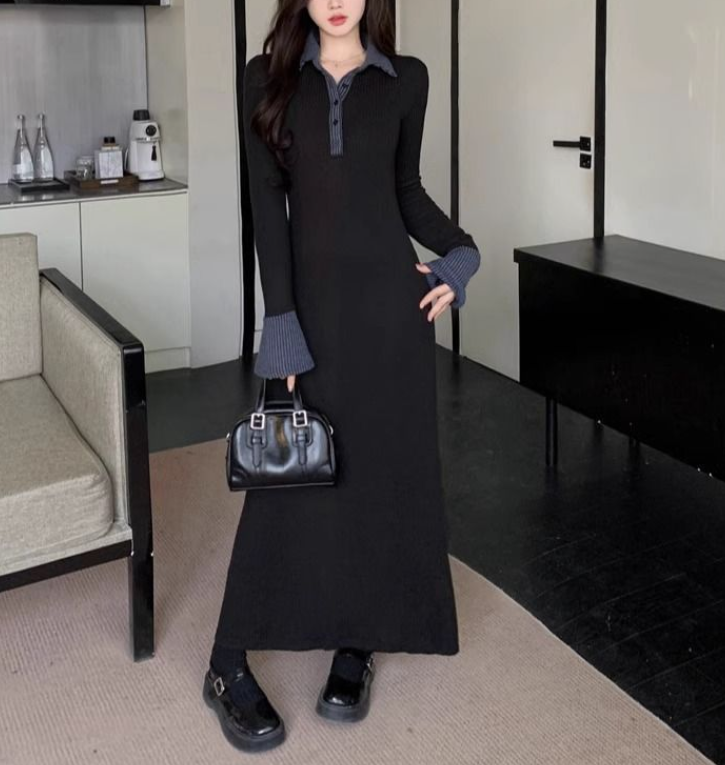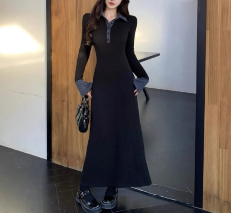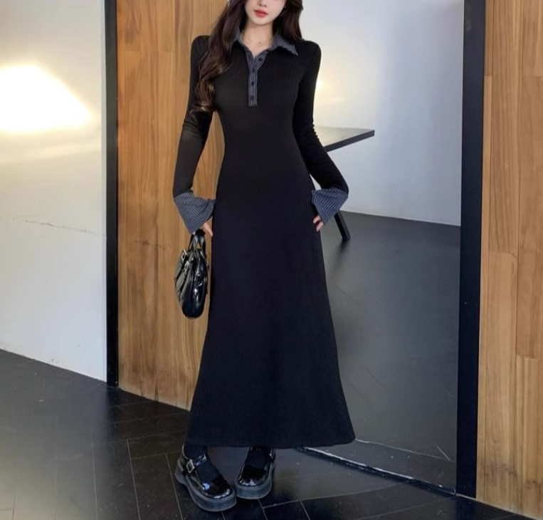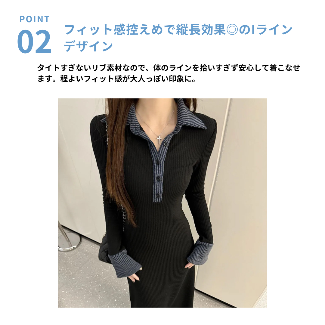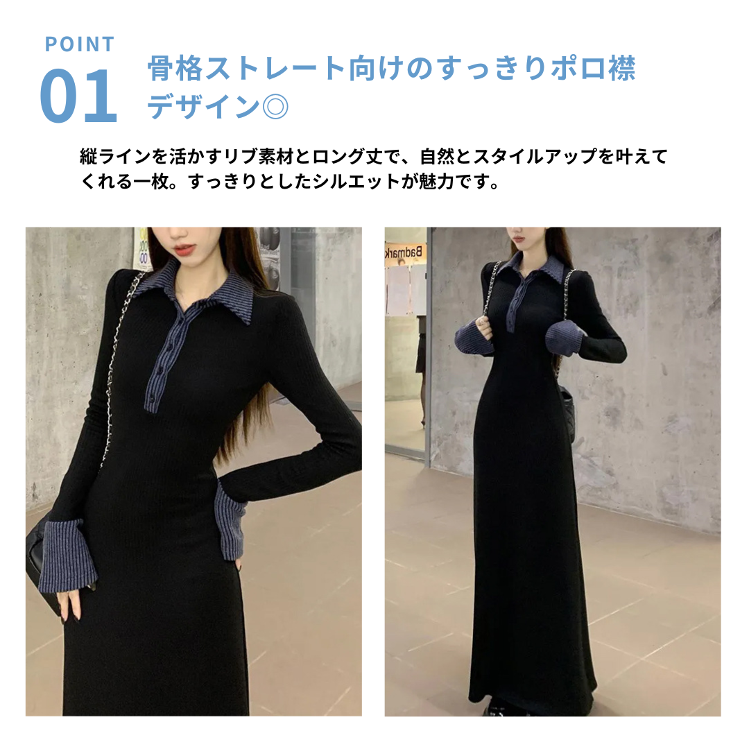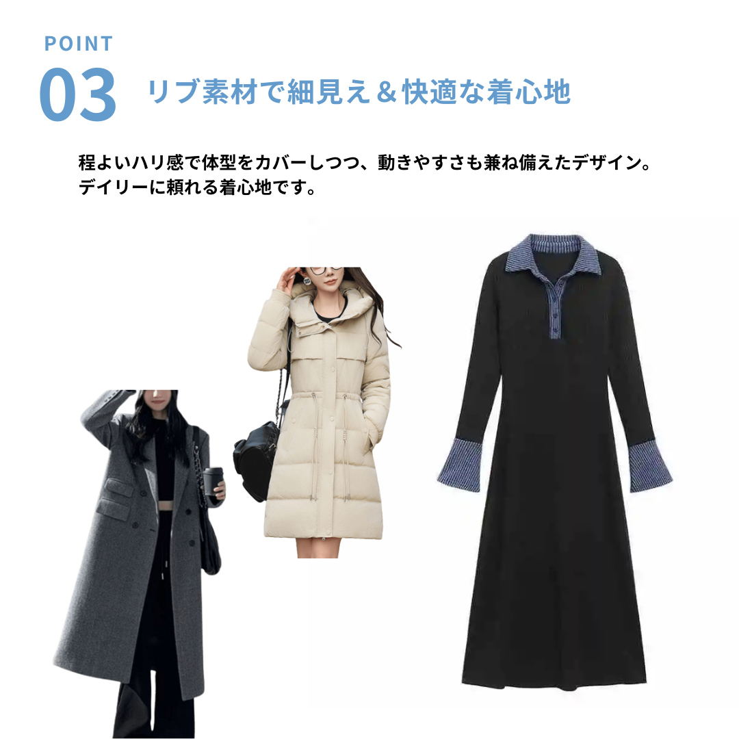 縦ラインを美しく引き立てる、ポロ衿デザインのリブニットワンピース。程よくフィットしながらも身体の厚みを拾いすぎない設計で、骨格ストレートさんの立体的な体型をすっきりと見せてくれます。Iラインを強調するロング丈が縦長バランスを演出し、自然とスタイルアップ。装飾を抑えたシンプルなデザインだから、きれいめにもカジュアルにも対応し、1枚で“きちんと感”が完成する頼れるワンピースです。