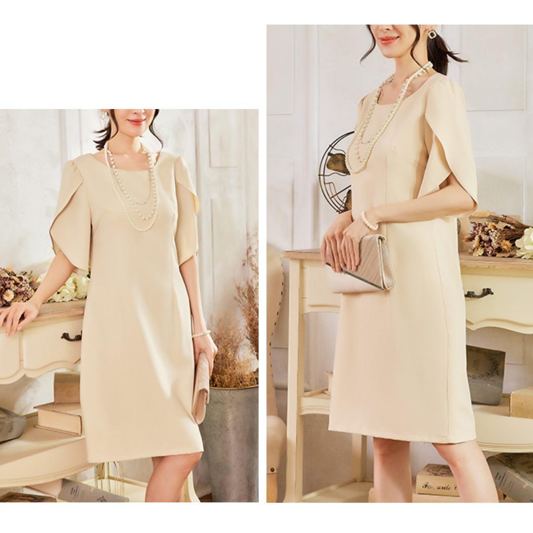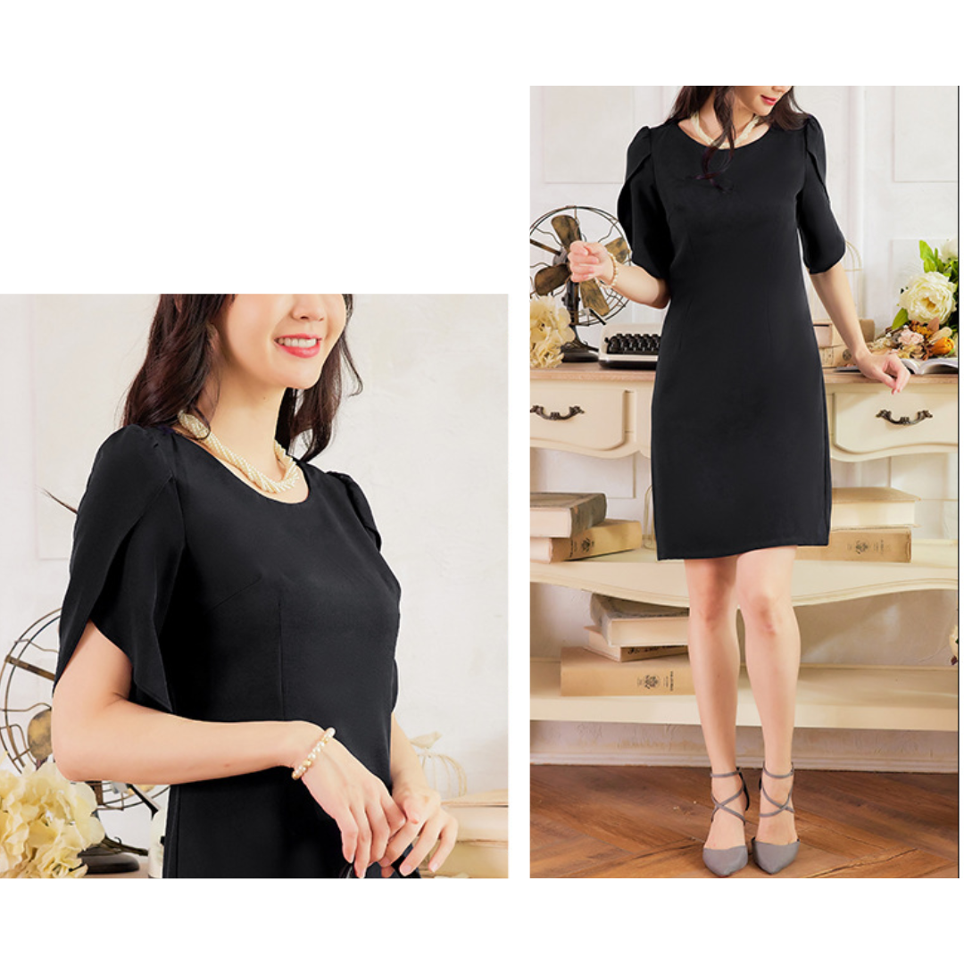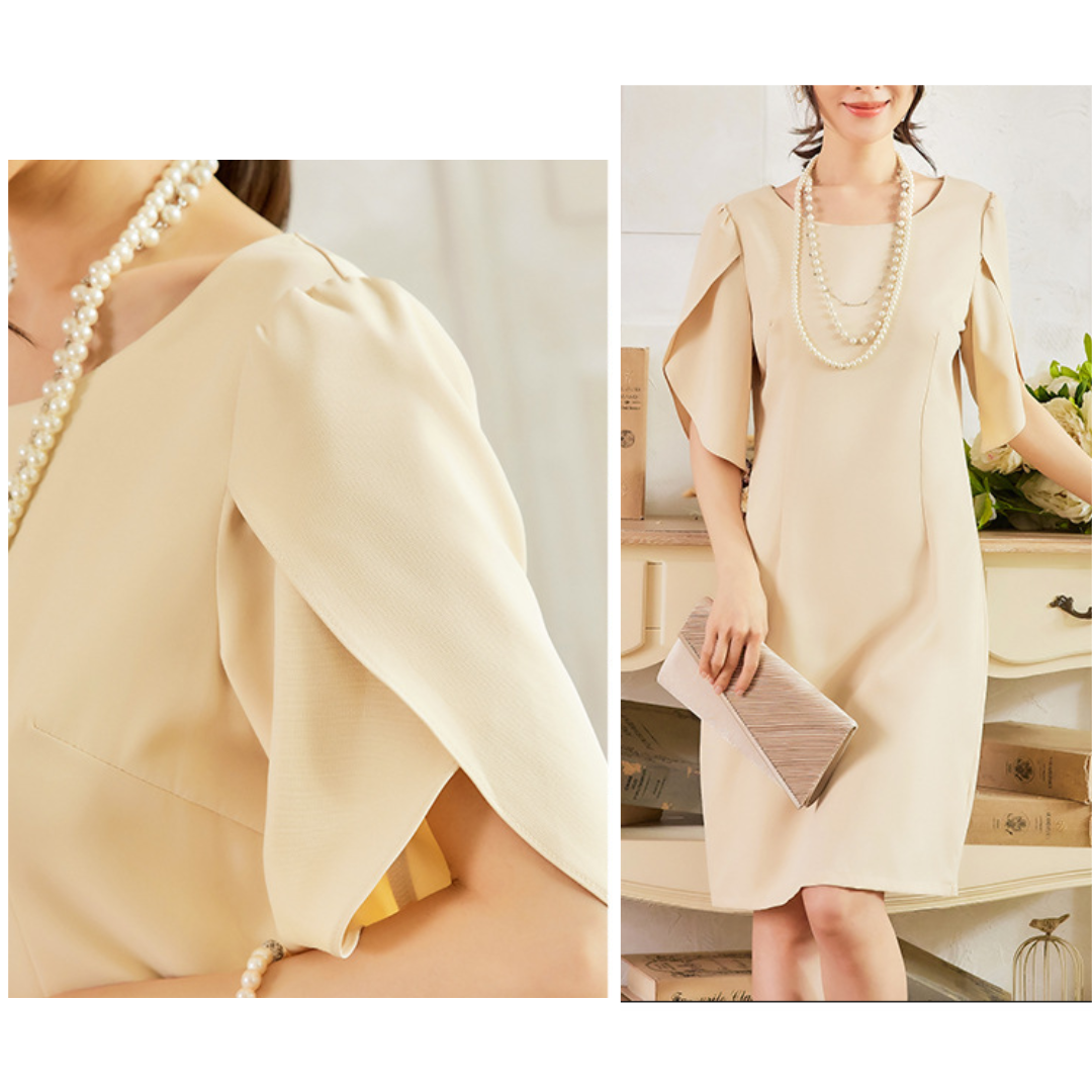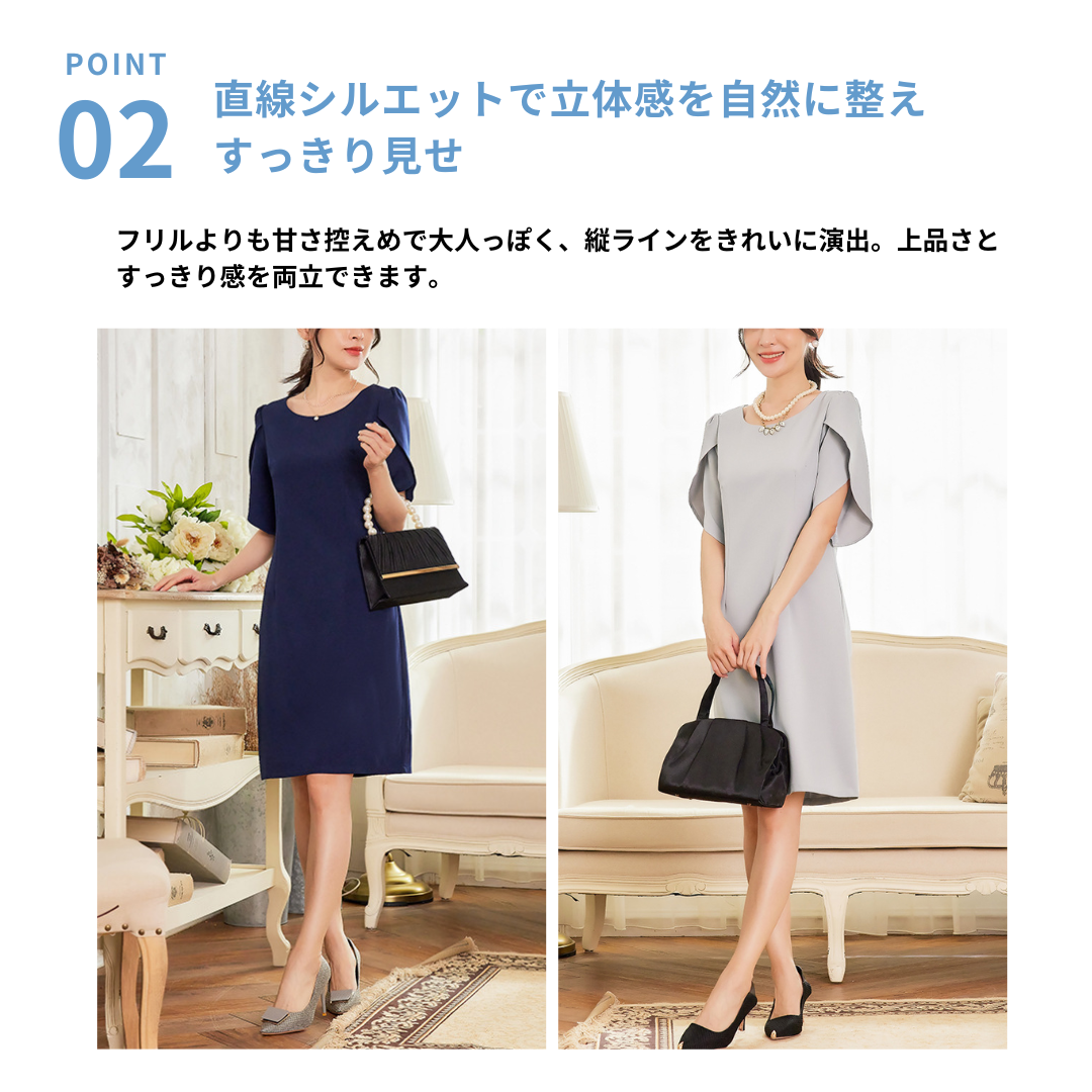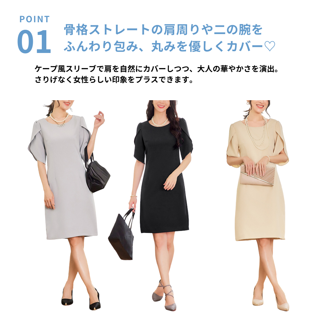 上半身に厚みが出やすい骨格ストレートさんに配慮した、縦ラインを意識したきれいめワンピース。身頃は直線的で無駄な広がりを抑え、体の立体感を活かしながらすっきりとした印象に導きます。特徴的なケープ風スリーブは、フリルほど甘くならない構築的な重なりデザイン。肩まわりを自然にカバーしつつ、華やかさをプラスします。フォーマルからきれいめなお呼ばれまで、品よく着映える一着です。