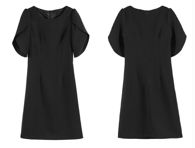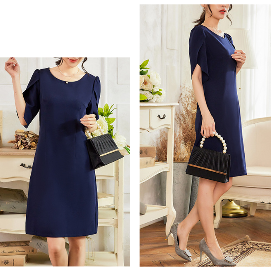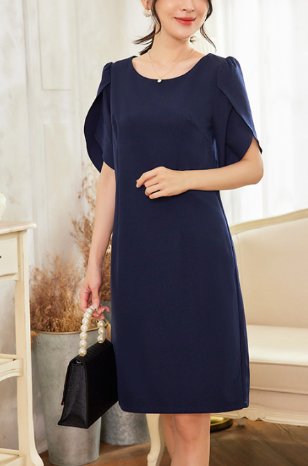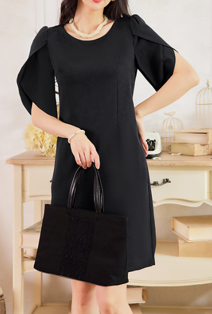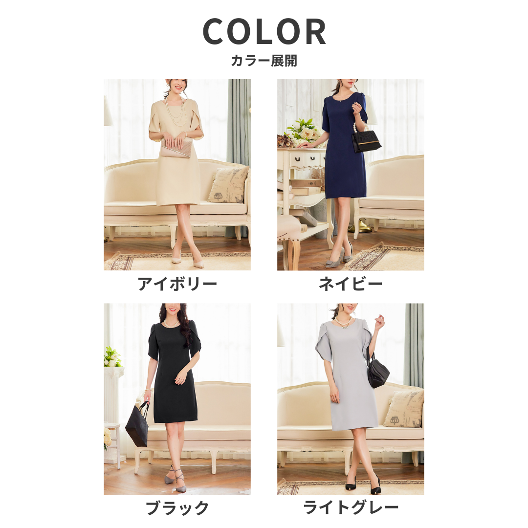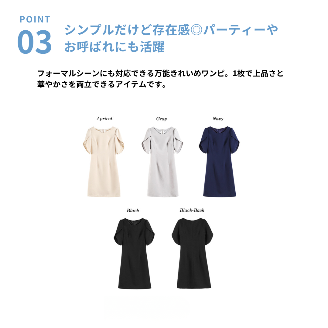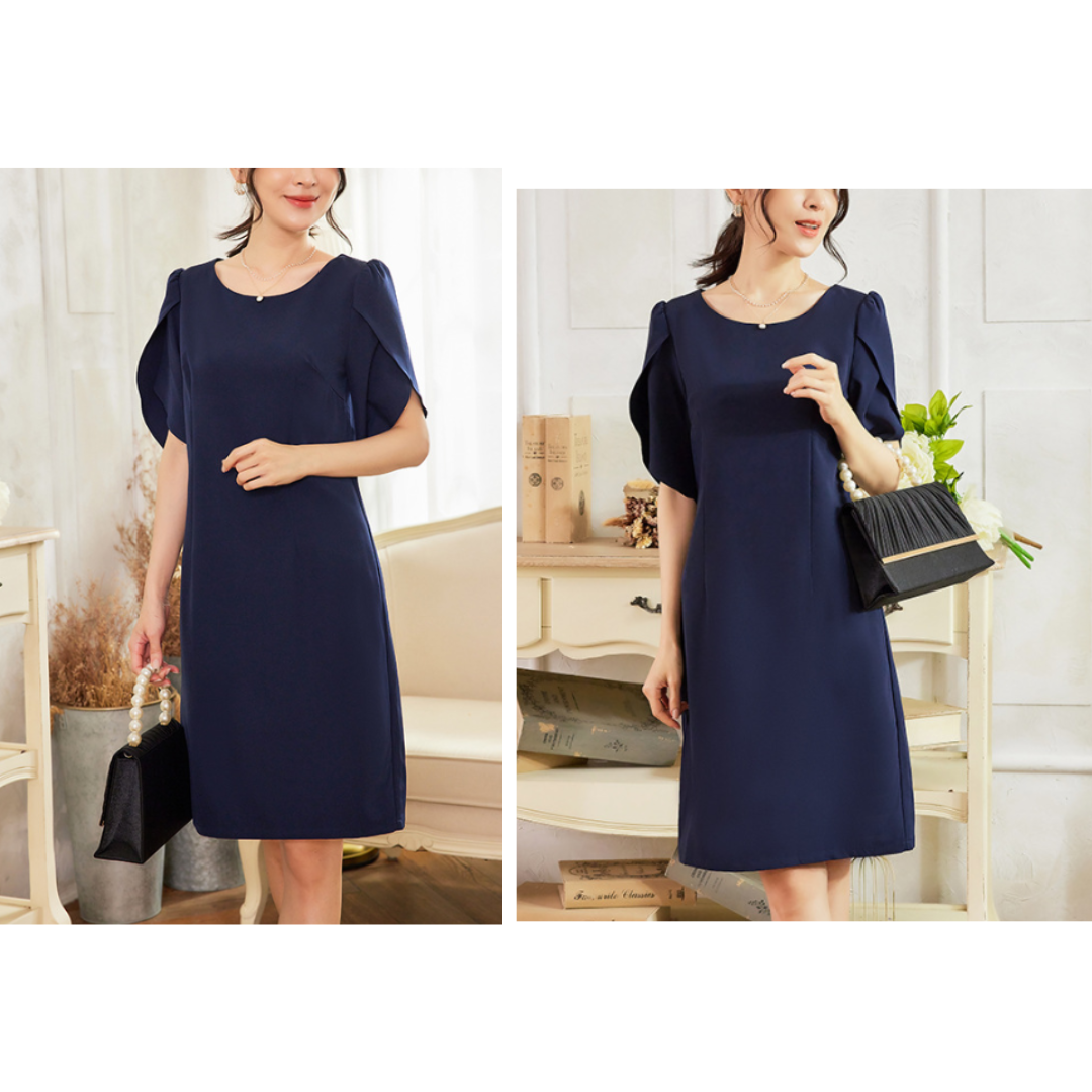 上半身に厚みが出やすい骨格ストレートさんに配慮した、縦ラインを意識したきれいめワンピース。身頃は直線的で無駄な広がりを抑え、体の立体感を活かしながらすっきりとした印象に導きます。特徴的なケープ風スリーブは、フリルほど甘くならない構築的な重なりデザイン。肩まわりを自然にカバーしつつ、華やかさをプラスします。フォーマルからきれいめなお呼ばれまで、品よく着映える一着です。