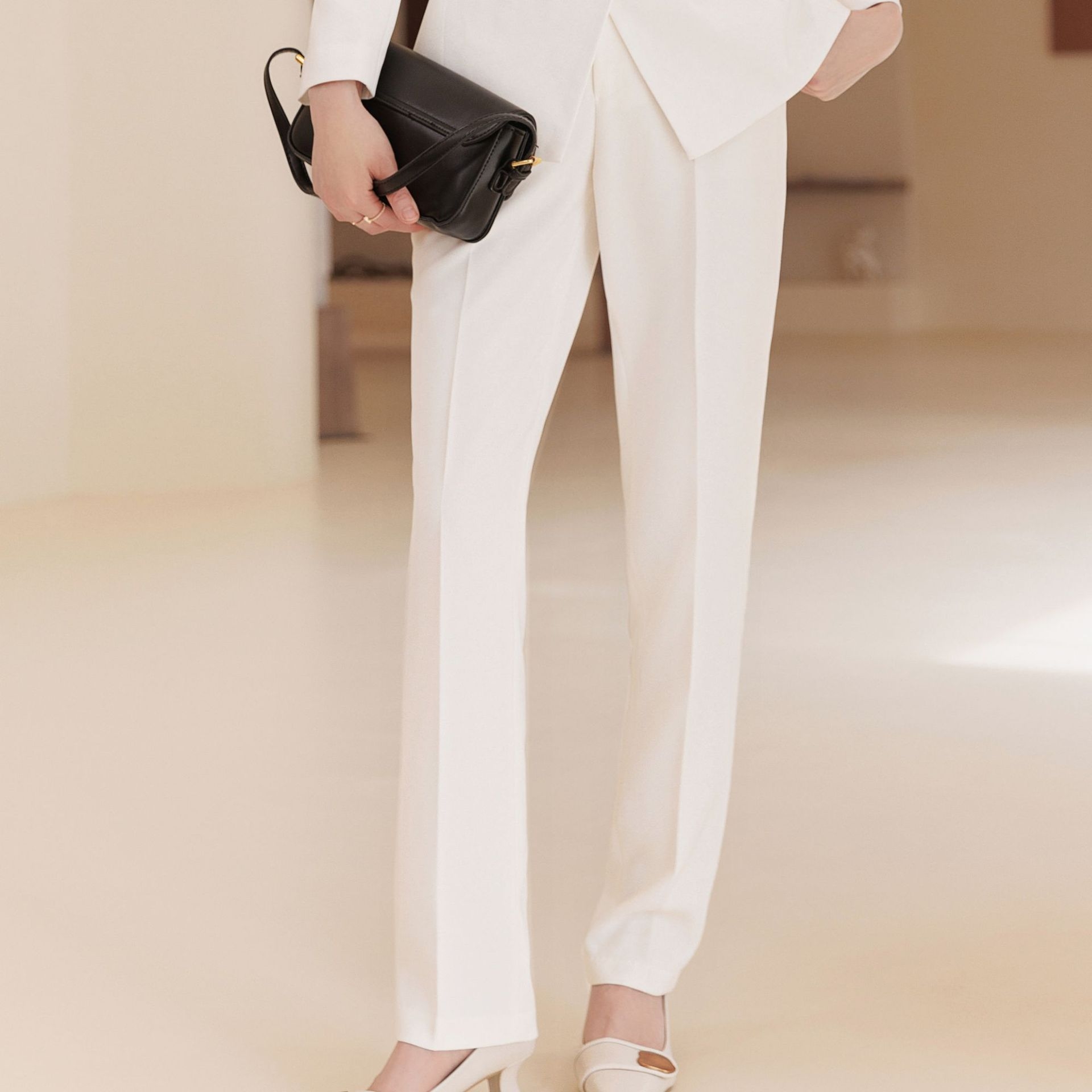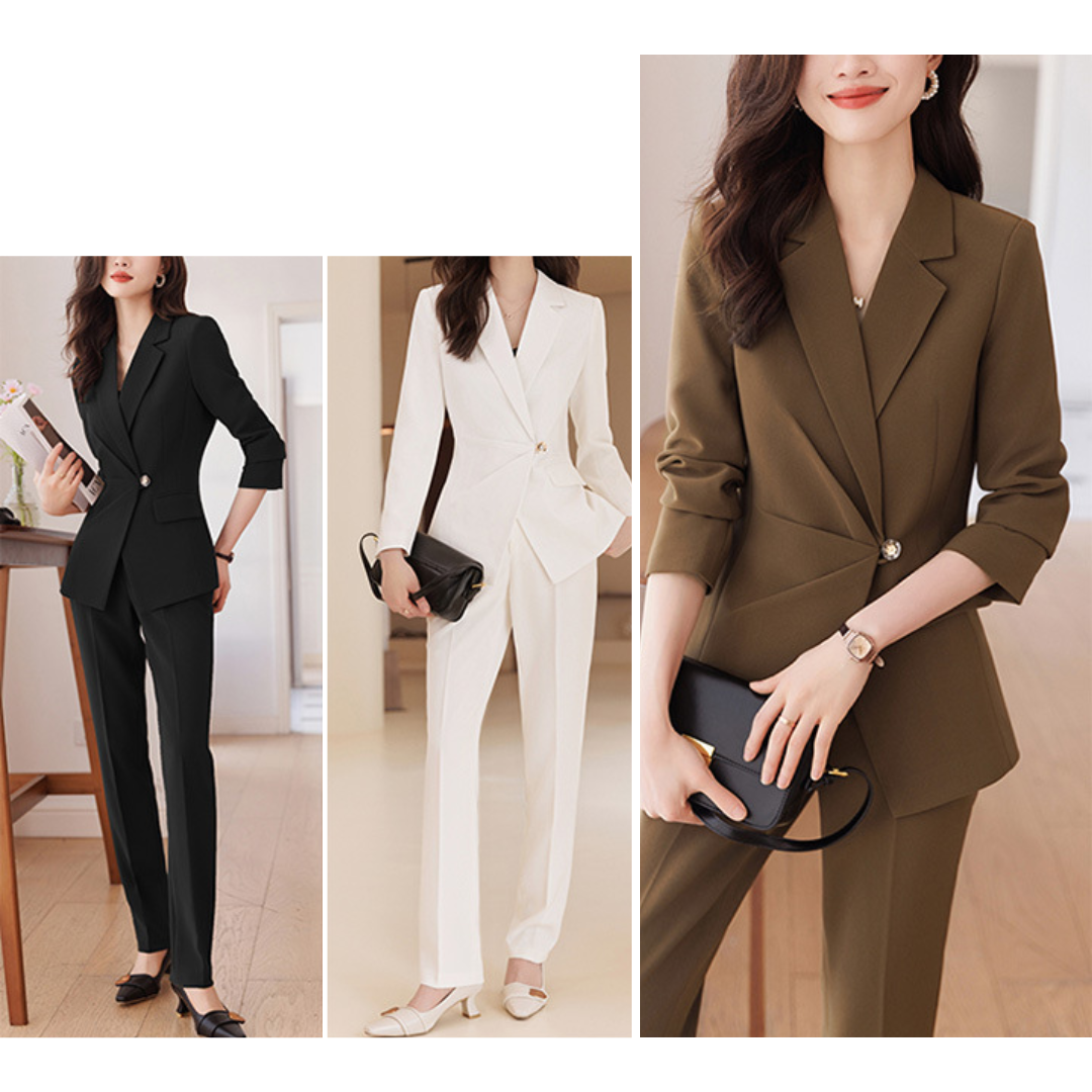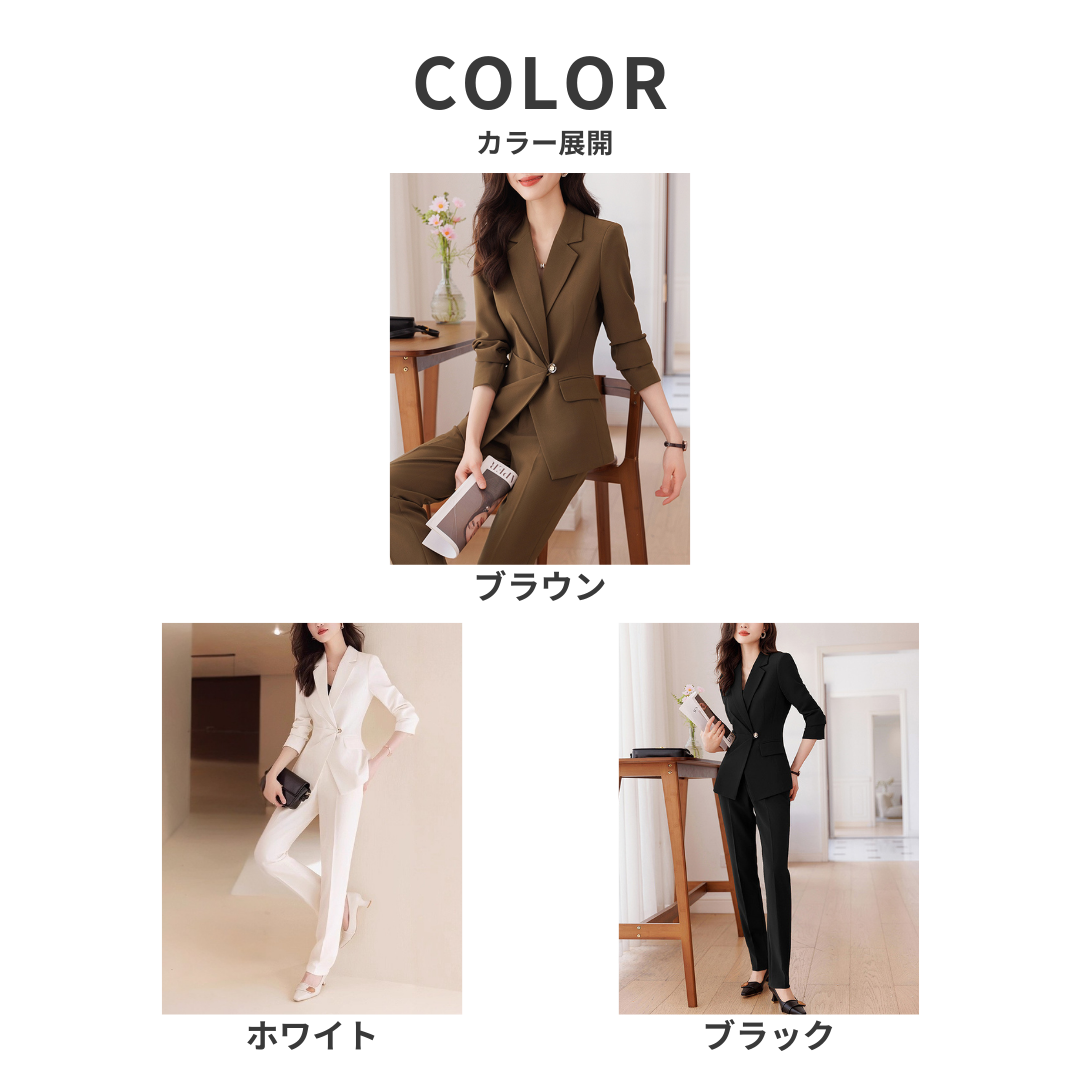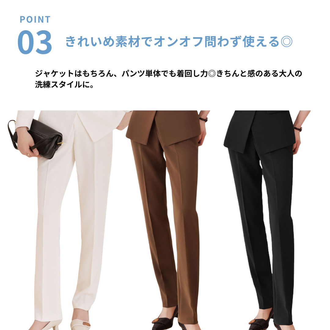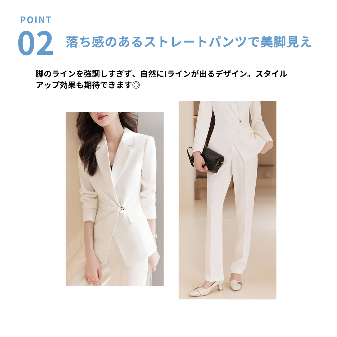 上半身に厚みがあり立体的な骨格ストレートさんにフィットする、端正で洗練されたセットアップ。テーラードジャケットの直線的なカッティングが体のラインをきれいに見せ、ウエストのワンポイントデザインが縦ラインを強調します。パンツは程よく落ち感のあるストレートシルエットで、脚のラインをまっすぐ見せつつ上品な印象に。ハリのあるきれいめ素材が、きちんと感とスタイルアップを同時に叶える一着です。