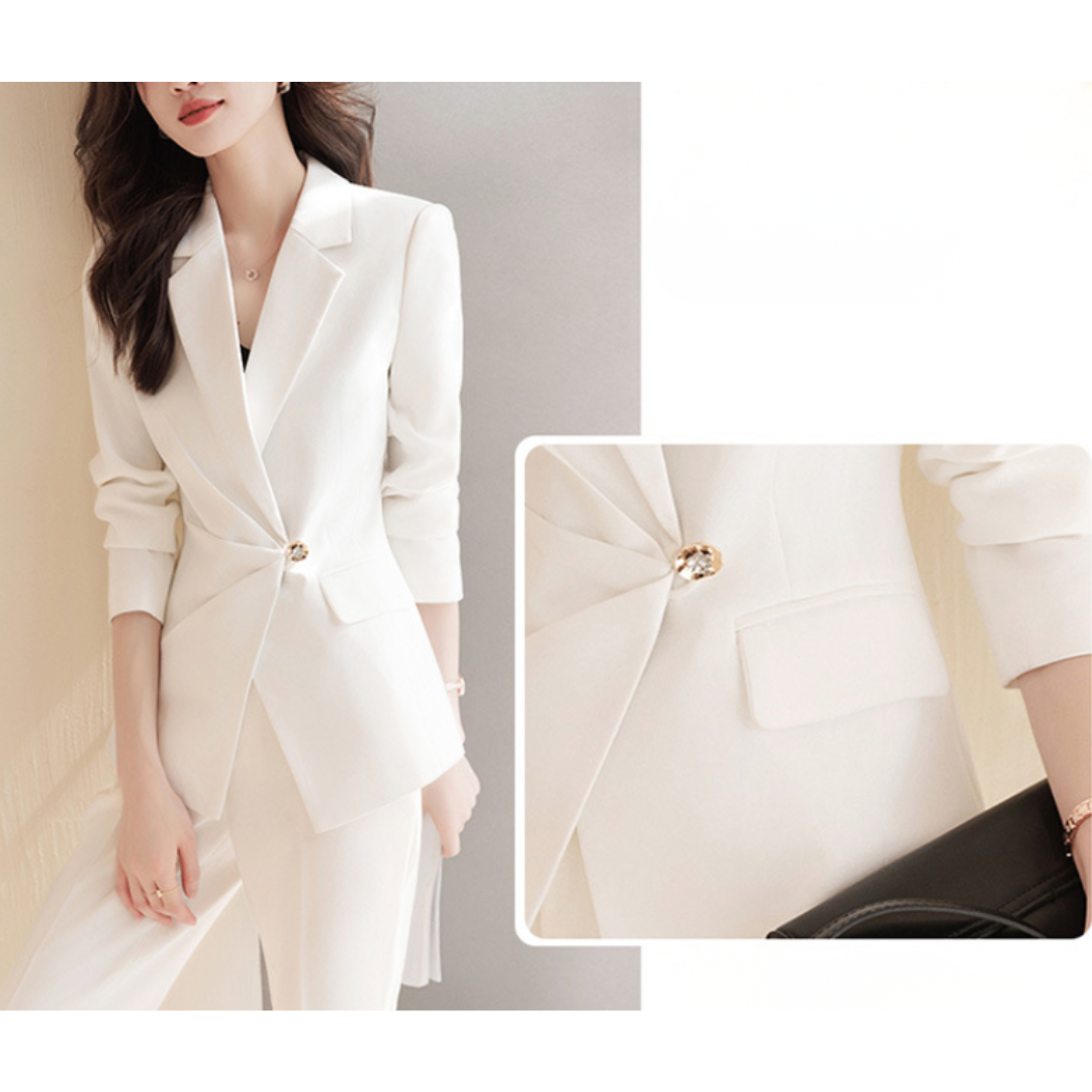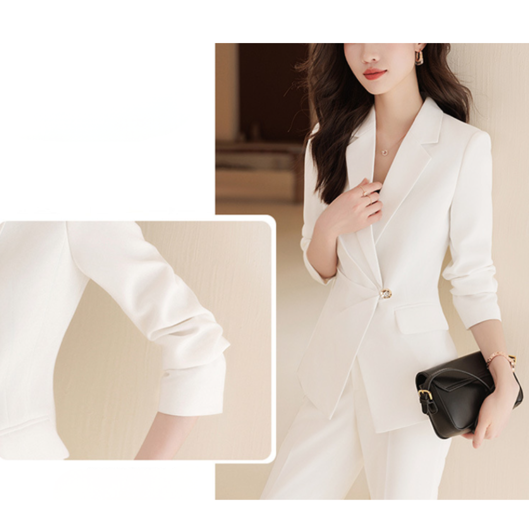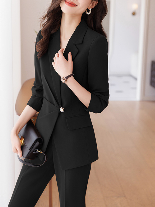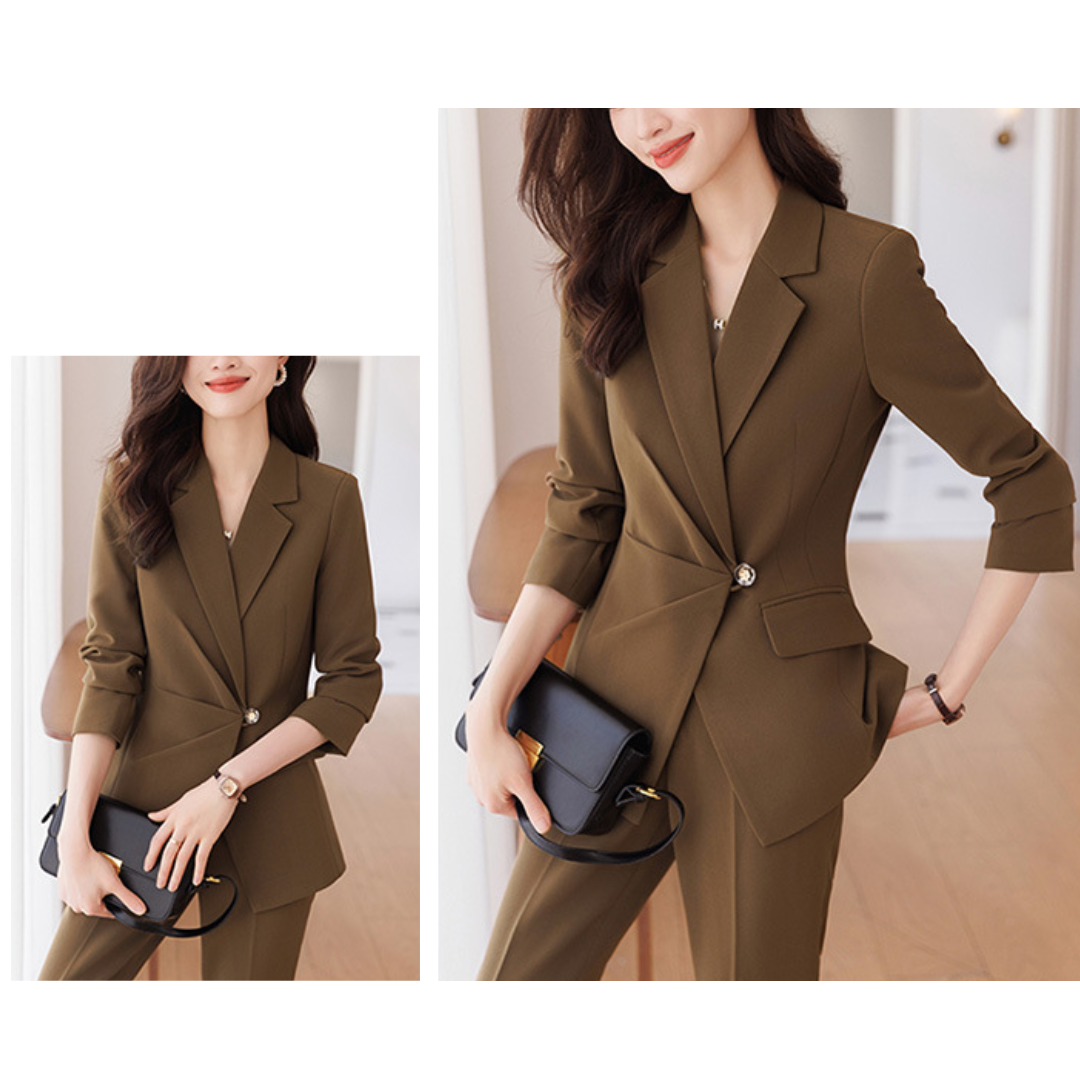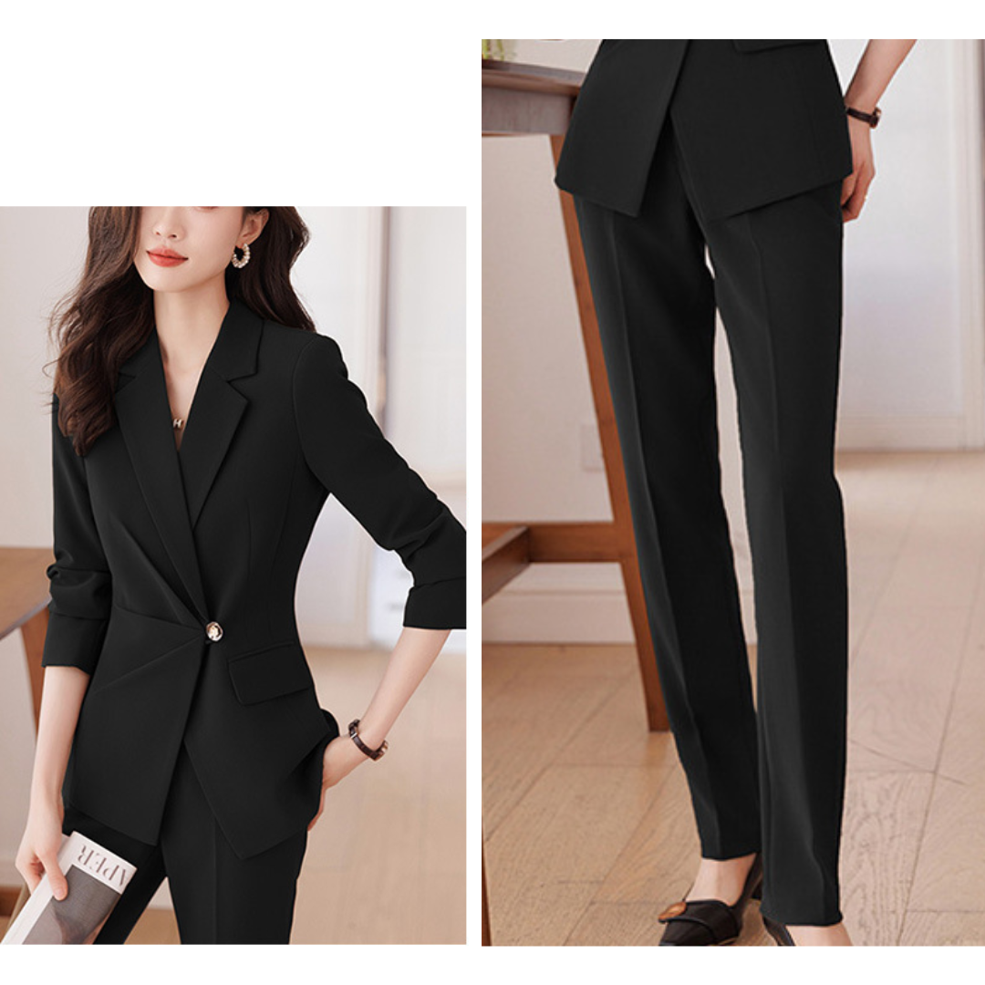 上半身に厚みがあり立体的な骨格ストレートさんにフィットする、端正で洗練されたセットアップ。テーラードジャケットの直線的なカッティングが体のラインをきれいに見せ、ウエストのワンポイントデザインが縦ラインを強調します。パンツは程よく落ち感のあるストレートシルエットで、脚のラインをまっすぐ見せつつ上品な印象に。ハリのあるきれいめ素材が、きちんと感とスタイルアップを同時に叶える一着です。