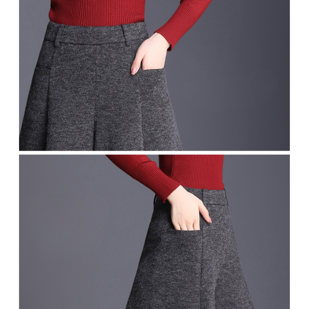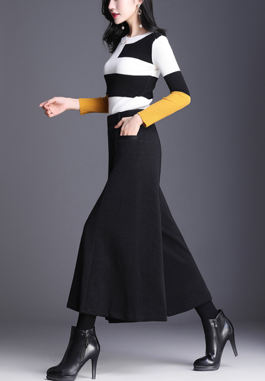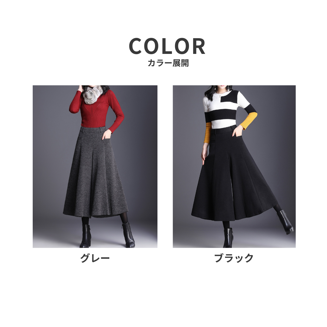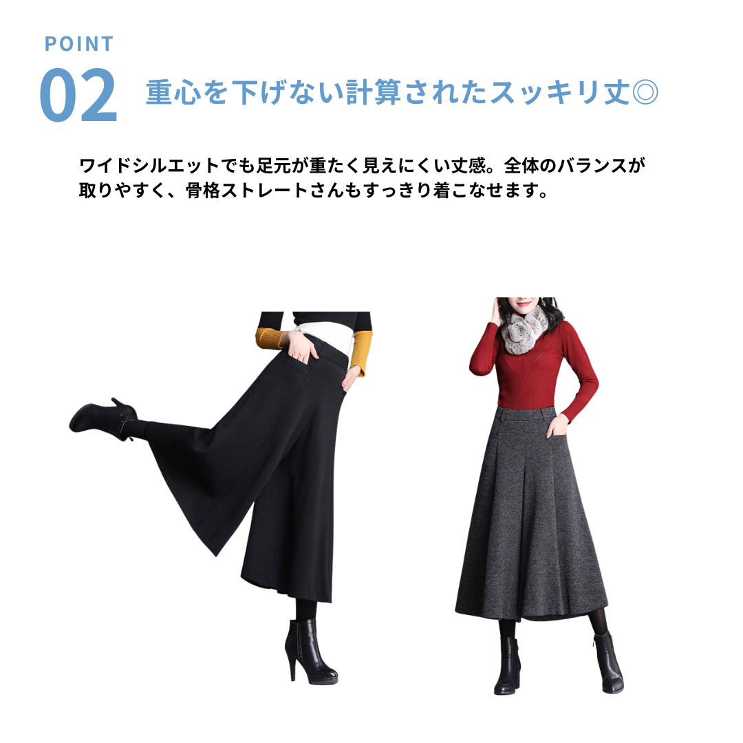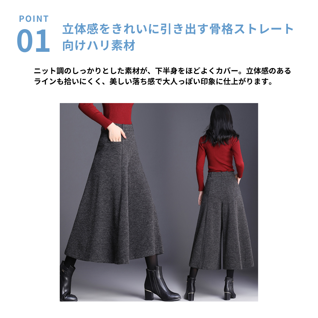 ハリのあるニット素材とミモレ丈のワイドなシルエットが、骨格ストレートさんの立体的な腰・太ももラインを自然にカバー。重心を下げすぎないデザインで、スッキリ見えと脚長効果を両立。トップスはフィット感あるニットなど、コンパクトなアイテムを合わせるのがおすすめです。