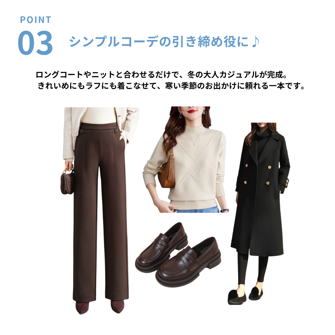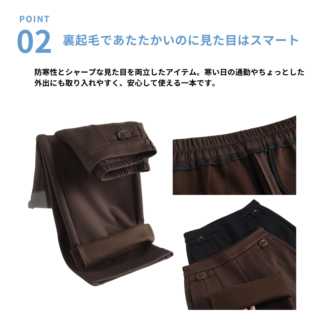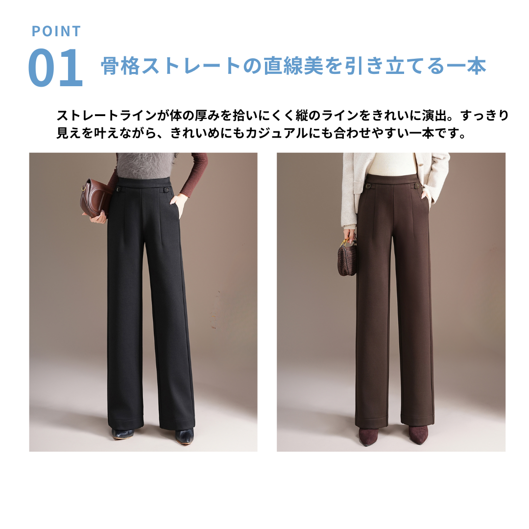 全身をすっきり見せたい骨格ストレートさんにぴったりな裏起毛ストレートレッグパンツ。脚のラインを拾いすぎないまっすぐなシルエットが、太ももやヒップの立体感をなだらかに整え、縦のラインを強調します。内側は裏起毛仕様で、冷えやすい季節も安心のはき心地。ハリ感のある素材がきちんと感を保ち、ニットやブラウスとも好相性。体型カバー・防寒・きれい見えを同時に叶える、大人の日常に頼れる一本です。