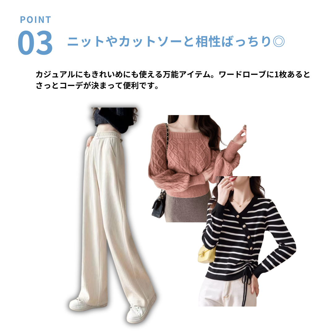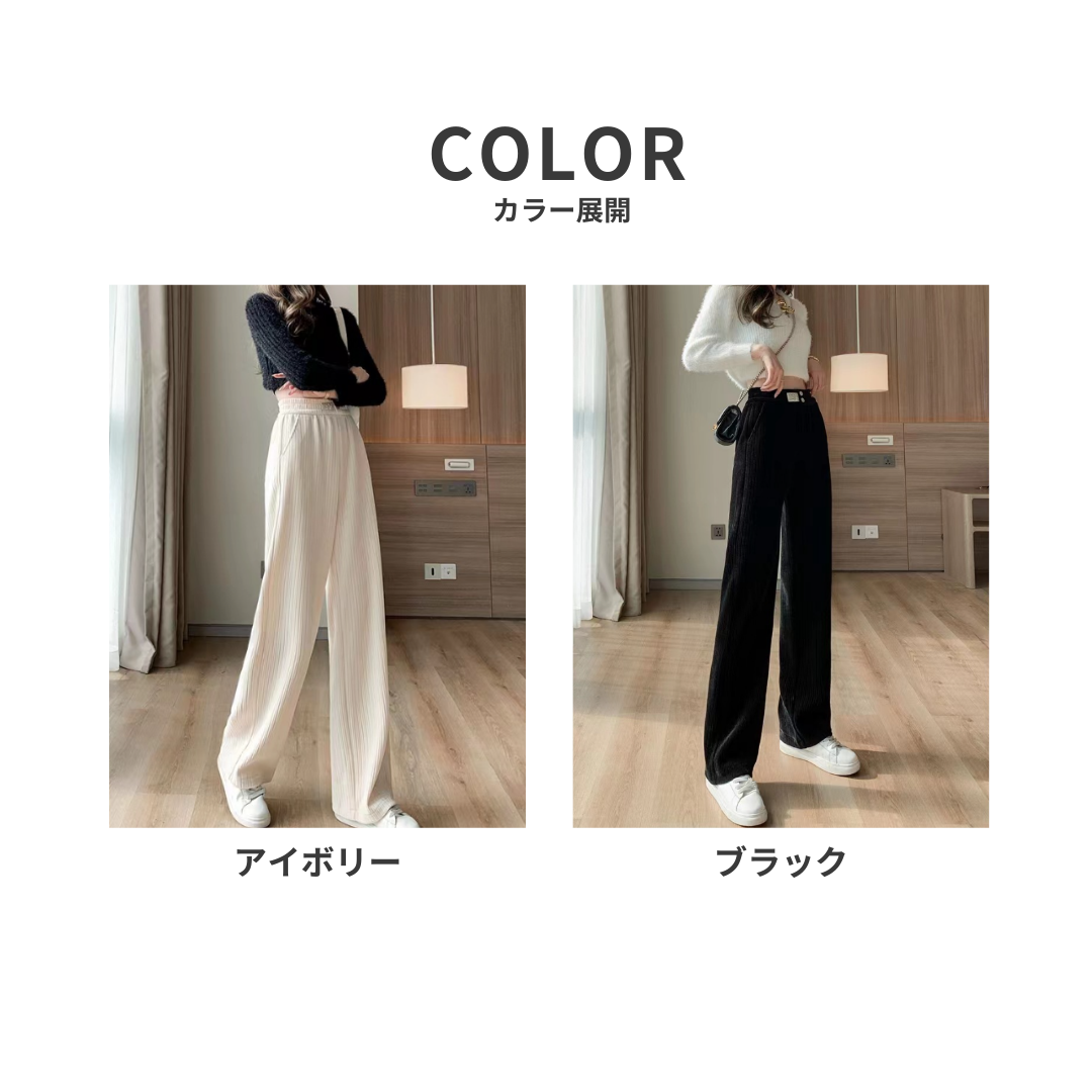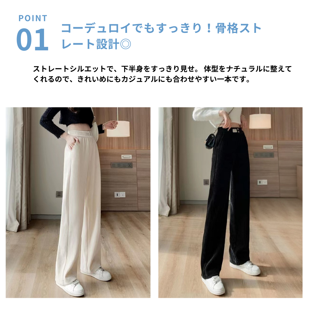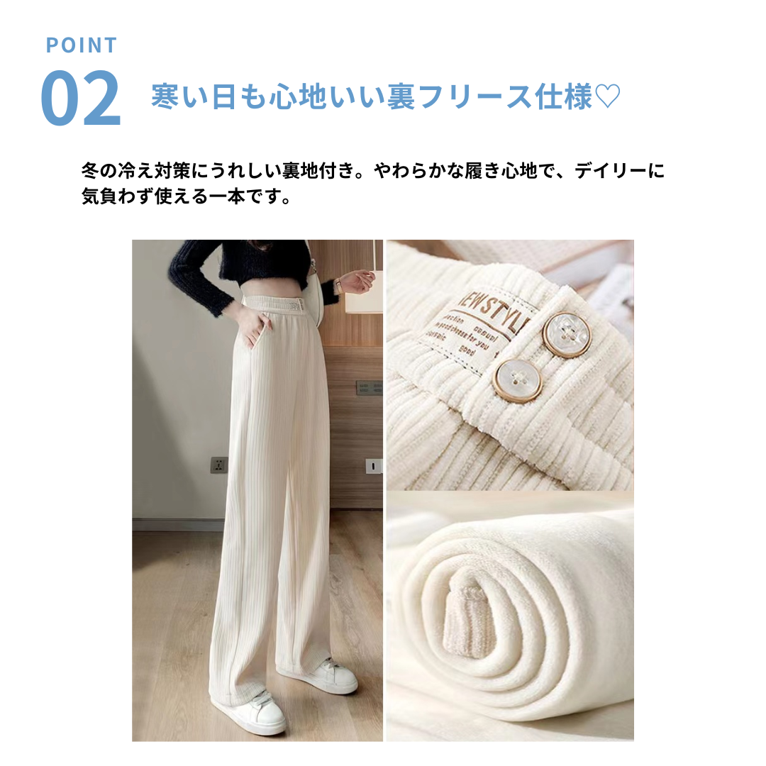 適度なハリのあるコーデュロイ素材とまっすぐなストレートラインが、骨格ストレートさんの持つメリハリあるボディを引き立てるパンツ。裏フリース仕様で防寒性も抜群。シンプルで着まわしやすく、日常のきれいめカジュアルに最適です。