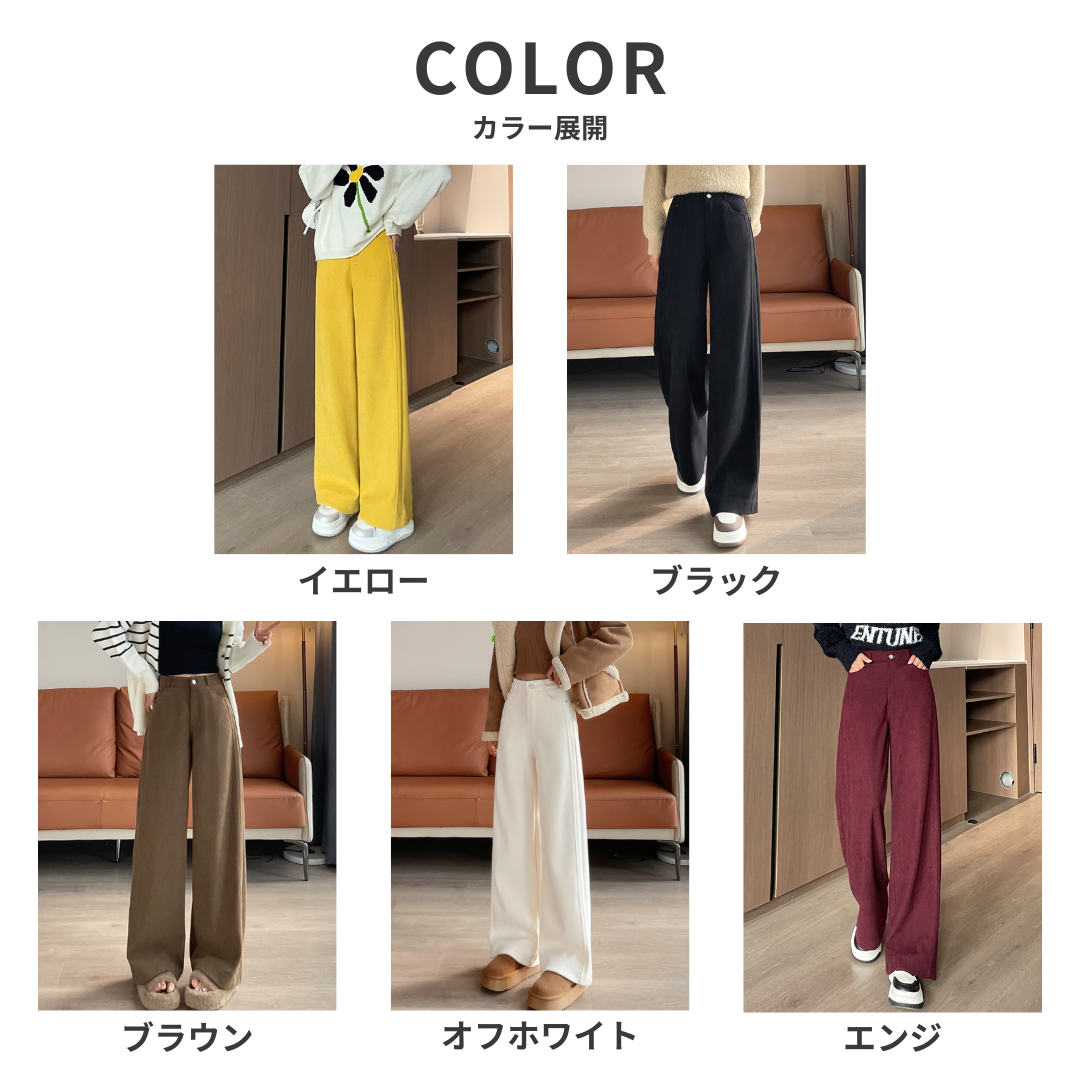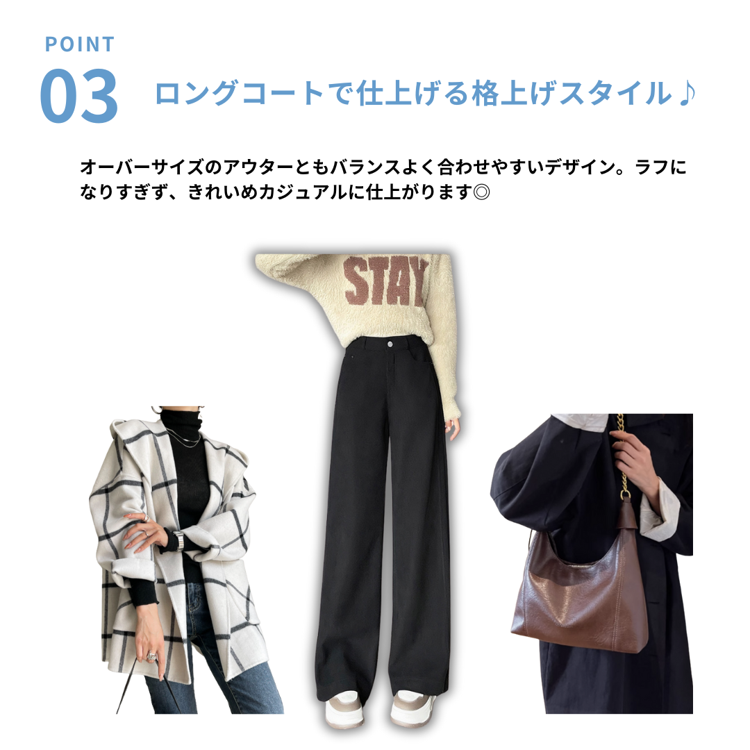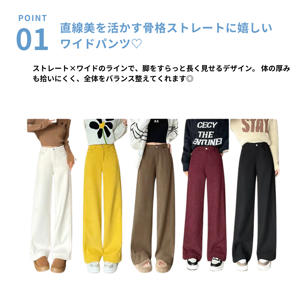 直線的なラインを活かしたい骨格ストレートさんにおすすめの一本。体の厚みを拾いにくいワイドレッグデザインと、重さを感じさせない裏起毛素材が、冬のおしゃれを快適にサポート。腰まわりのフィット感はキープしつつ、脚にかけて落ち感のある美シルエットが魅力です。
