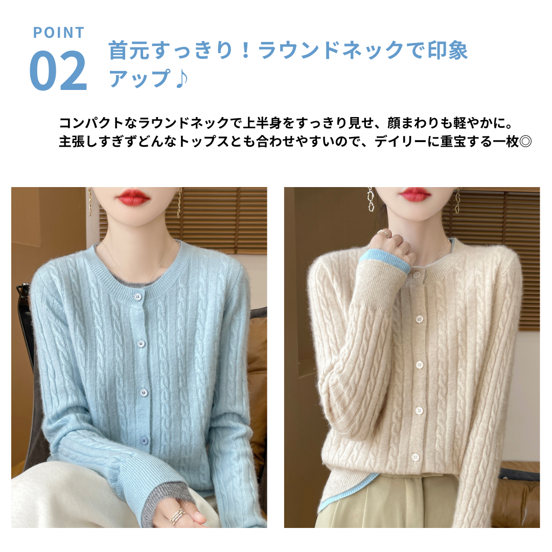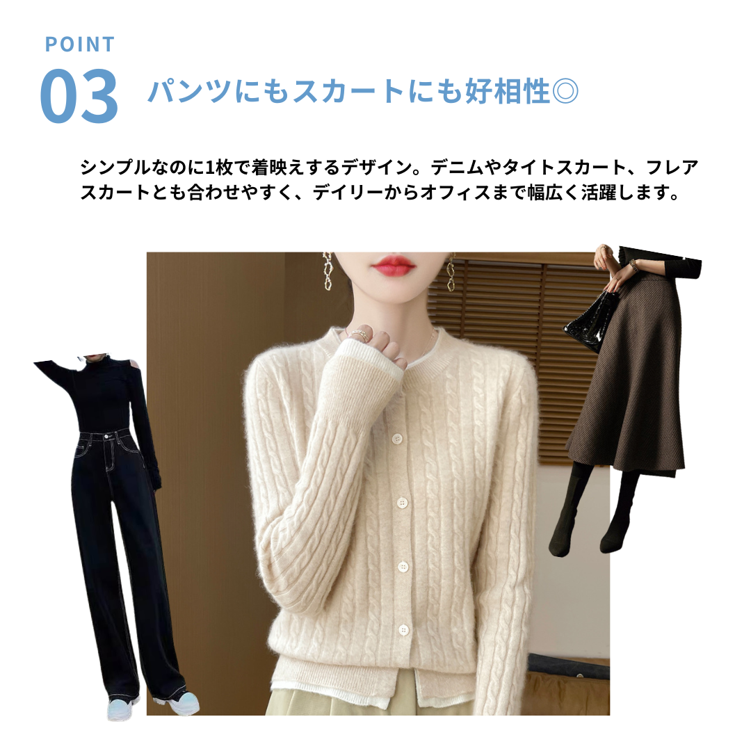 縦に流れるケーブル編みと、体に程よく沿うシルエットが骨ストさんにマッチするレイヤードトップス。凹凸の出すぎない編み柄とラウンドネックのすっきりした首元が、上半身をコンパクトに見せてくれます。裾から覗くレイヤードデザインがさりげないアクセントになり、シンプルながら一枚で着映え。スカートにもパンツにも合わせやすく、きれいめからデイリーまで幅広く活躍します。