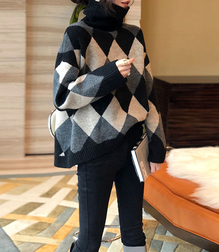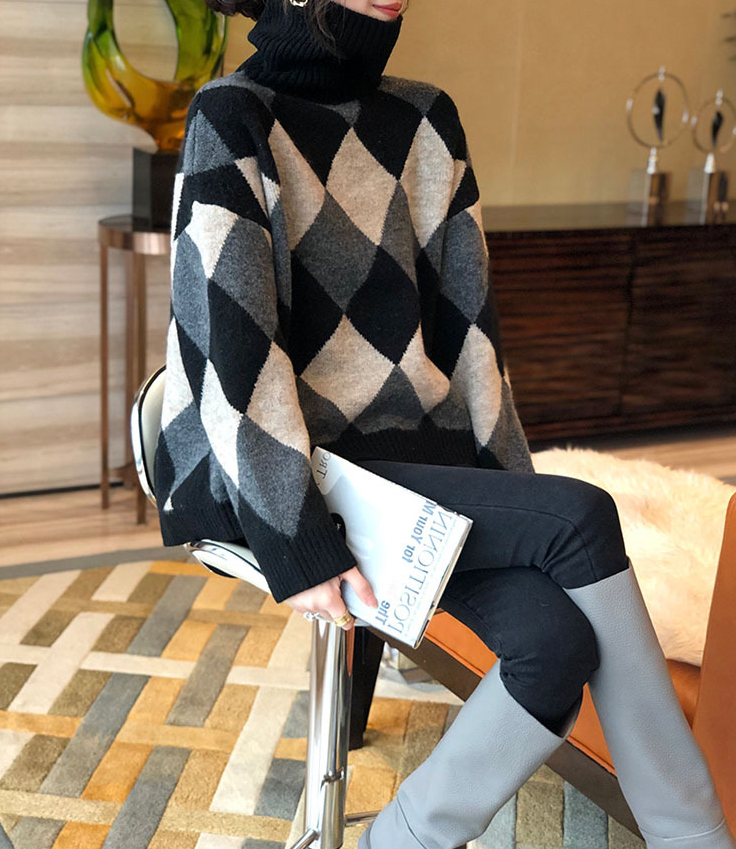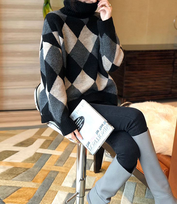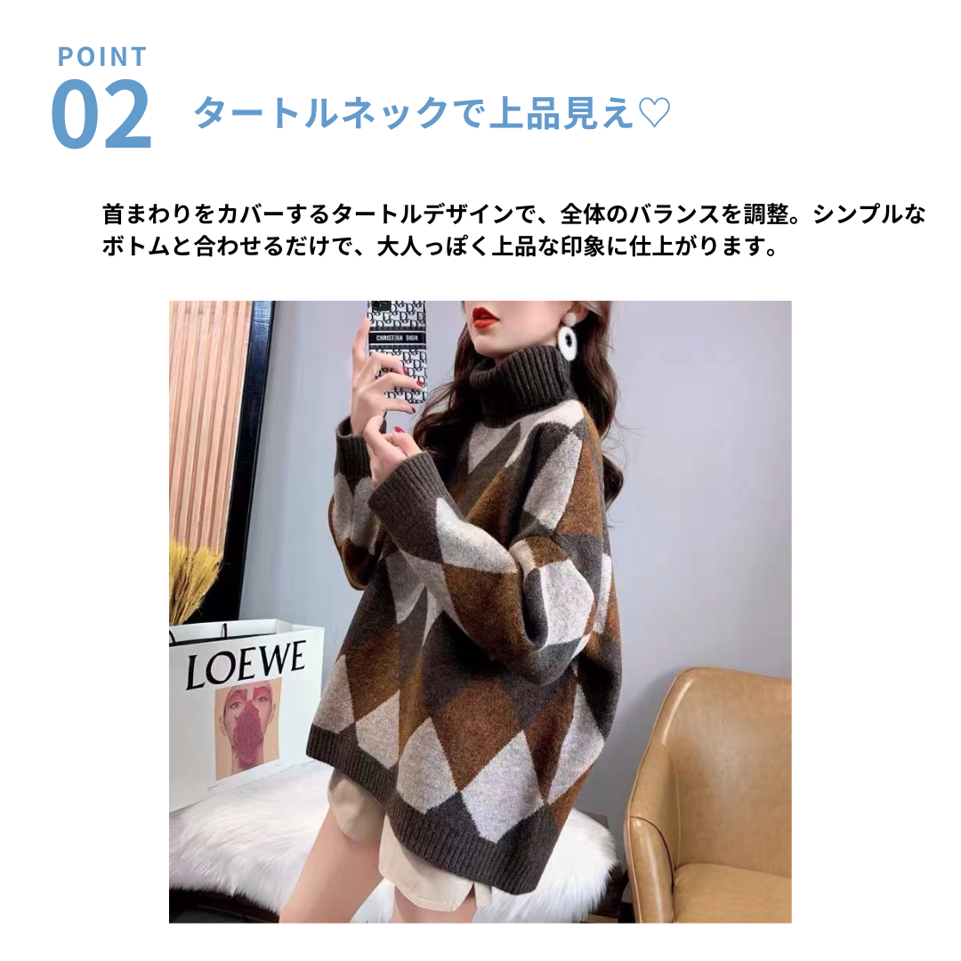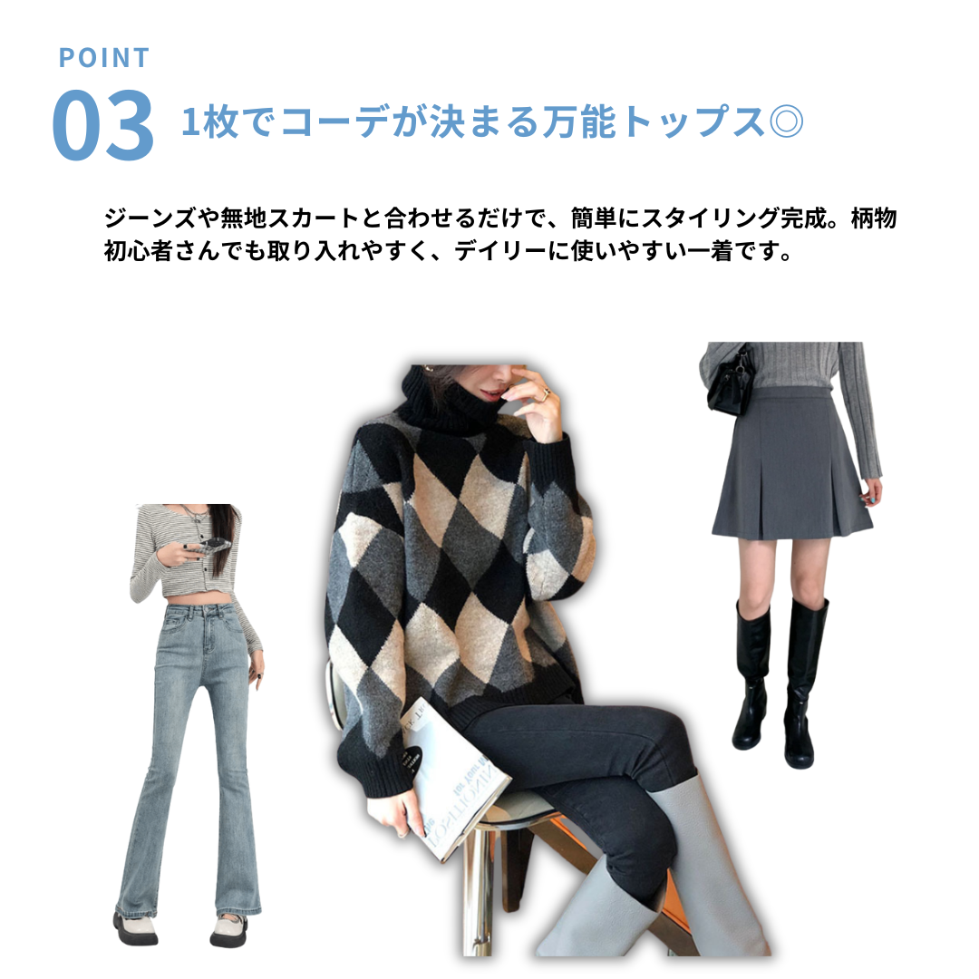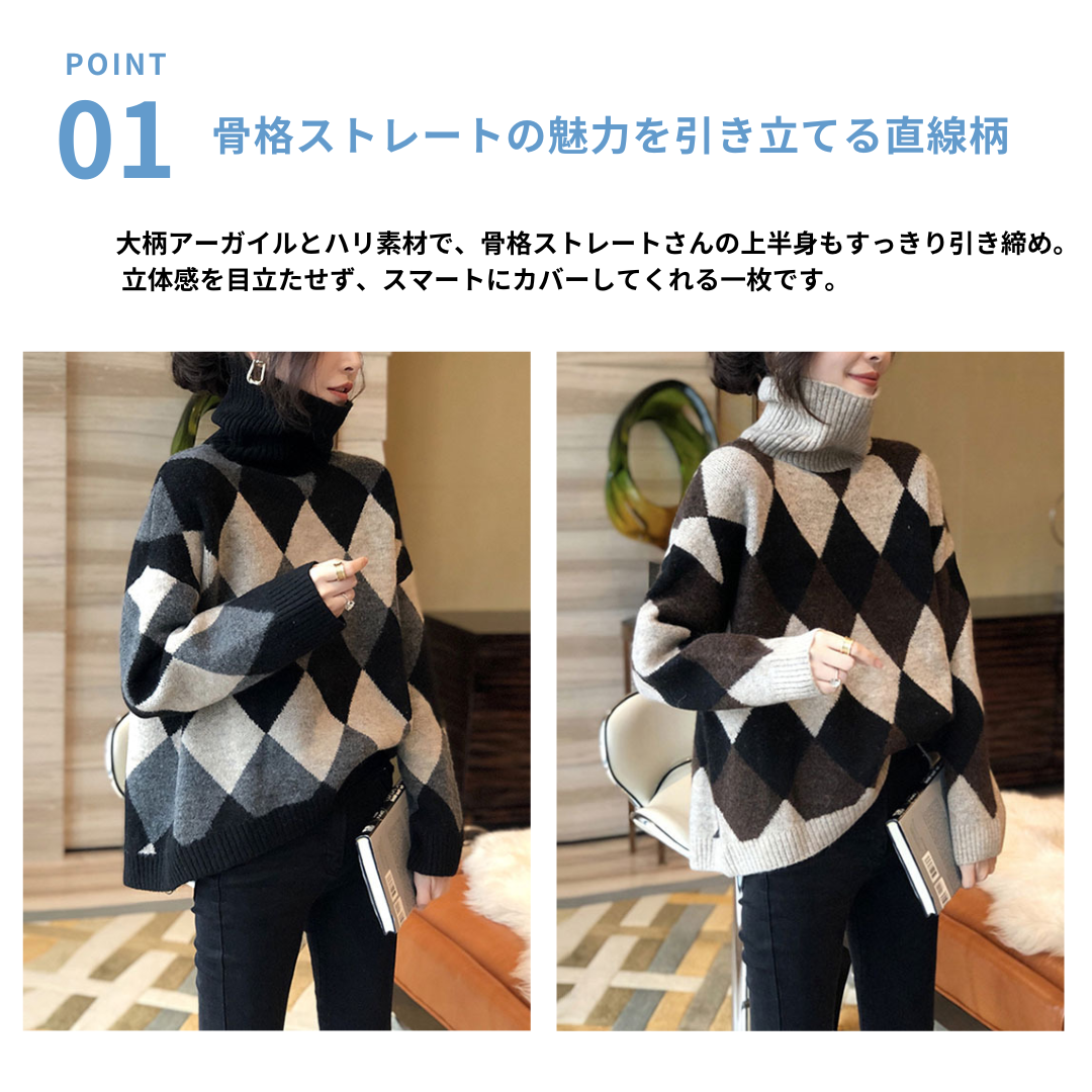 骨格ストレートさんの上半身をすっきり見せてくれる、大柄アーガイルニット。直線的な柄が上半身の立体感を引き締め、すっきりとした印象に。タートルネックで首元をカバーしながら、上品な存在感をプラス。1枚で映える、体型悩みを感じさせない万能トップスです。