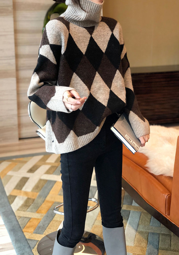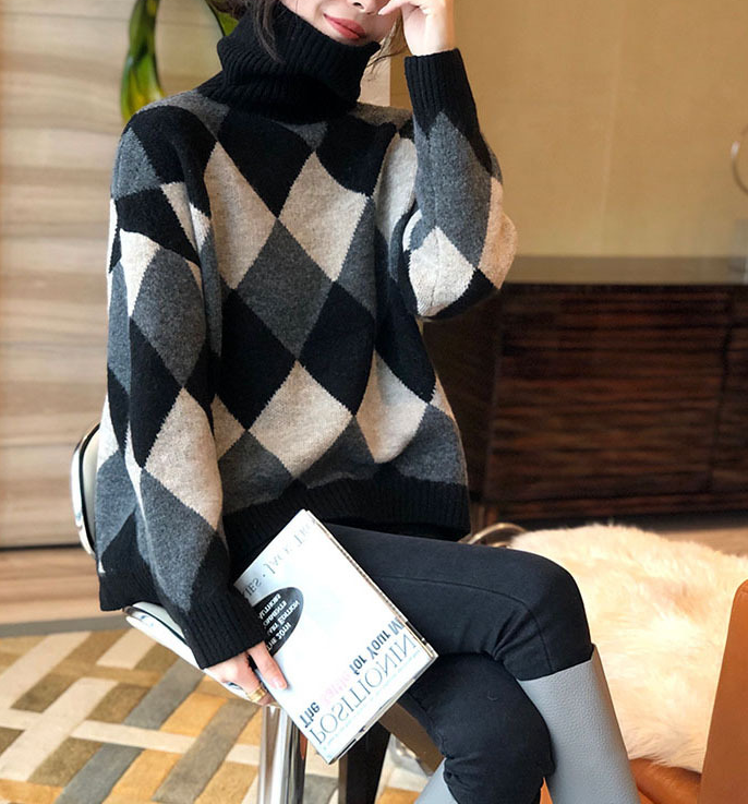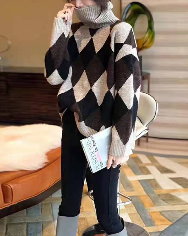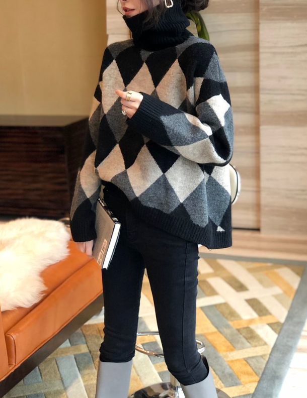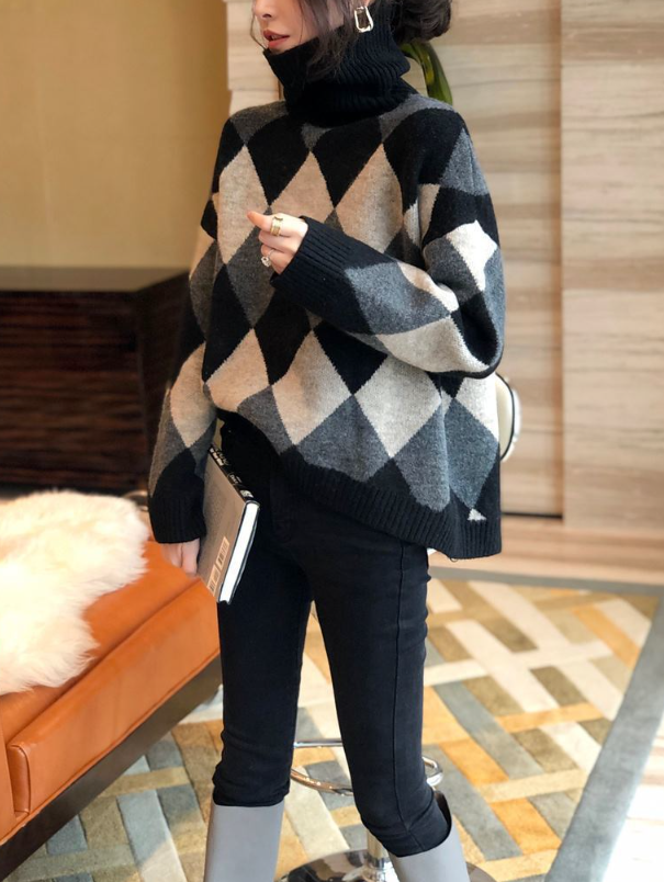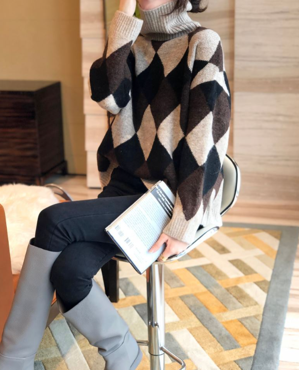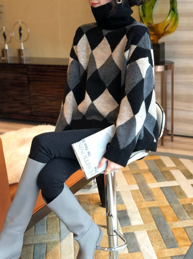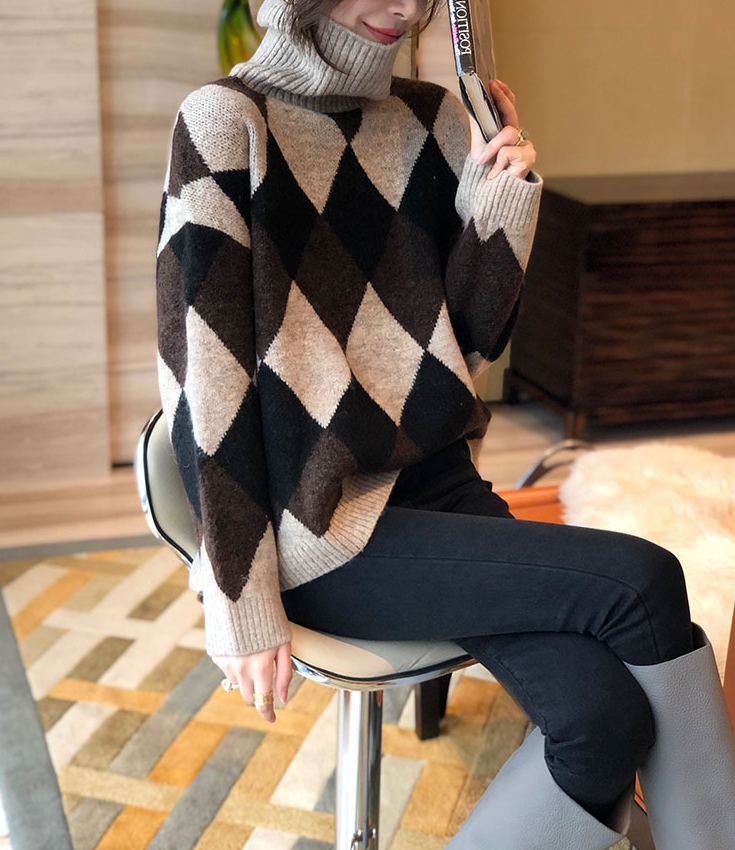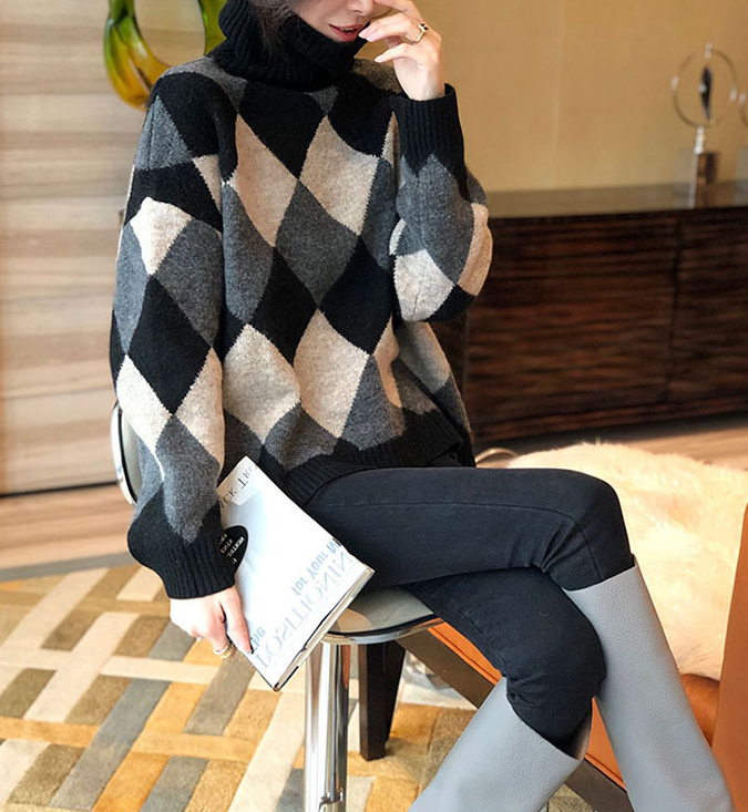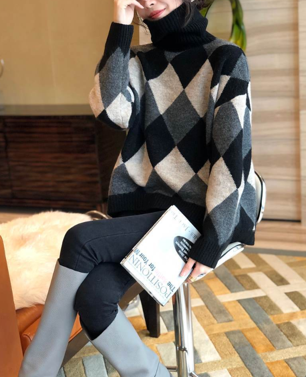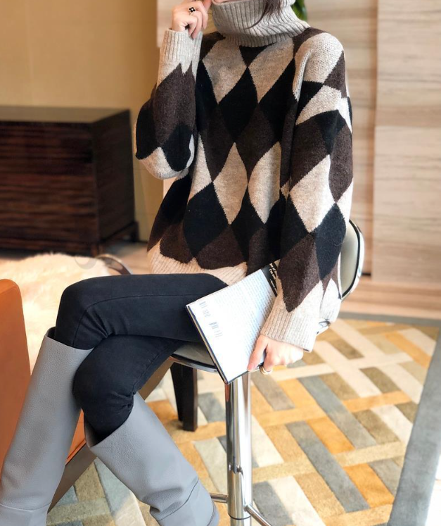 骨格ストレートさんの上半身をすっきり見せてくれる、大柄アーガイルニット。直線的な柄が上半身の立体感を引き締め、すっきりとした印象に。タートルネックで首元をカバーしながら、上品な存在感をプラス。1枚で映える、体型悩みを感じさせない万能トップスです。