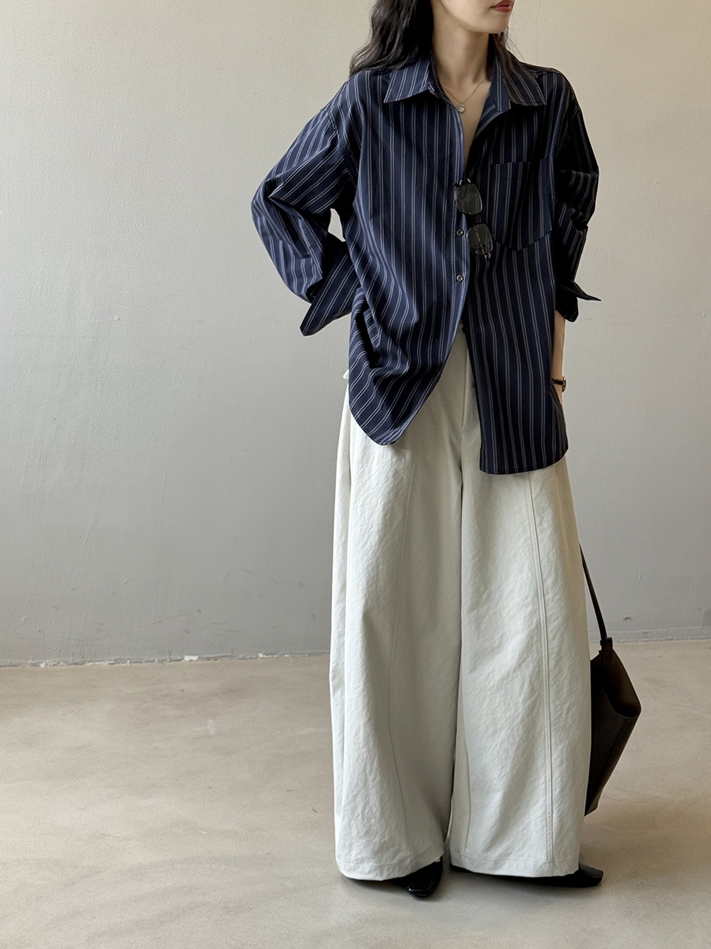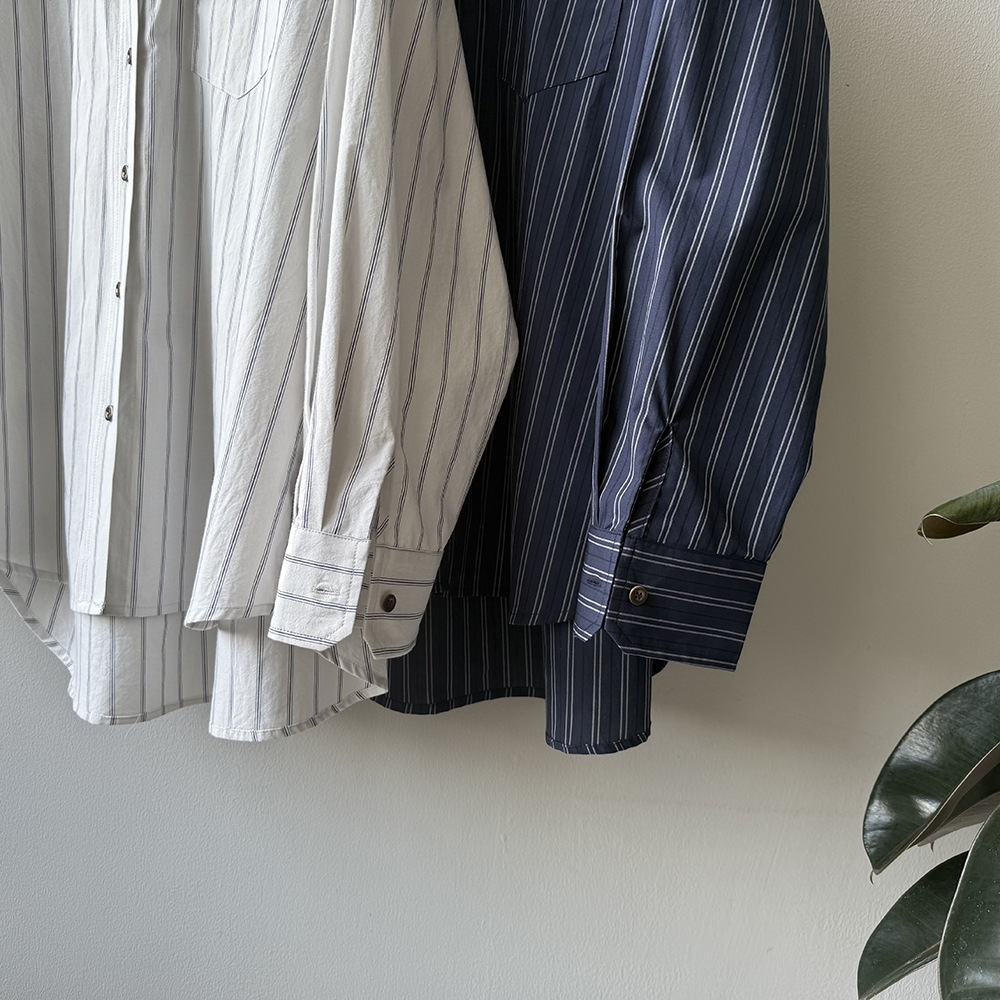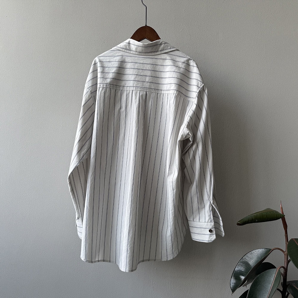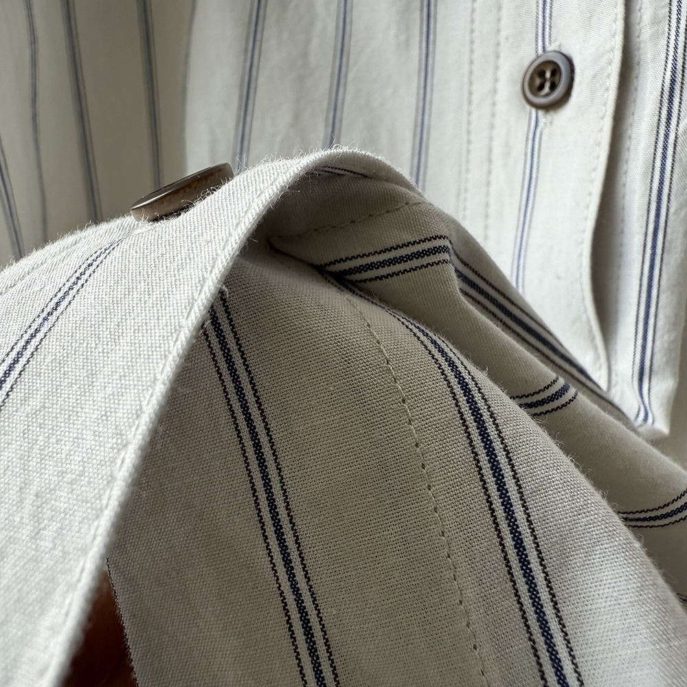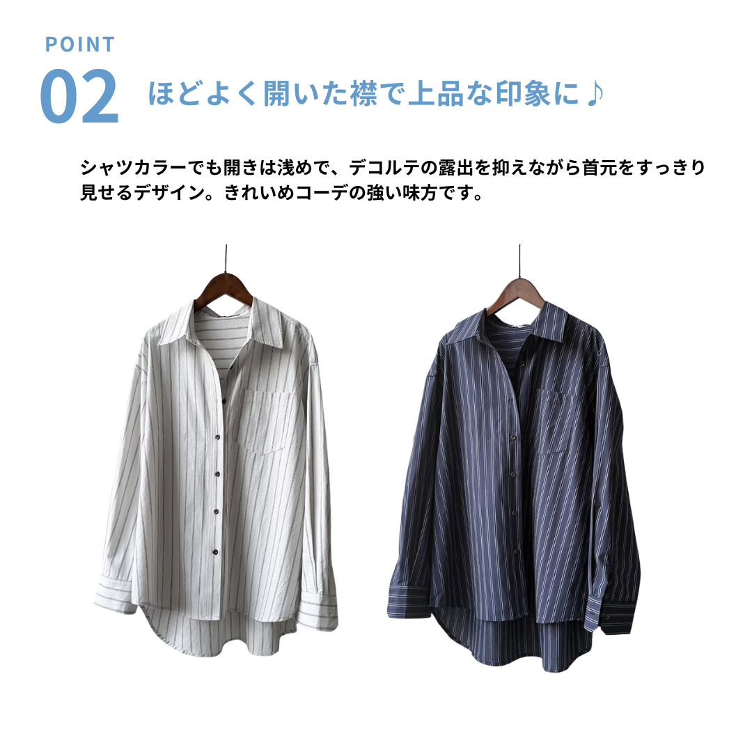 直線的なシルエットが得意な骨格ストレートさんにぴったりのストライプシャツ。程よいハリ感とストンと落ちるラインで、上半身の厚みをすっきり見せながらスタイルアップ。開きすぎない襟元で首回りもきれいに見え、ボタンを開けて羽織としても使える着回し力の高い一着です。