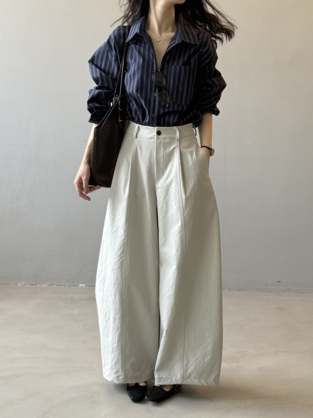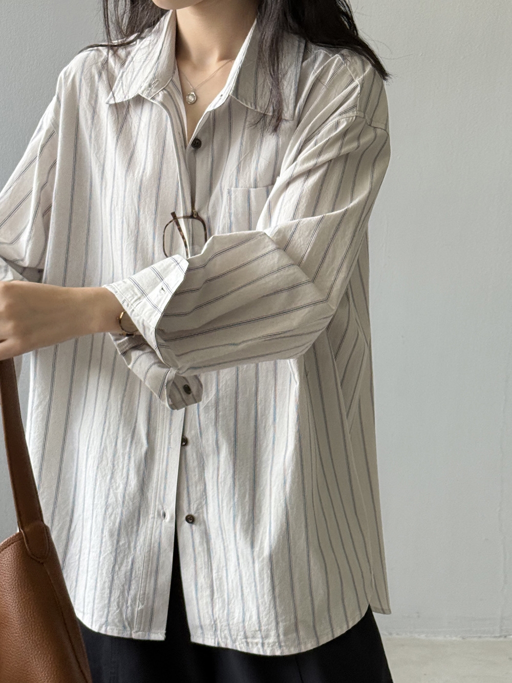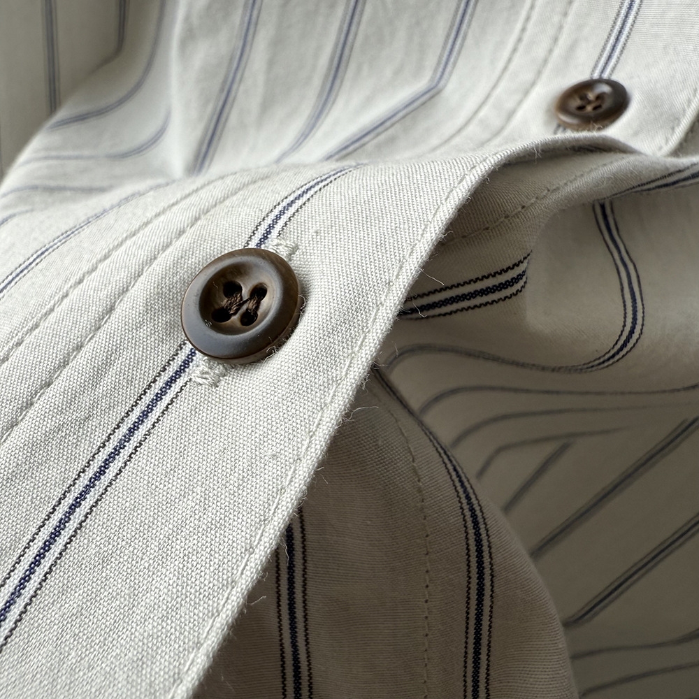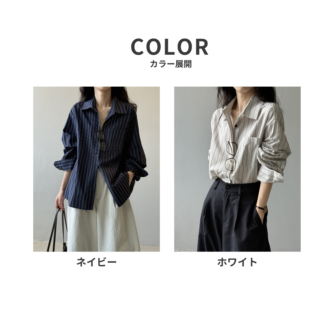 直線的なシルエットが得意な骨格ストレートさんにぴったりのストライプシャツ。程よいハリ感とストンと落ちるラインで、上半身の厚みをすっきり見せながらスタイルアップ。開きすぎない襟元で首回りもきれいに見え、ボタンを開けて羽織としても使える着回し力の高い一着です。