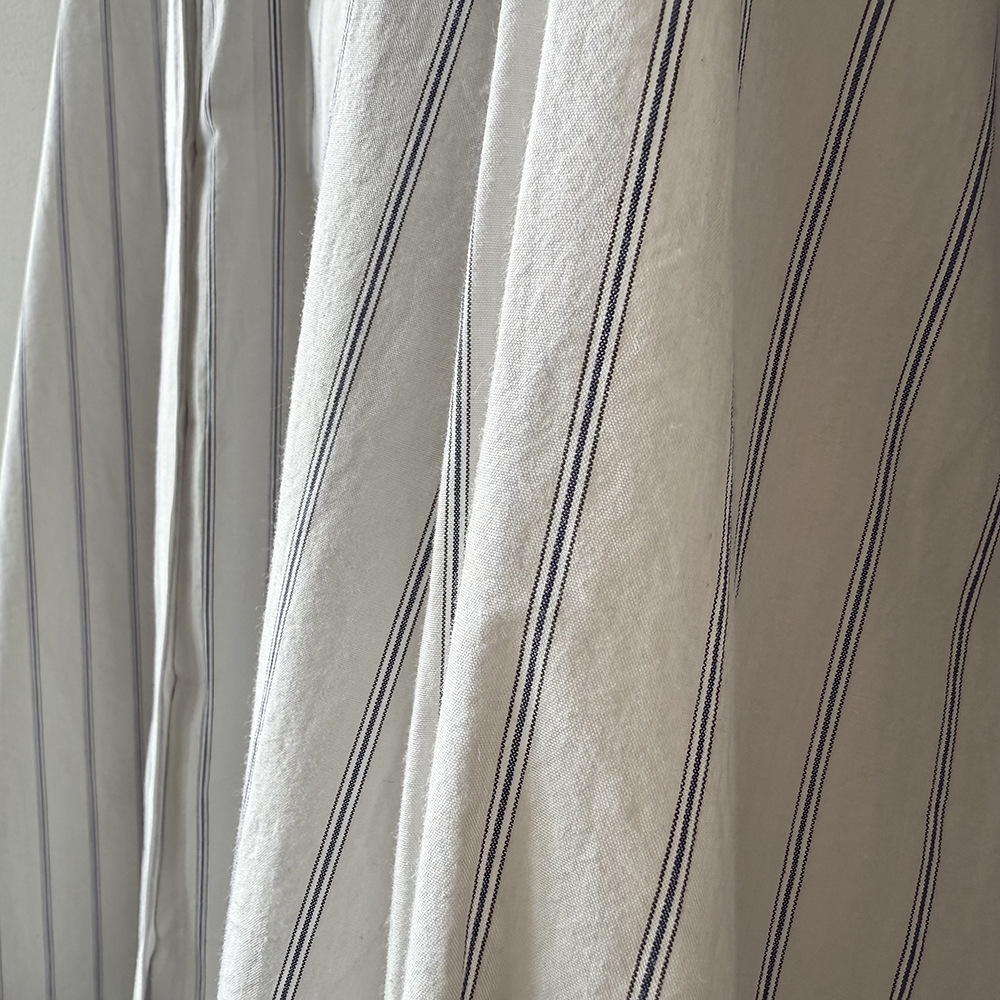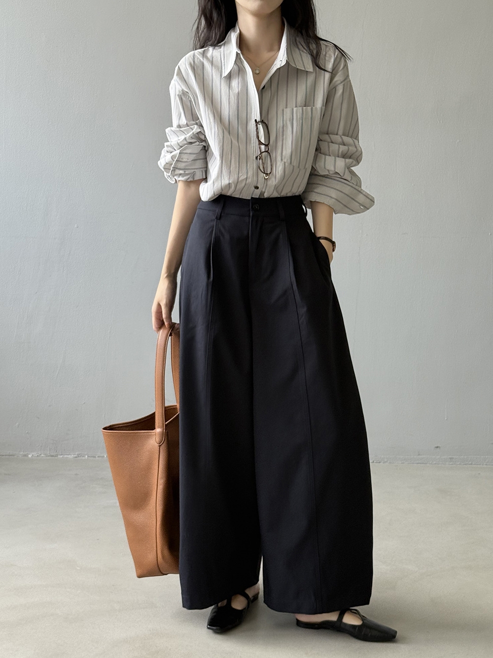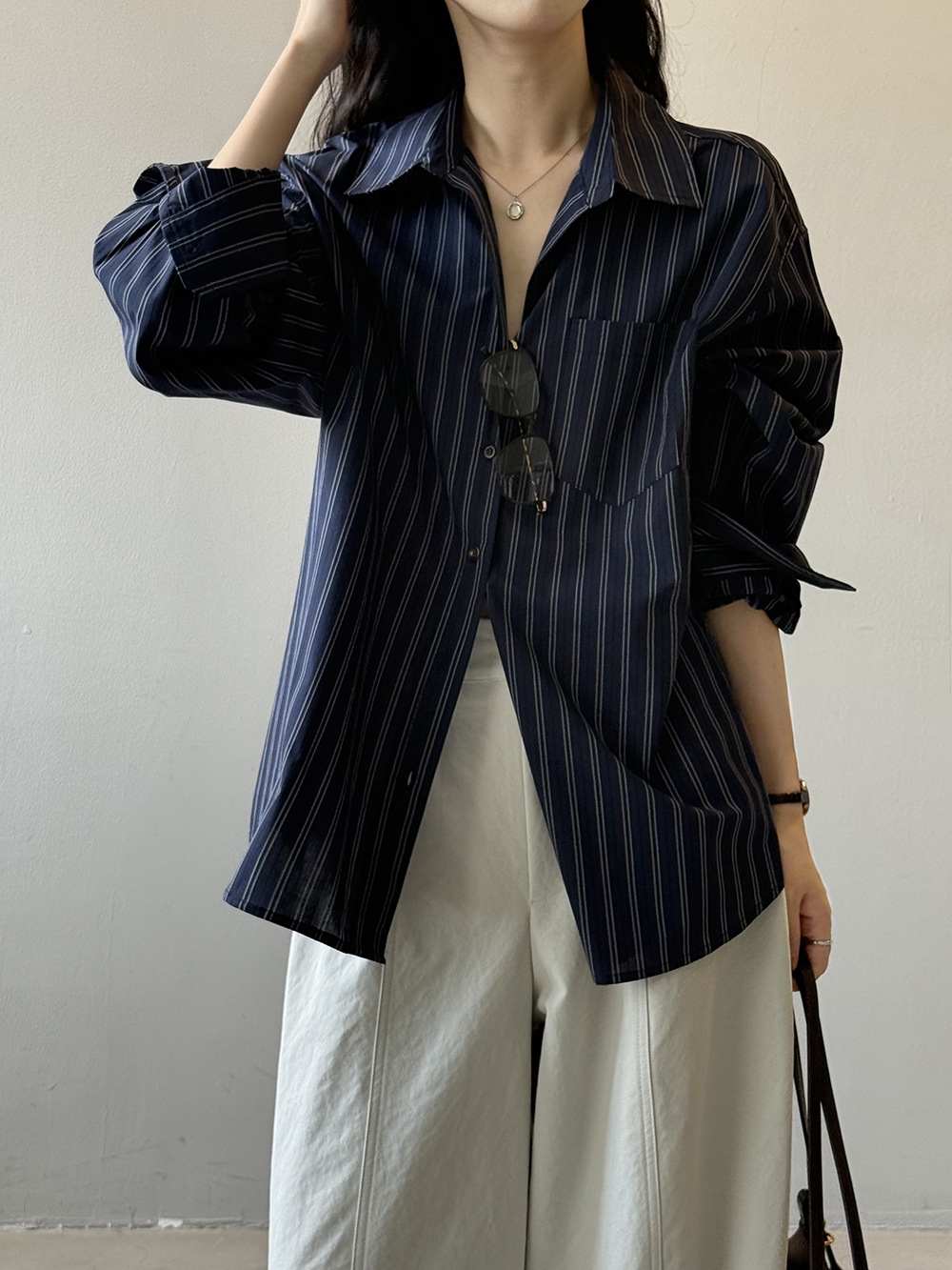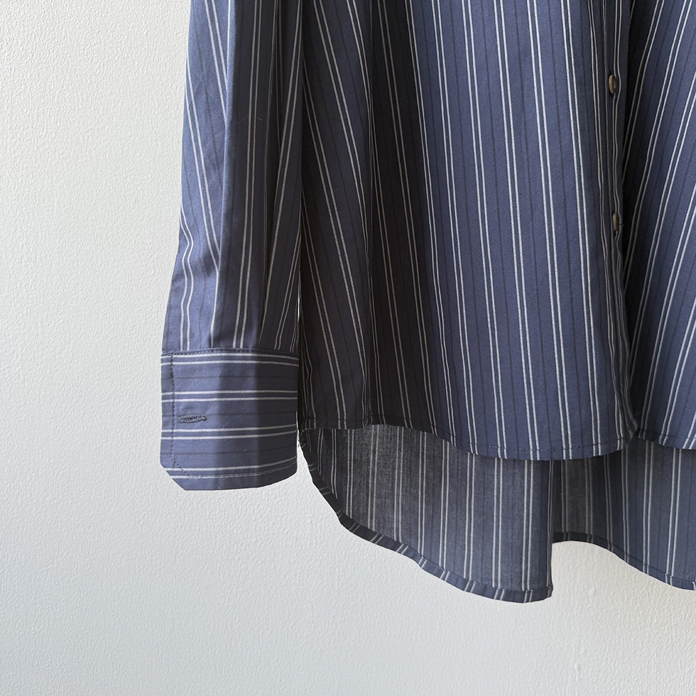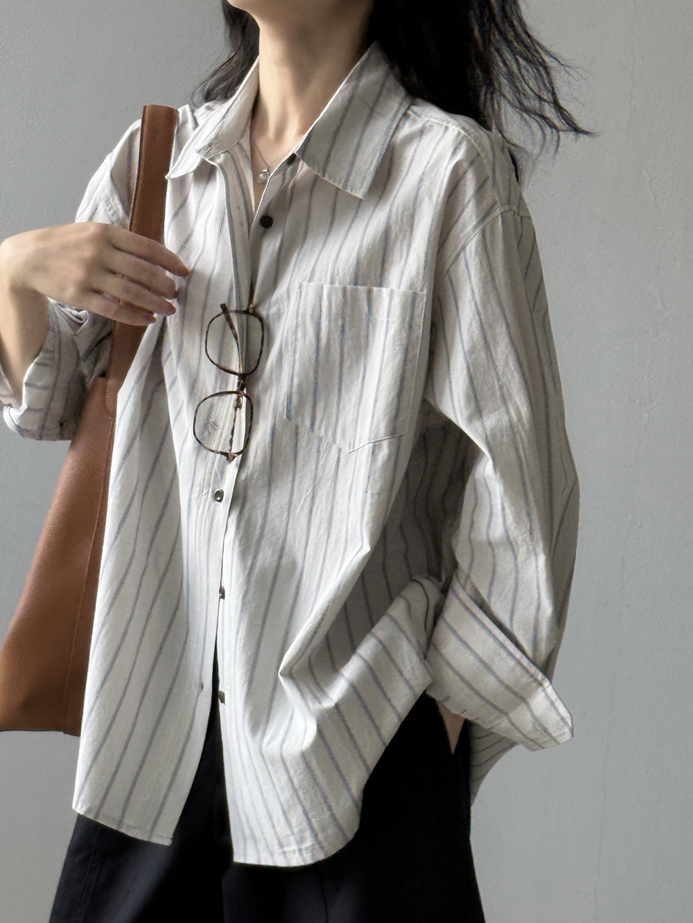 直線的なシルエットが得意な骨格ストレートさんにぴったりのストライプシャツ。程よいハリ感とストンと落ちるラインで、上半身の厚みをすっきり見せながらスタイルアップ。開きすぎない襟元で首回りもきれいに見え、ボタンを開けて羽織としても使える着回し力の高い一着です。