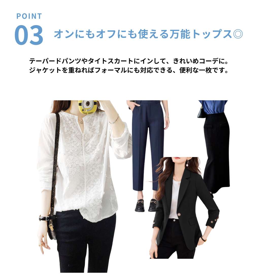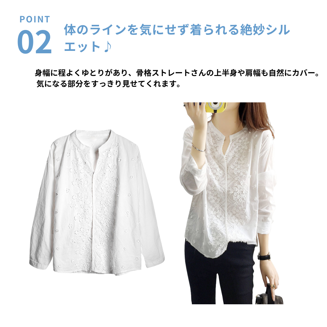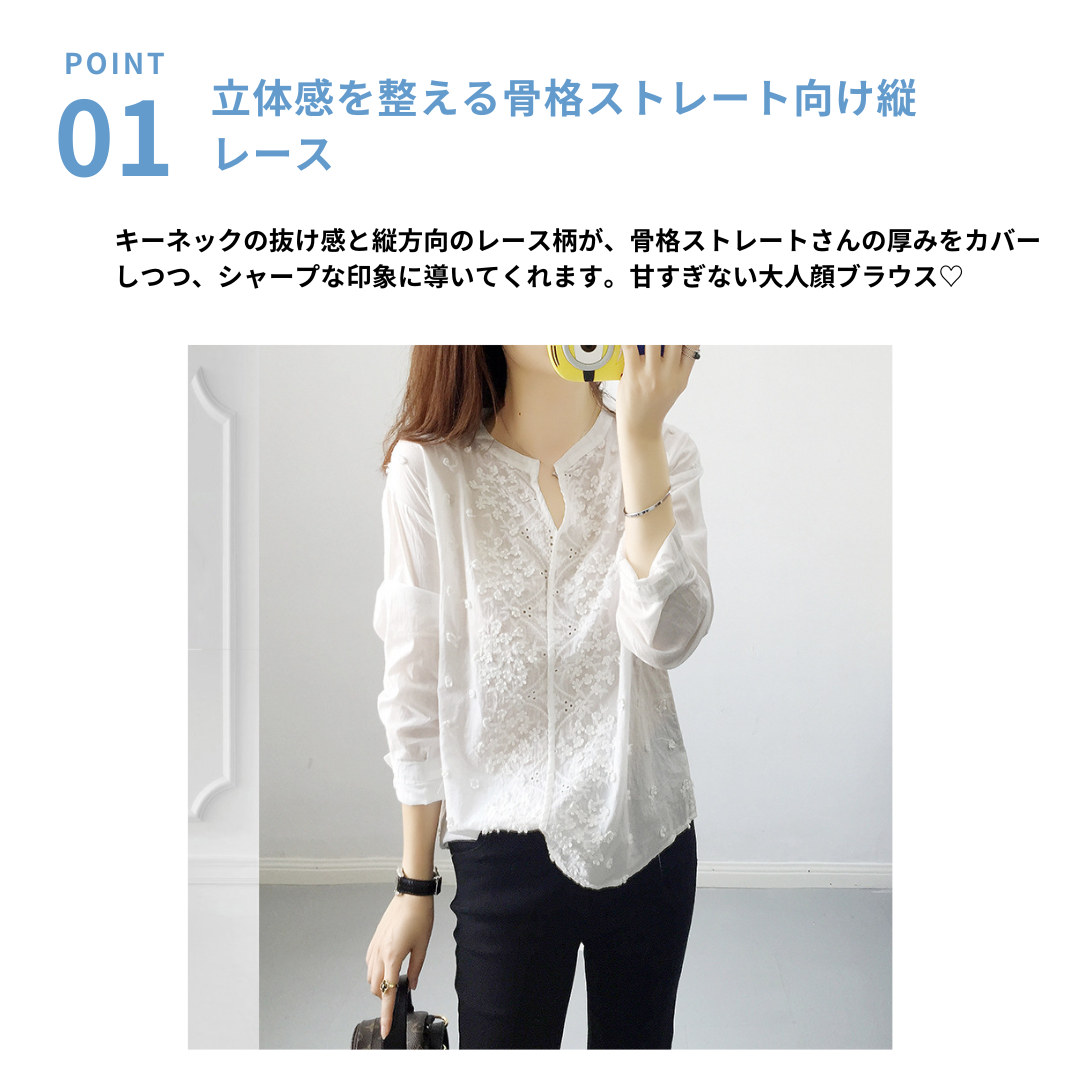 すっきりとしたキーネックと縦のラインを意識したデザインが、骨格ストレートさんの立体的な体型に映えるレースブラウス。甘さを抑えた繊細なレース使いで、上半身をシャープに見せながら上品な印象に仕上げます。身幅は程よくゆとりがあり、体のラインを拾いすぎないのもポイント。一枚で着映えしつつ、ジャケットのインナーとしても使いやすく、通勤からきれいめなお出かけまで活躍する一着です。